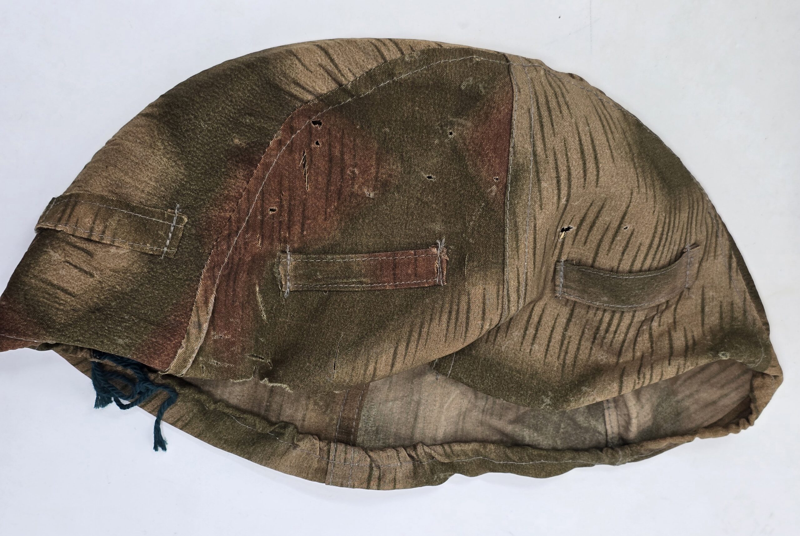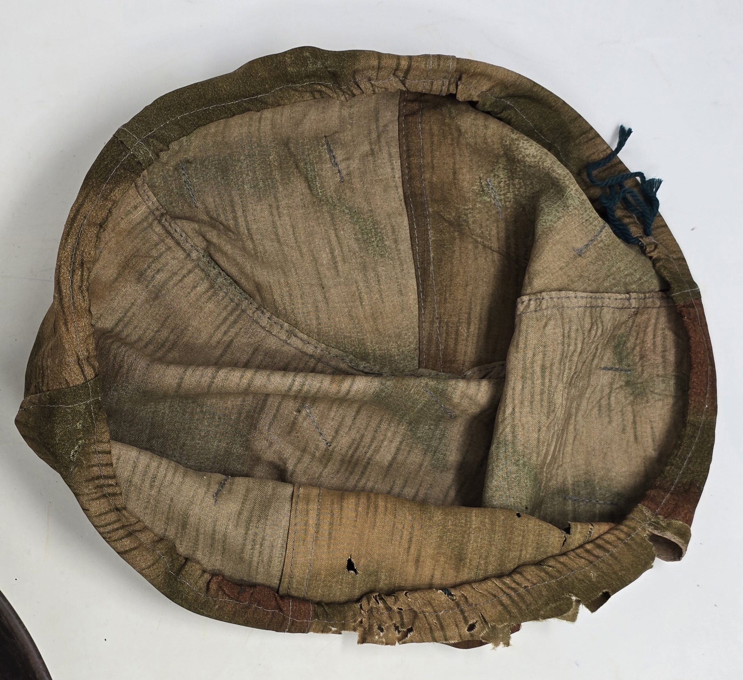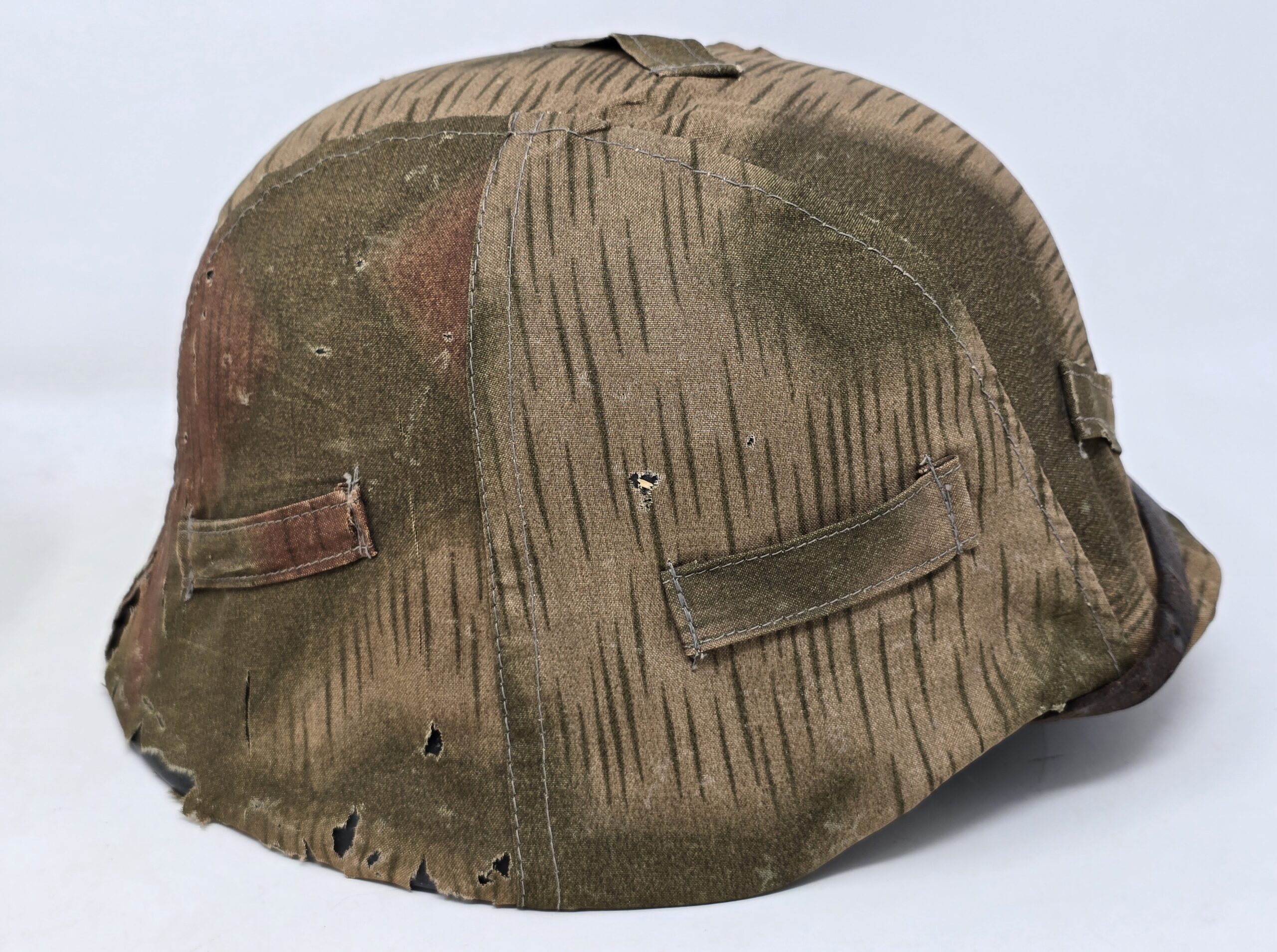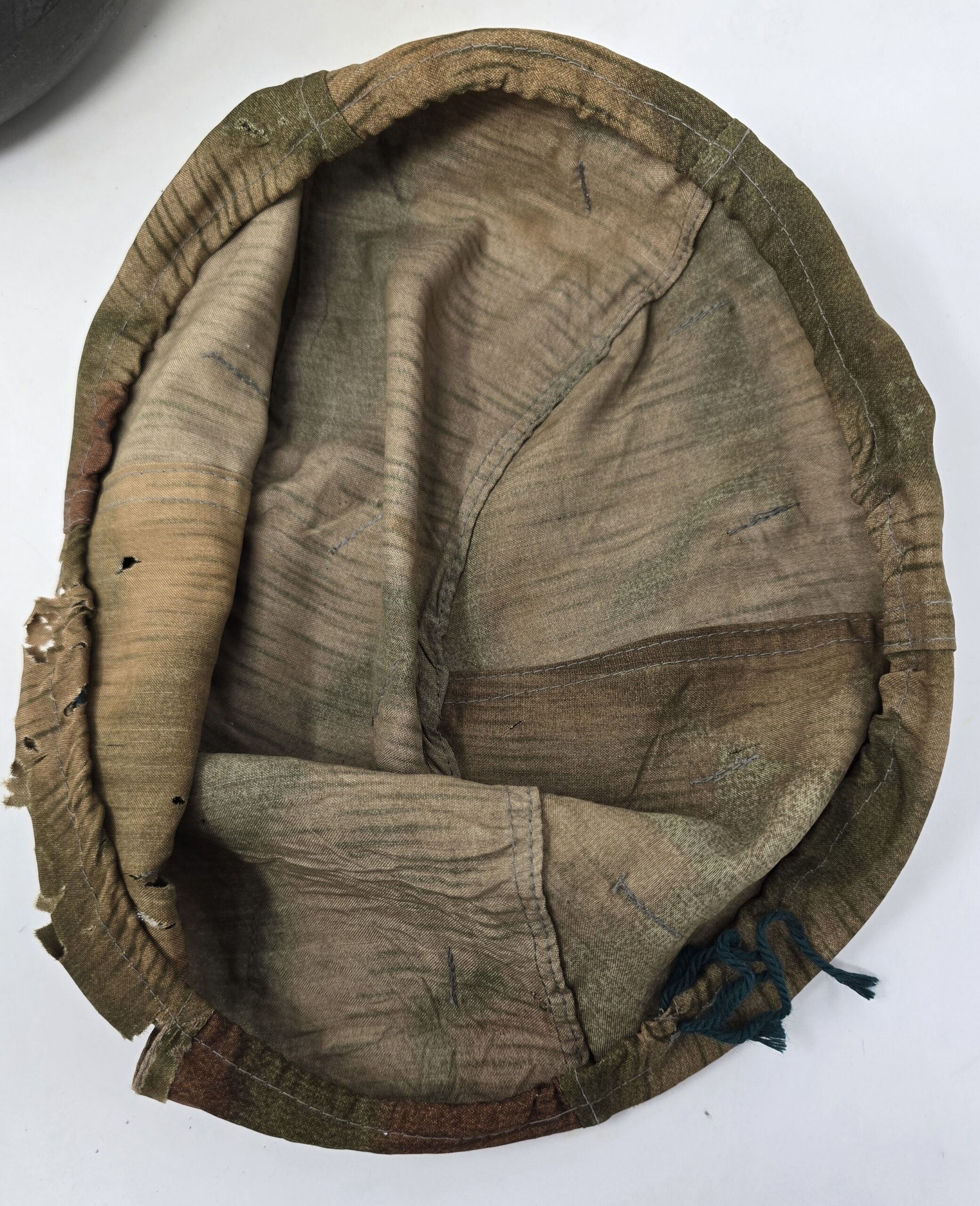 This fine ensemble comes from a very advanced and discriminating collector. The helmet is a Q-64 M40, #1147, with rough schiefergrau overpaint, covering the tricolor, but leaving the Adler decal exposed. This decal is a “bigfoot,” Quist. The liner and strap are complete and show strong service use. Evidence of white camo (whitewash?) is visible under the grey topcoat, and creates an overall ‘chalky’ appearance. I at first assumed it was scrubbed whitewash overpaint, but noticed that the white is actually peeking out from under little chips and chunks in the schiefergrau. A very cool, original feature. To top this off, the cover is a perfect, lightly service used, likely field made, water pattern camo cover, completely original and very untouched. A power set for the Heer combat collection / display. COA accompanies.