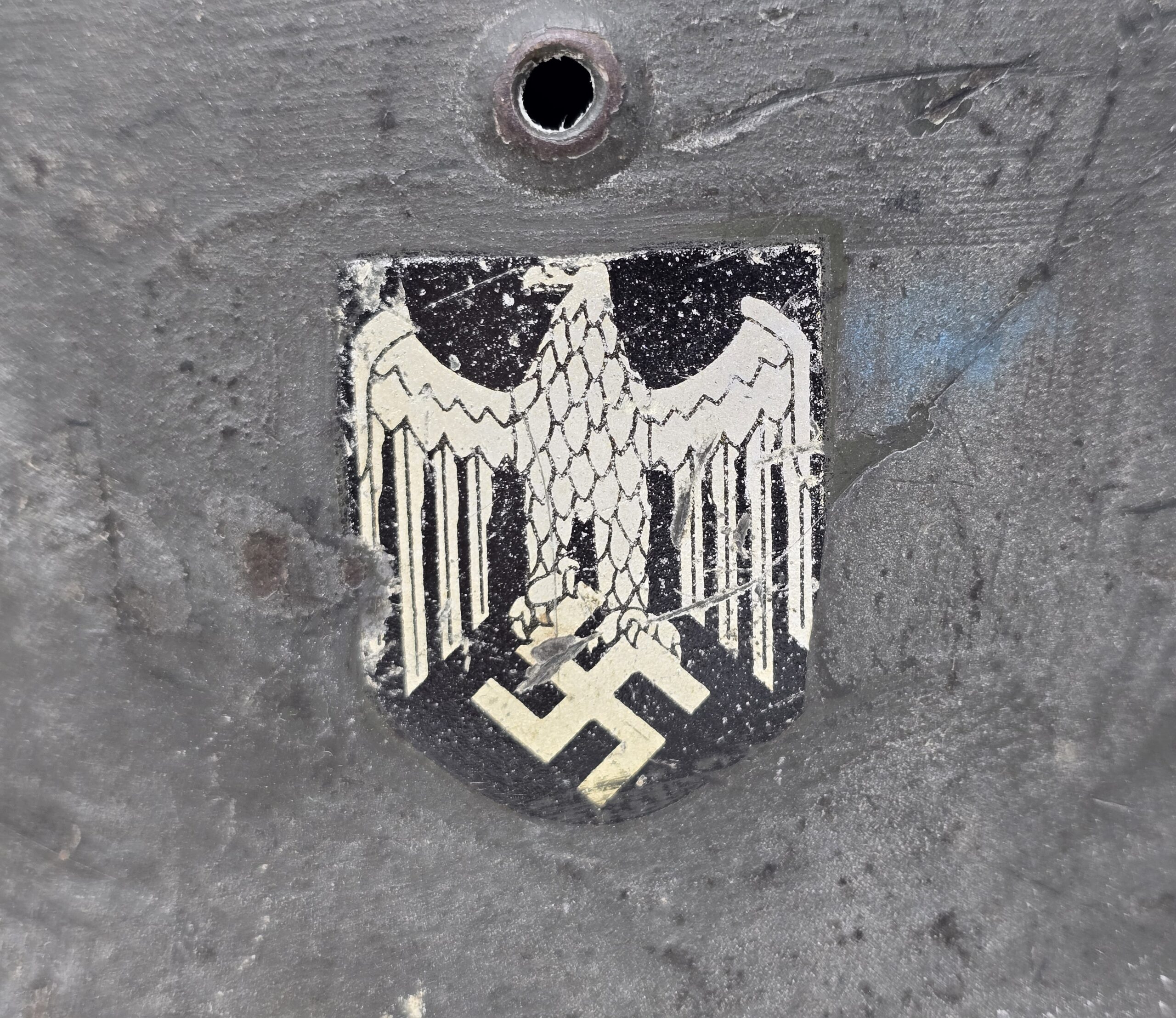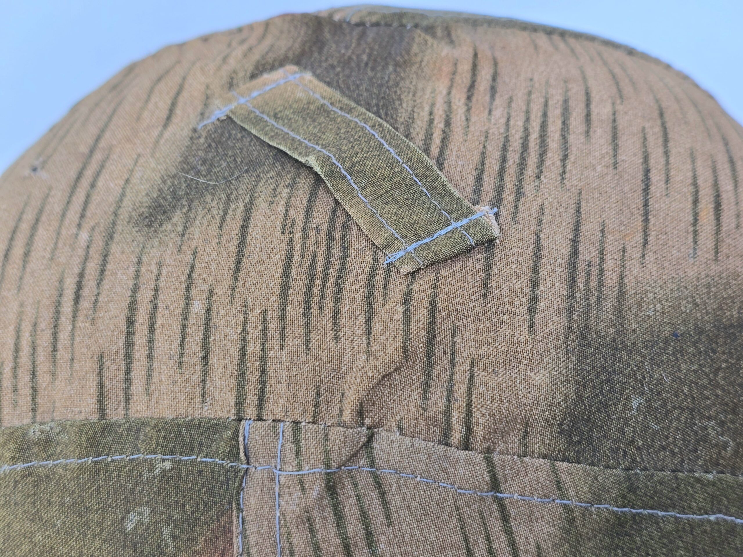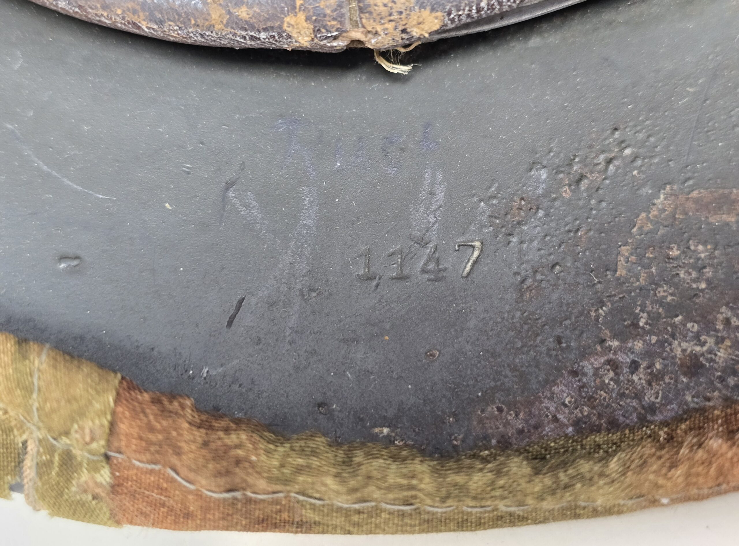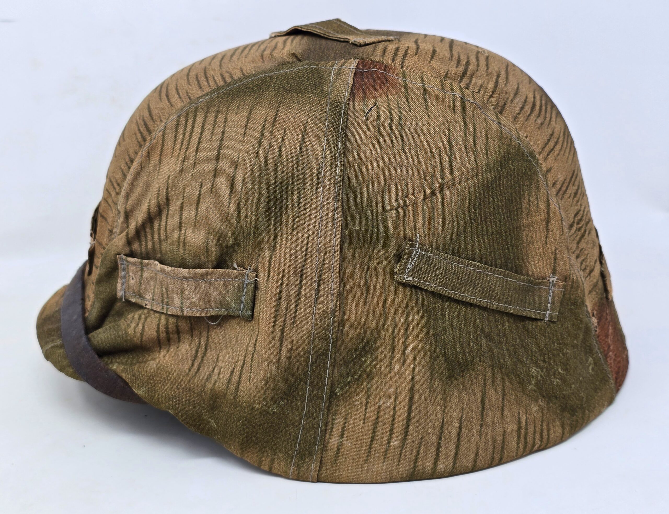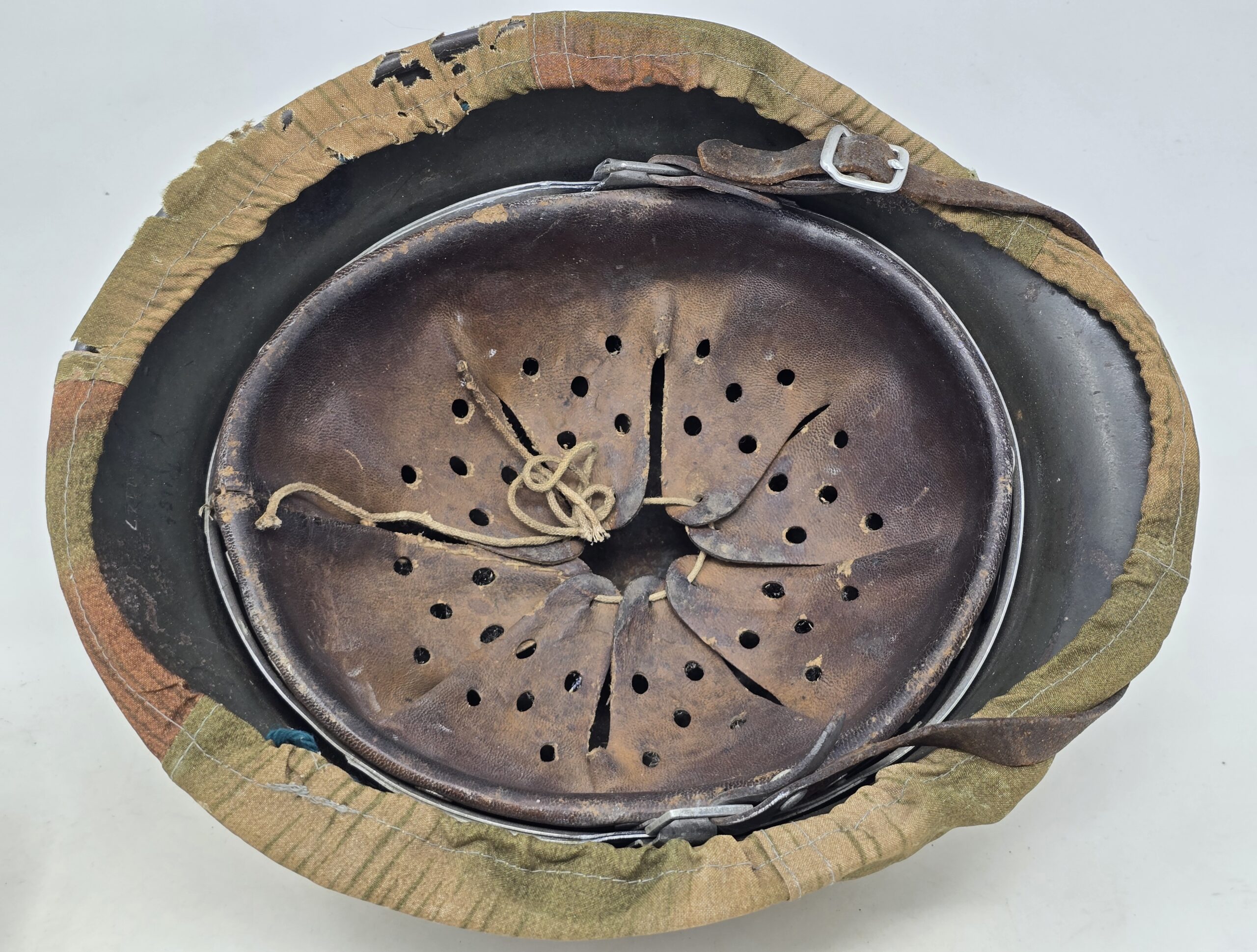 This fine ensemble comes from a very advanced and discriminating collector. The helmet is a Q-64 M40, #1147, with rough schiefergrau overpaint, covering the tricolor, but leaving the Adler decal exposed. This decal is a “bigfoot,” Quist. The liner and strap are complete and show strong service use. Evidence of white camo (whitewash?) is visible under the grey topcoat, and creates an overall ‘chalky’ appearance. I at first assumed it was scrubbed whitewash overpaint, but noticed that the white is actually peeking out from under little chips and chunks in the schiefergrau. A very cool, original feature. To top this off, the cover is a perfect, lightly service used, likely field made, water pattern camo cover, completely original and very untouched. A power set for the Heer combat collection / display. COA accompanies.