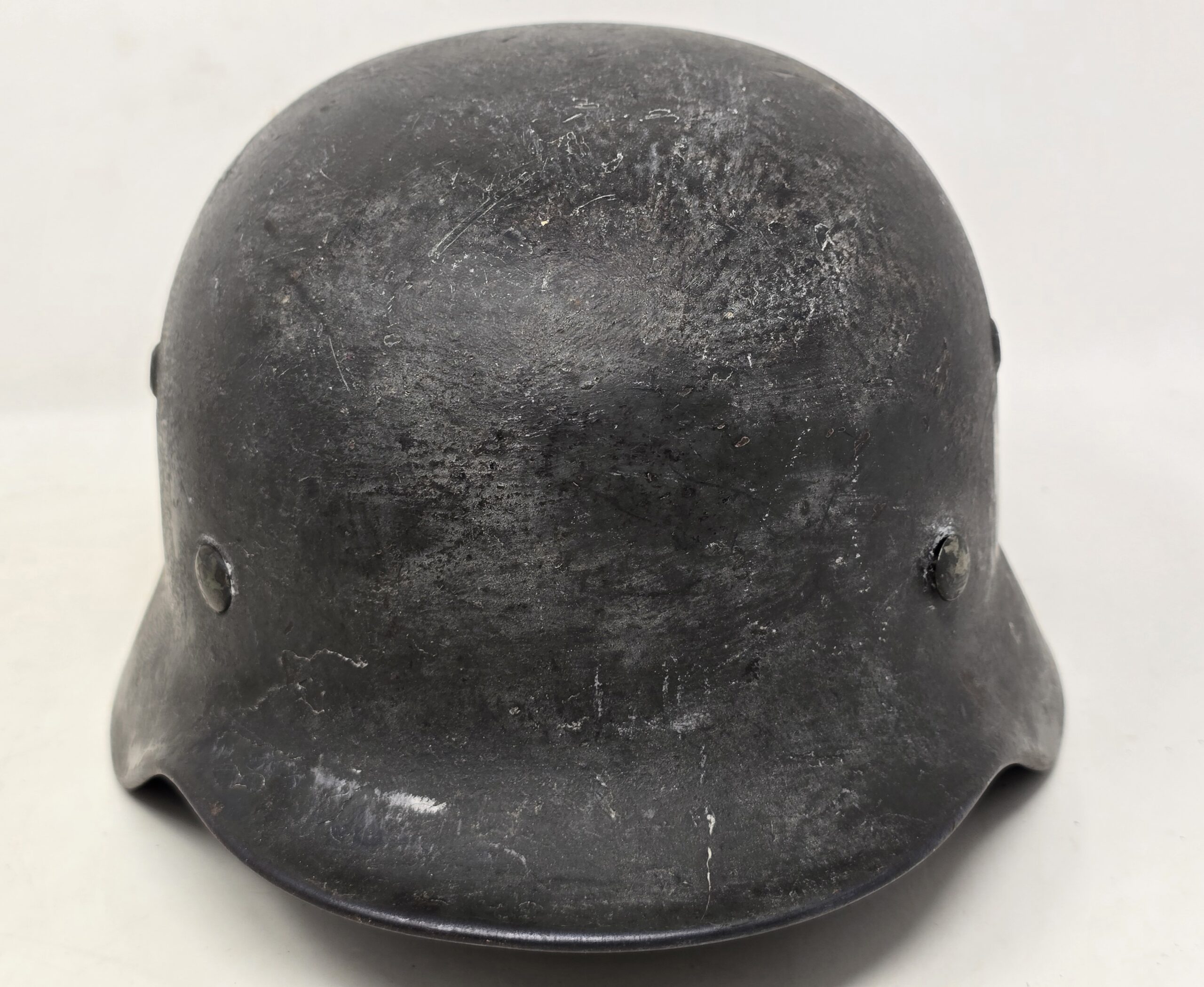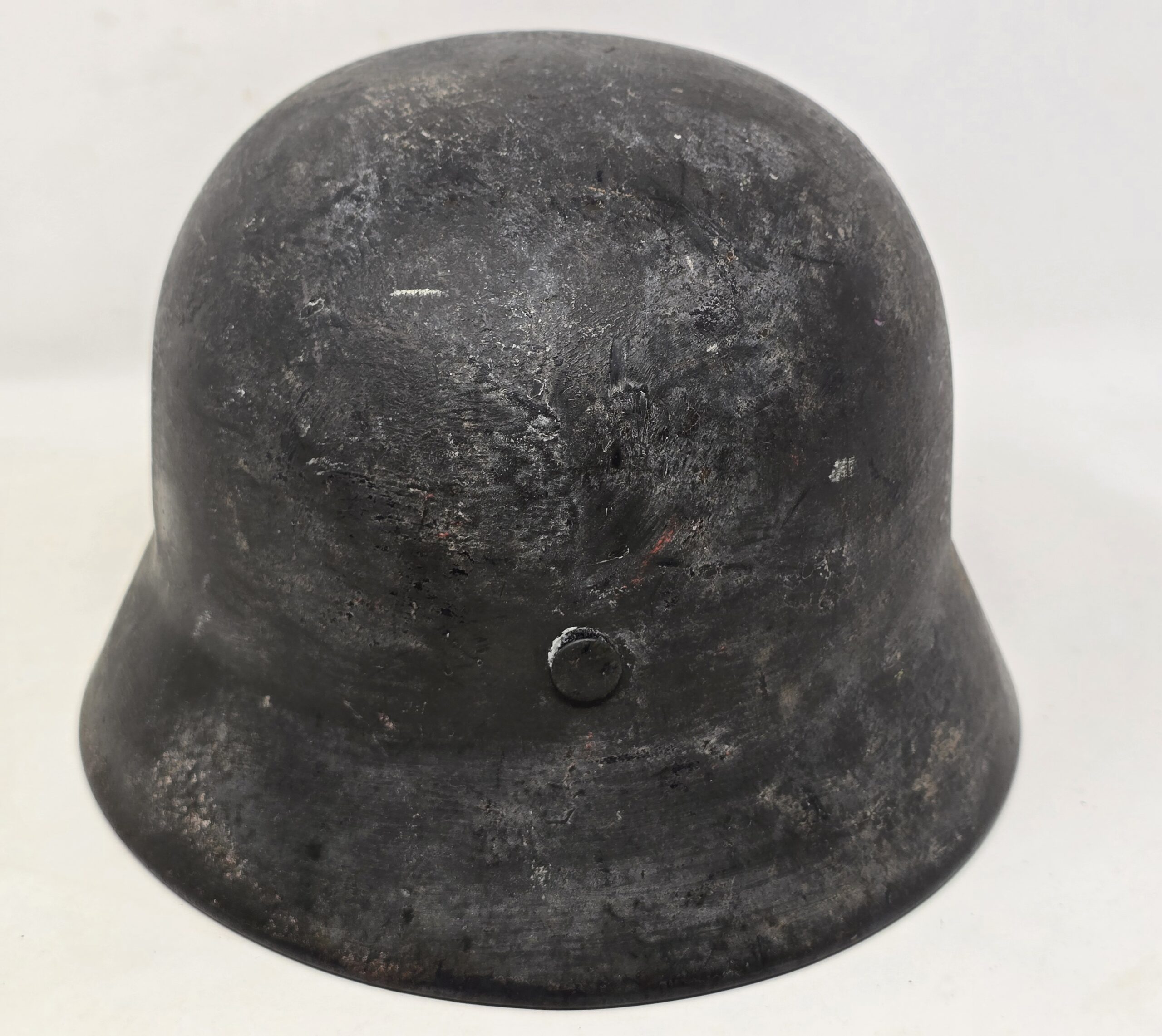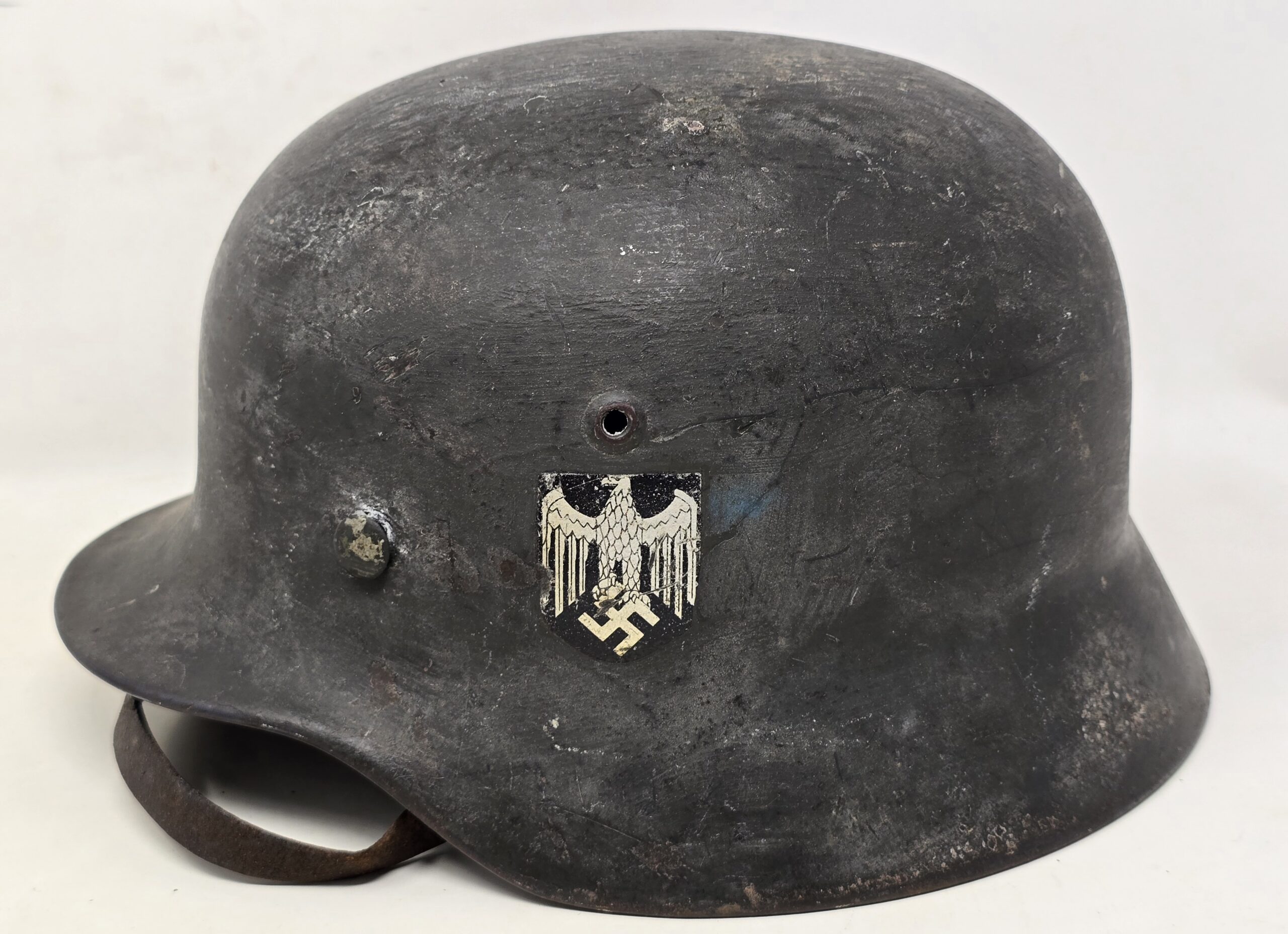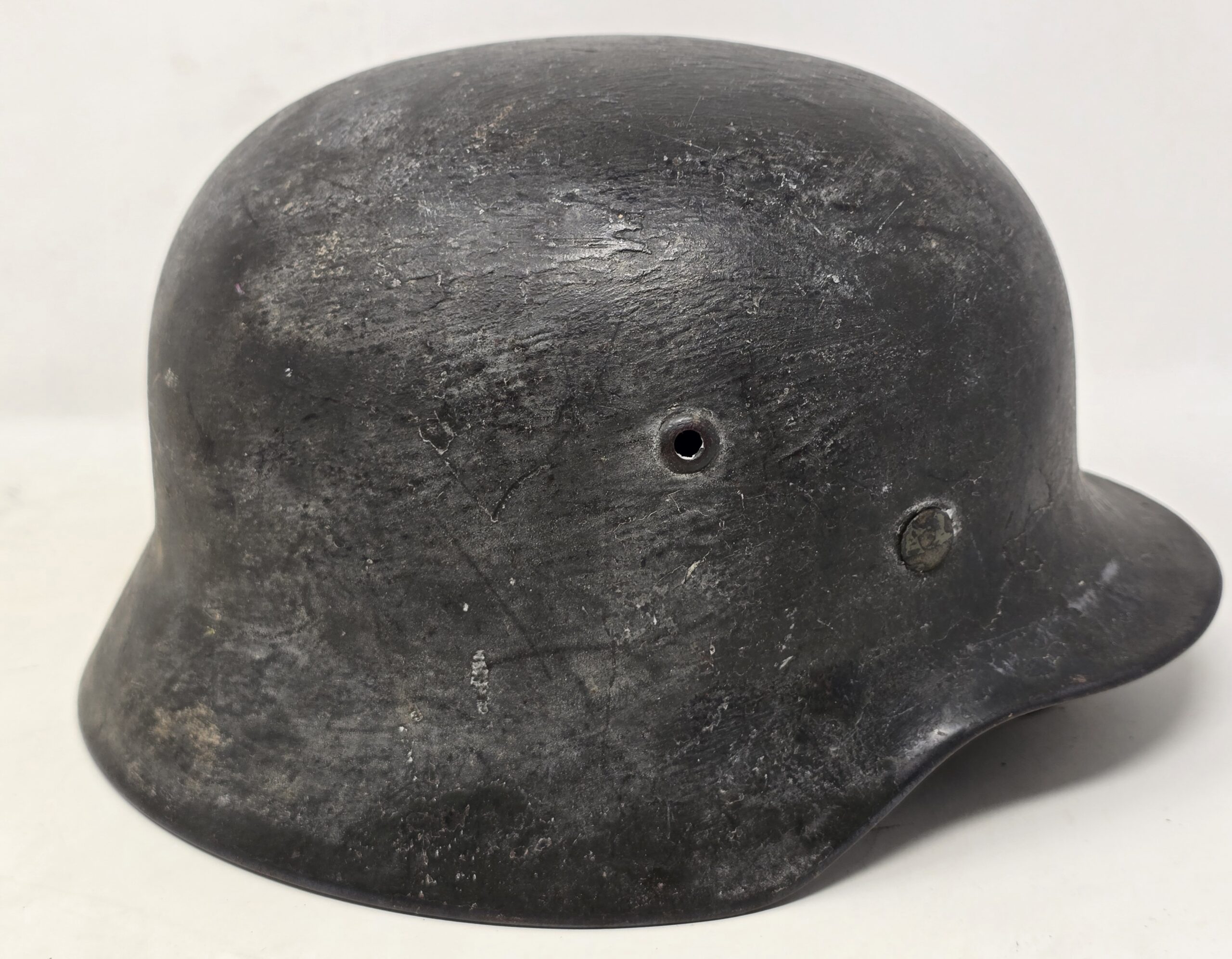 This fine ensemble comes from a very advanced and discriminating collector. The helmet is a Q-64 M40, #1147, with rough schiefergrau overpaint, covering the tricolor, but leaving the Adler decal exposed. This decal is a “bigfoot,” Quist. The liner and strap are complete and show strong service use. Evidence of white camo (whitewash?) is visible under the grey topcoat, and creates an overall ‘chalky’ appearance. I at first assumed it was scrubbed whitewash overpaint, but noticed that the white is actually peeking out from under little chips and chunks in the schiefergrau. A very cool, original feature. To top this off, the cover is a perfect, lightly service used, likely field made, water pattern camo cover, completely original and very untouched. A power set for the Heer combat collection / display. COA accompanies.