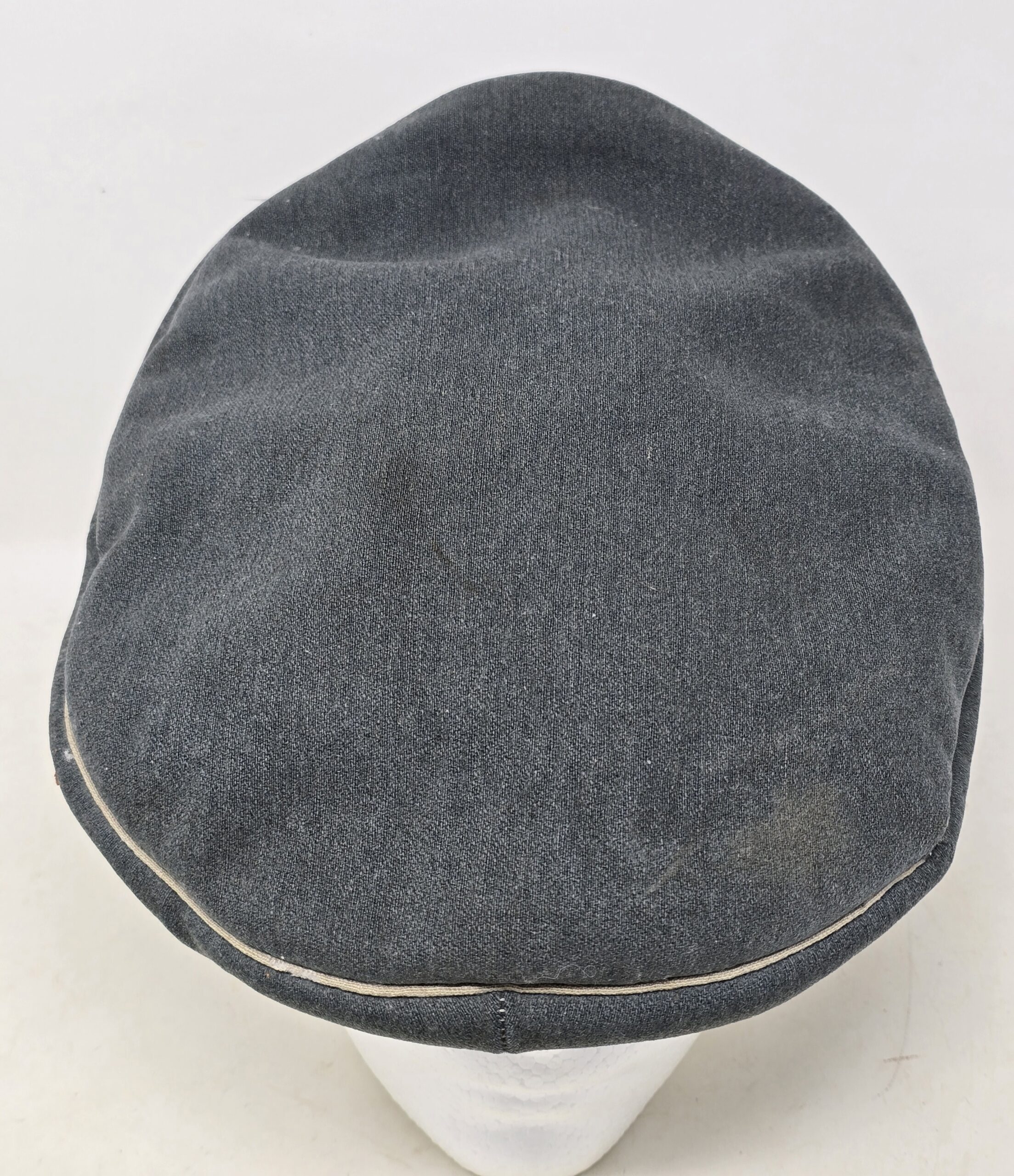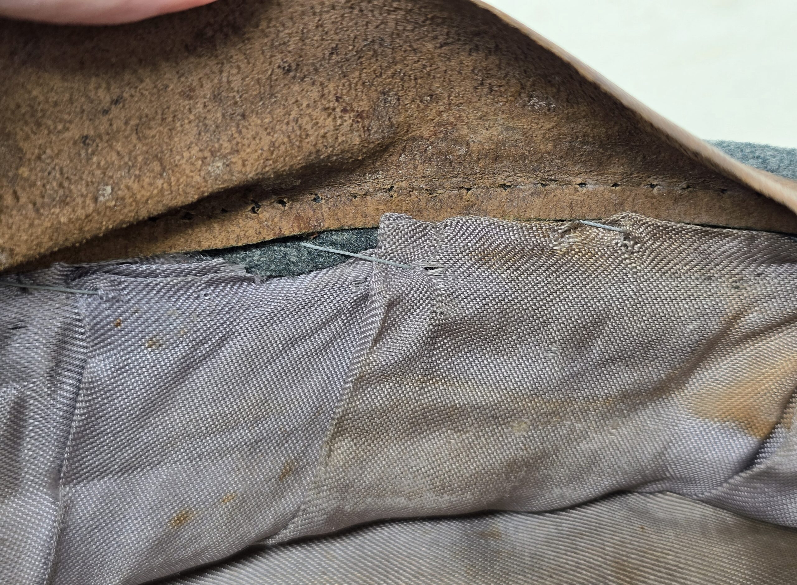 This is an early war, superb quality SS Officer’s crusher cap, featuring high quality wool body, fine lindesamt velvet band, gently age-crazed leather bill, and untouched cupal Overhoff skull and eagle. The interior is the light grey cotton / satin blend, with a leatherette band and near fully intact sweat-shield. The plesier and tacking are finely rendered, reflecting the quality of this cap maker (looking like a Clemens Wagner or similar). The cap shows service wear, weather exposure–creating a striking, original look and feel. A true addition to the SS headgear or cloth collection. COA accompanies.