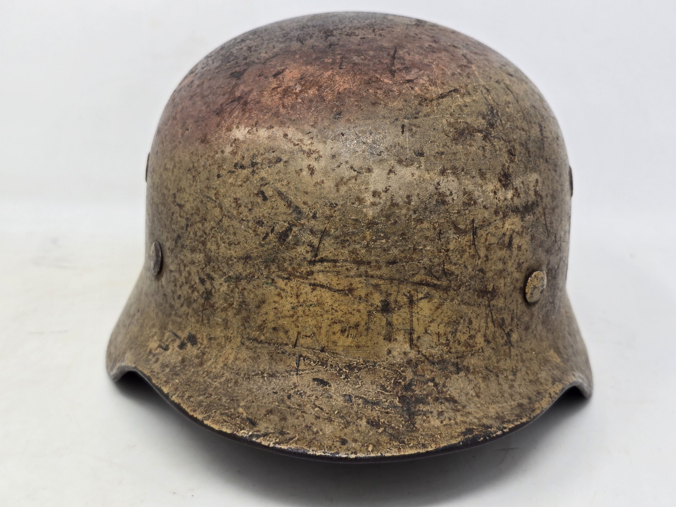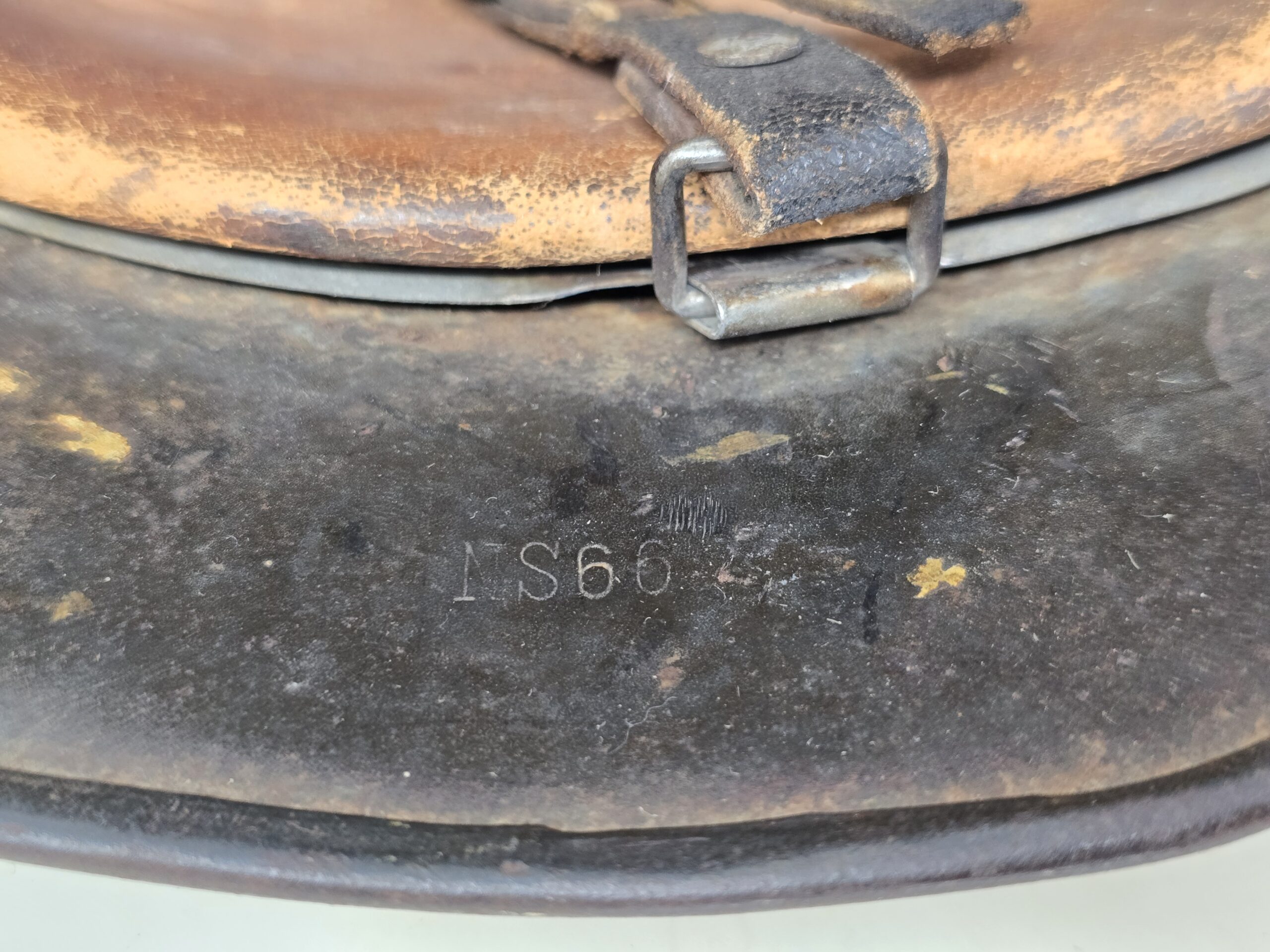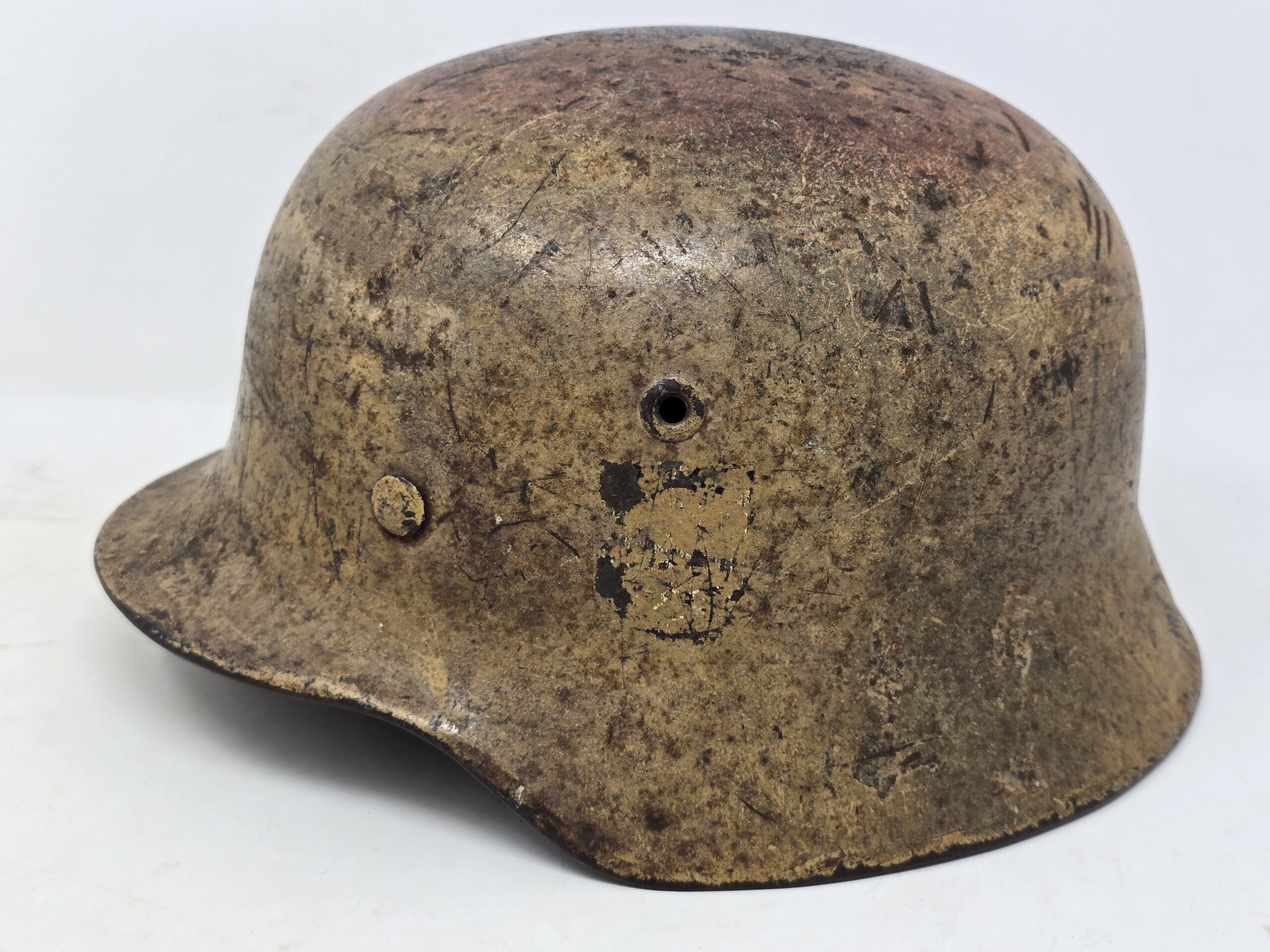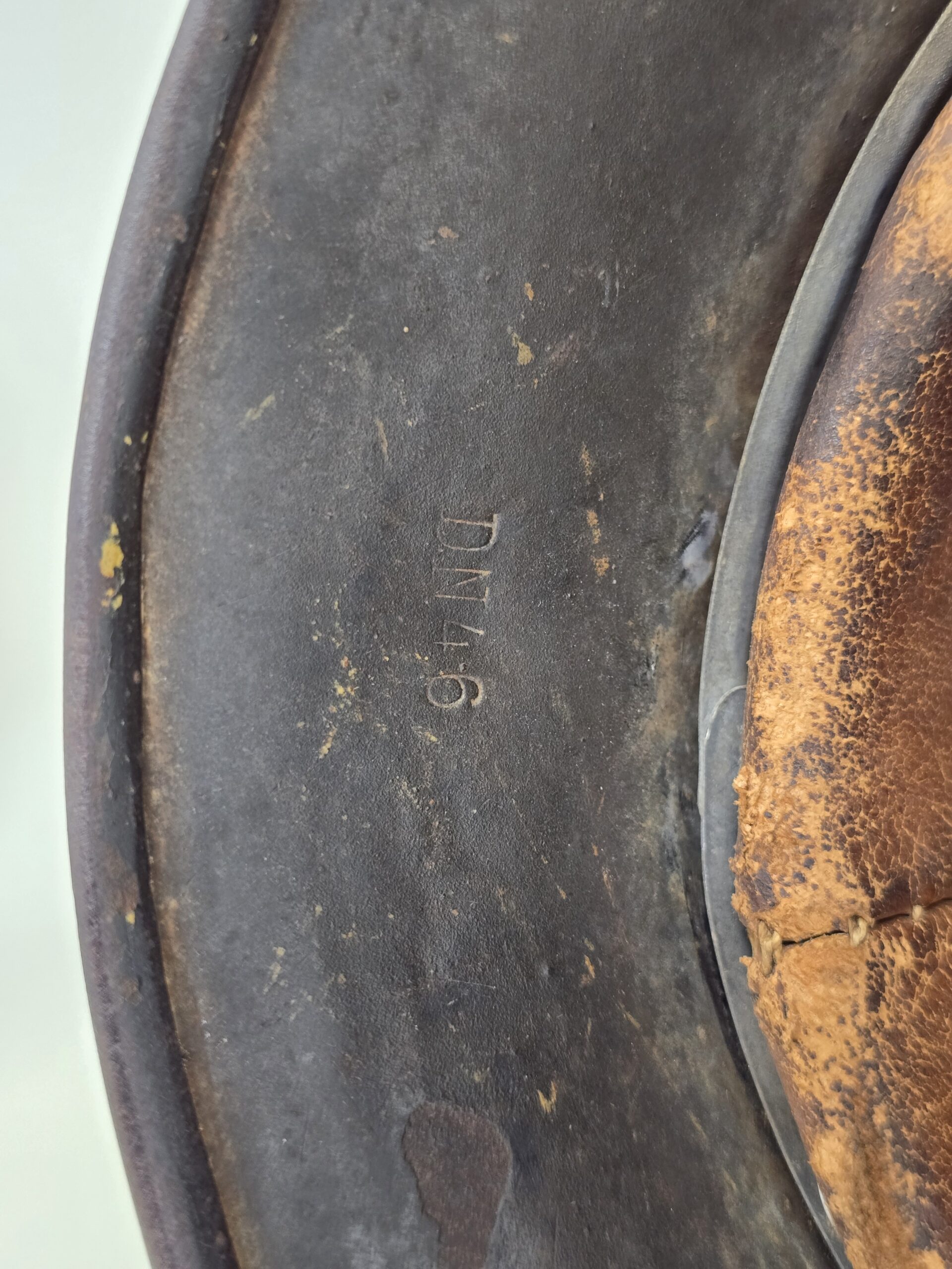 This Tan Camo M40 DAK helmet is an NS66, #DN46. The helmet shows a full tan camo finish atop the issue M40 finish. A single Heer decal is visible under the camo at about 80% present. The camo finish shows heavy sun baking and general weathering, with patina. There is an area of patina at the top that has caused a slight rose color to the tan. It is unknown what caused the patina, but sitting on its top in some kind of vehicle fuel leak is possible. The liner and chinstrap are fully intact, with some heat and sweat wear present. The helmet is a striking, complete and untouched example of a DAK– and depending on where captured– a “Southern Front” example. An outstanding battle helmet, COA accompanies.