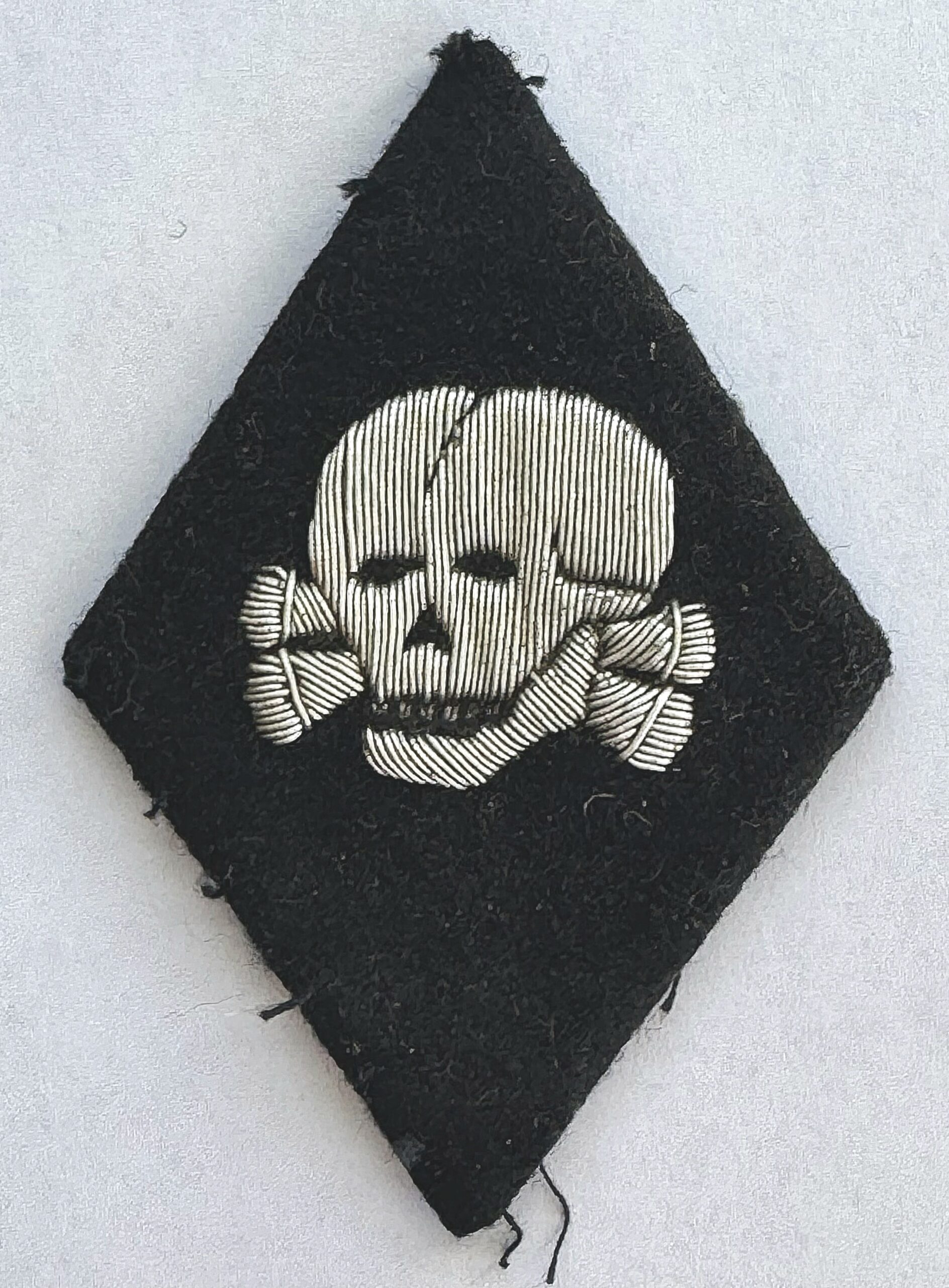 This raute is an excellent example of the bullion unbordered type, worn by SS senior officers in duty within the concentration camp establishment. The raute shows minimal use wear, and has remaining threads where it had been attached to the sleeve of a uniform. The piece comes from the premier auction house, purchased by an individual collector, who is now selling items that he has obtained over the years. A great display piece, COA accompanies.