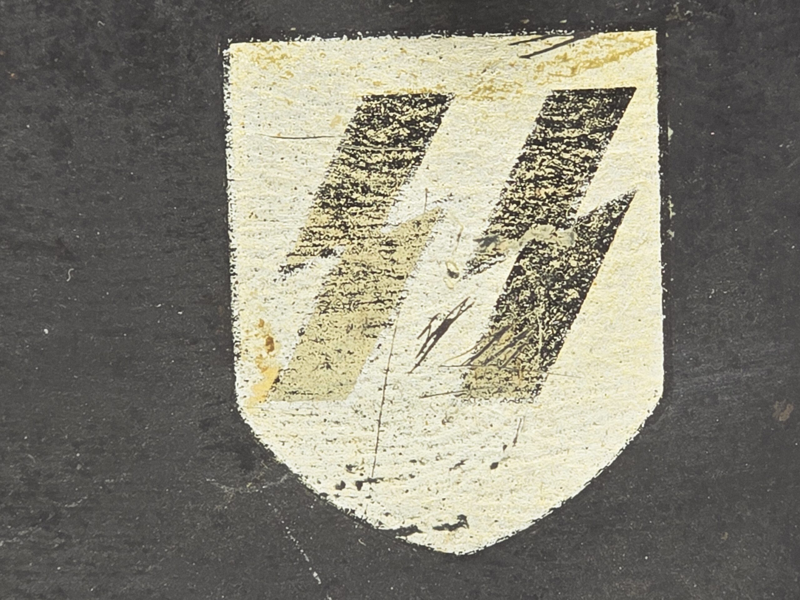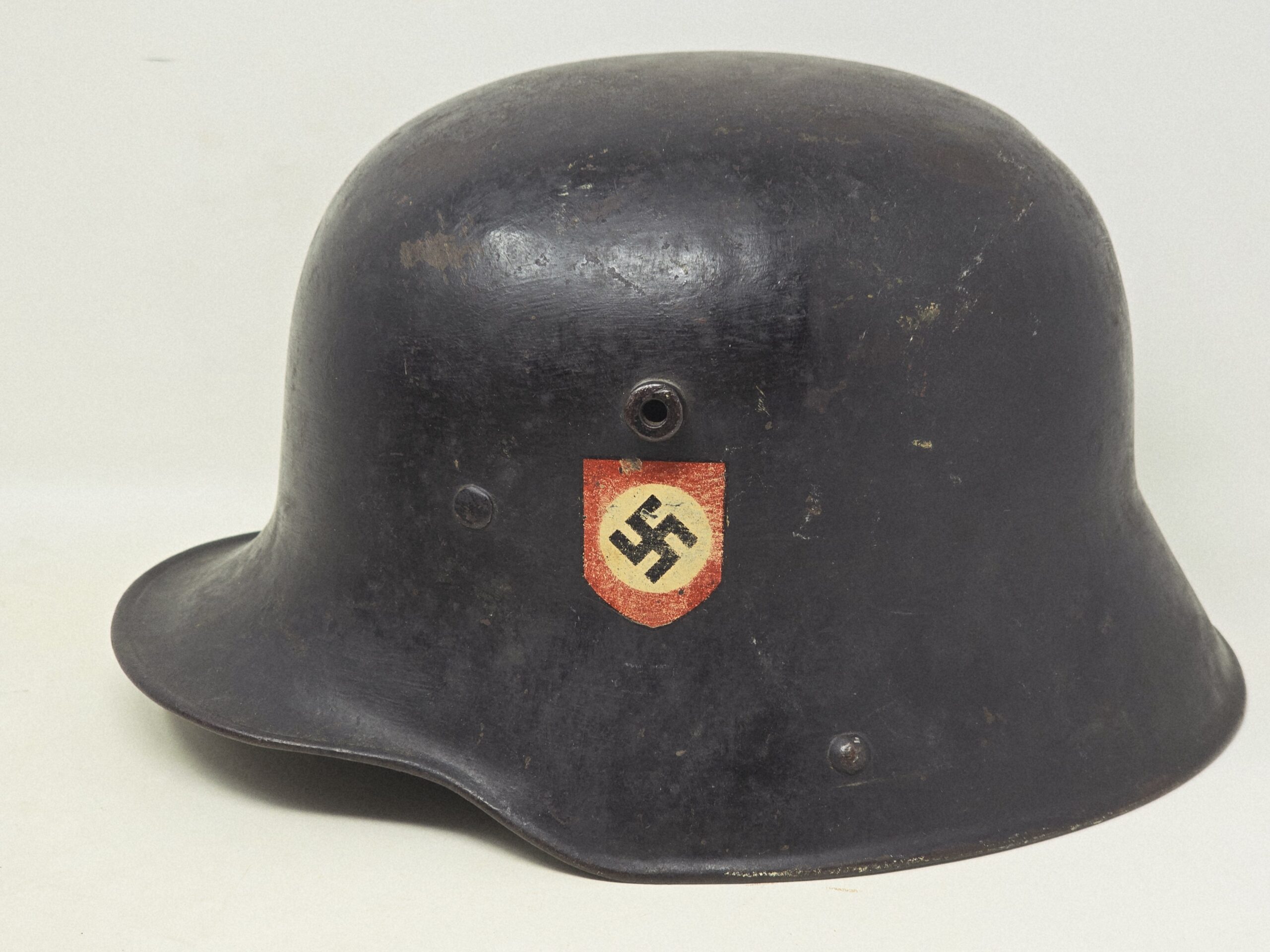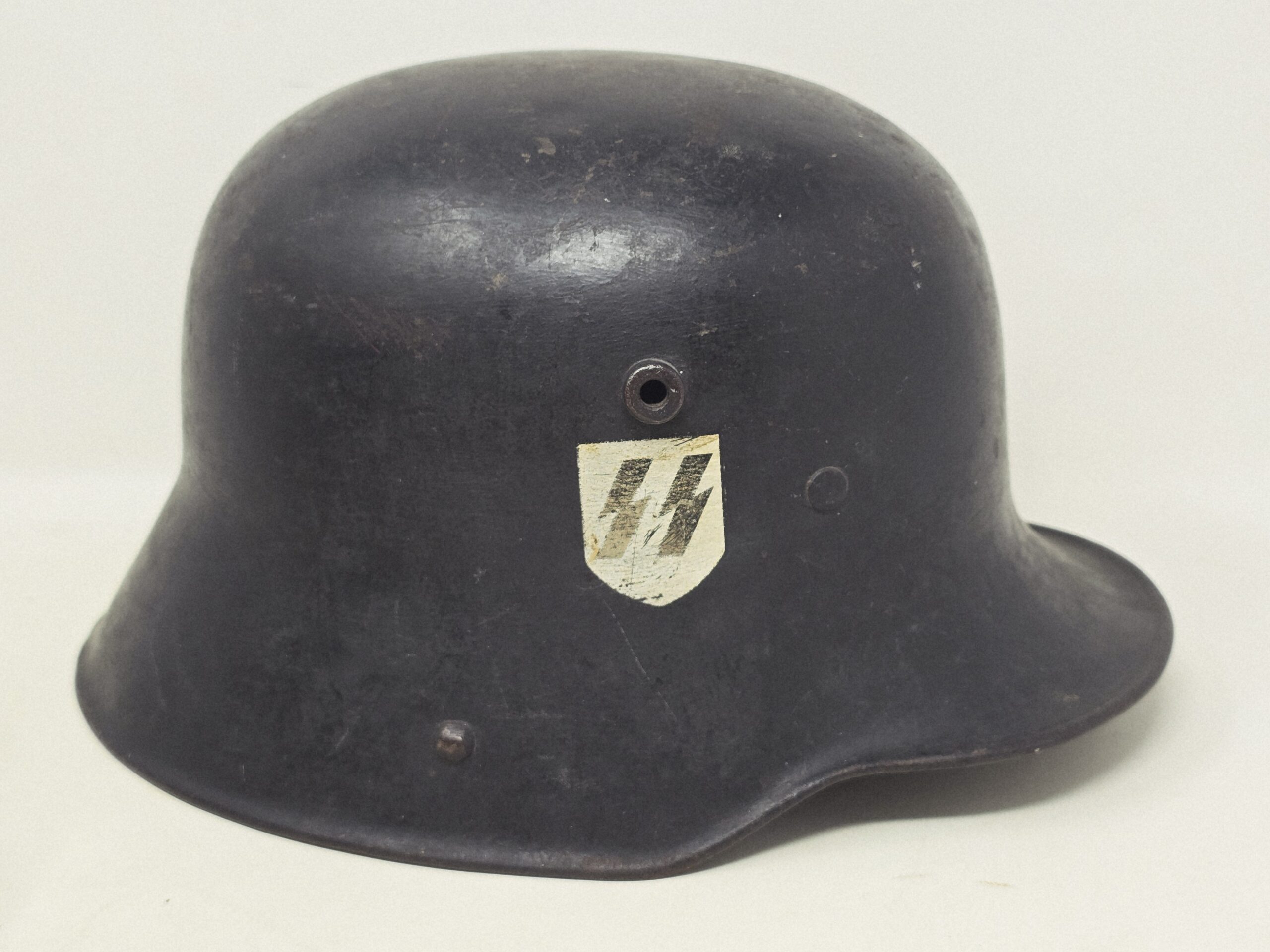 This example is a size 66 M16/17 German shell, re-painted in flat black and adorned with a set of CA Pocher runic and party shields. The paint is 90%-plus intact, the decals are full shield form but show fading from most likely repeated polishing (every detail of the pocher runes is evident, including the outline on the edges of the runes). The estimate helmet has not been stripped, because in the dullness of the flat finish is evidence of evaporated wax polish– likely from the period. As these were parade helmets, they were shined frequently, leading to a certain amount of insignia fading. A great helmet, out of a years old collection in the northeast US. COA accompanies.