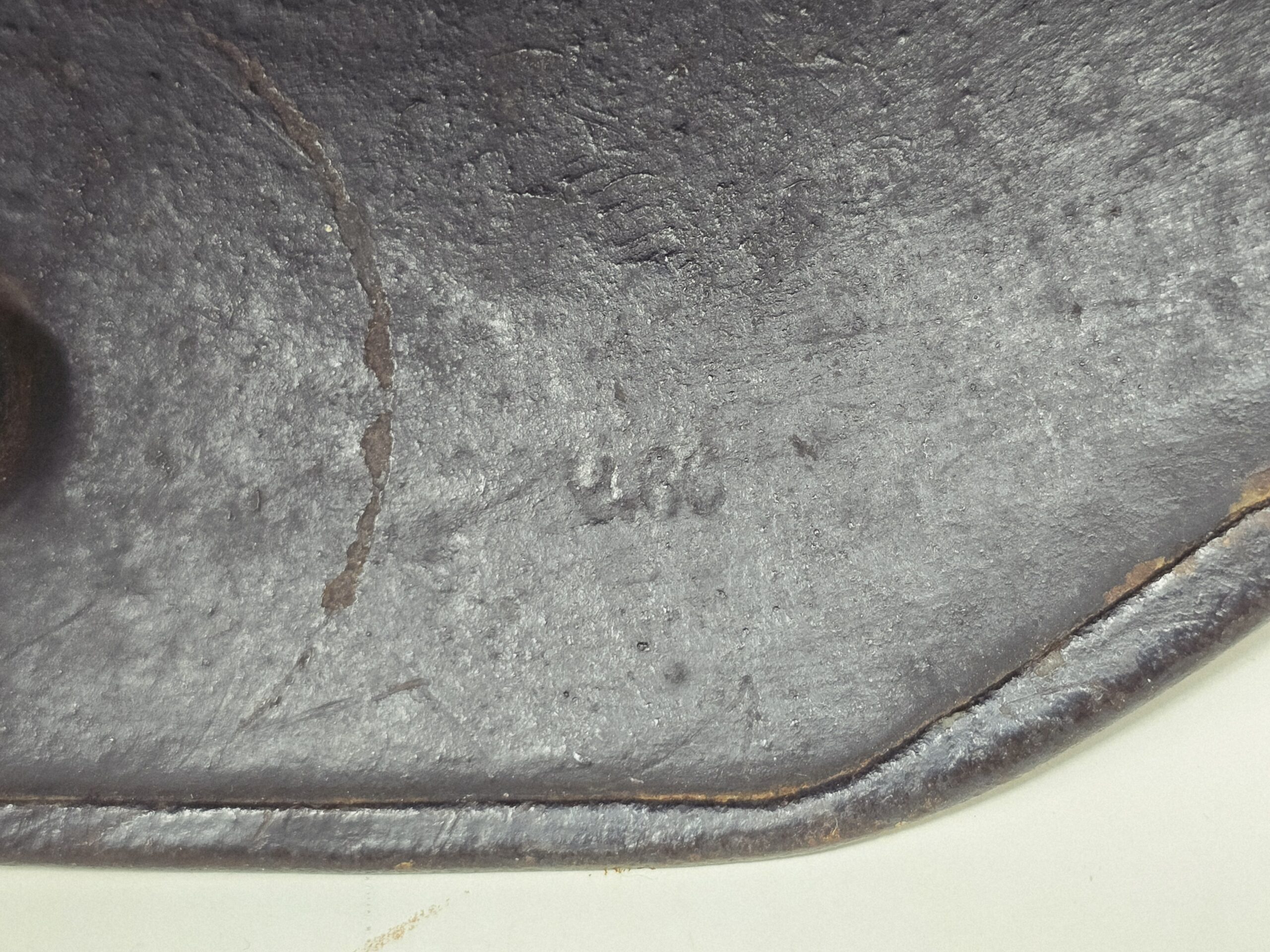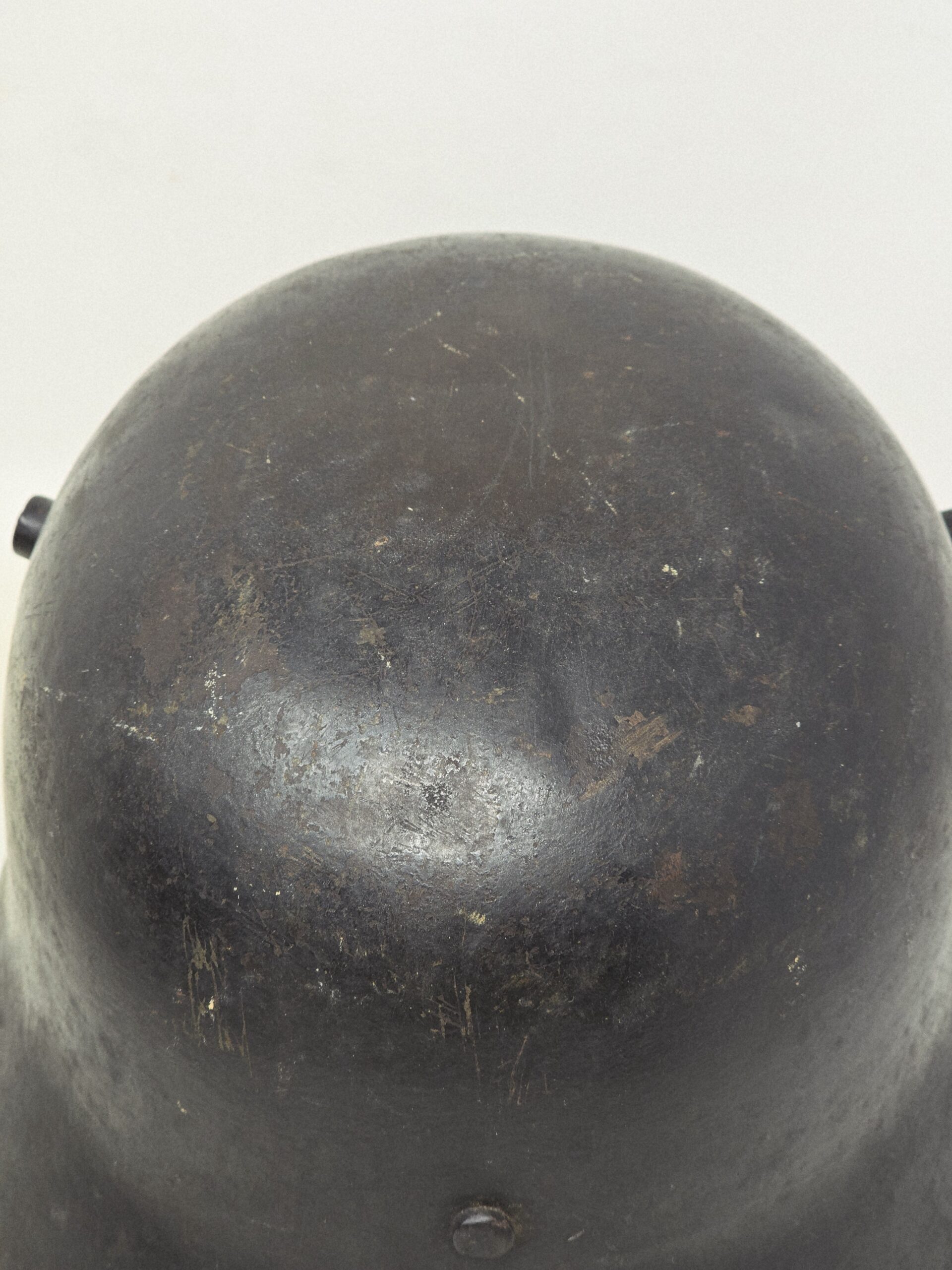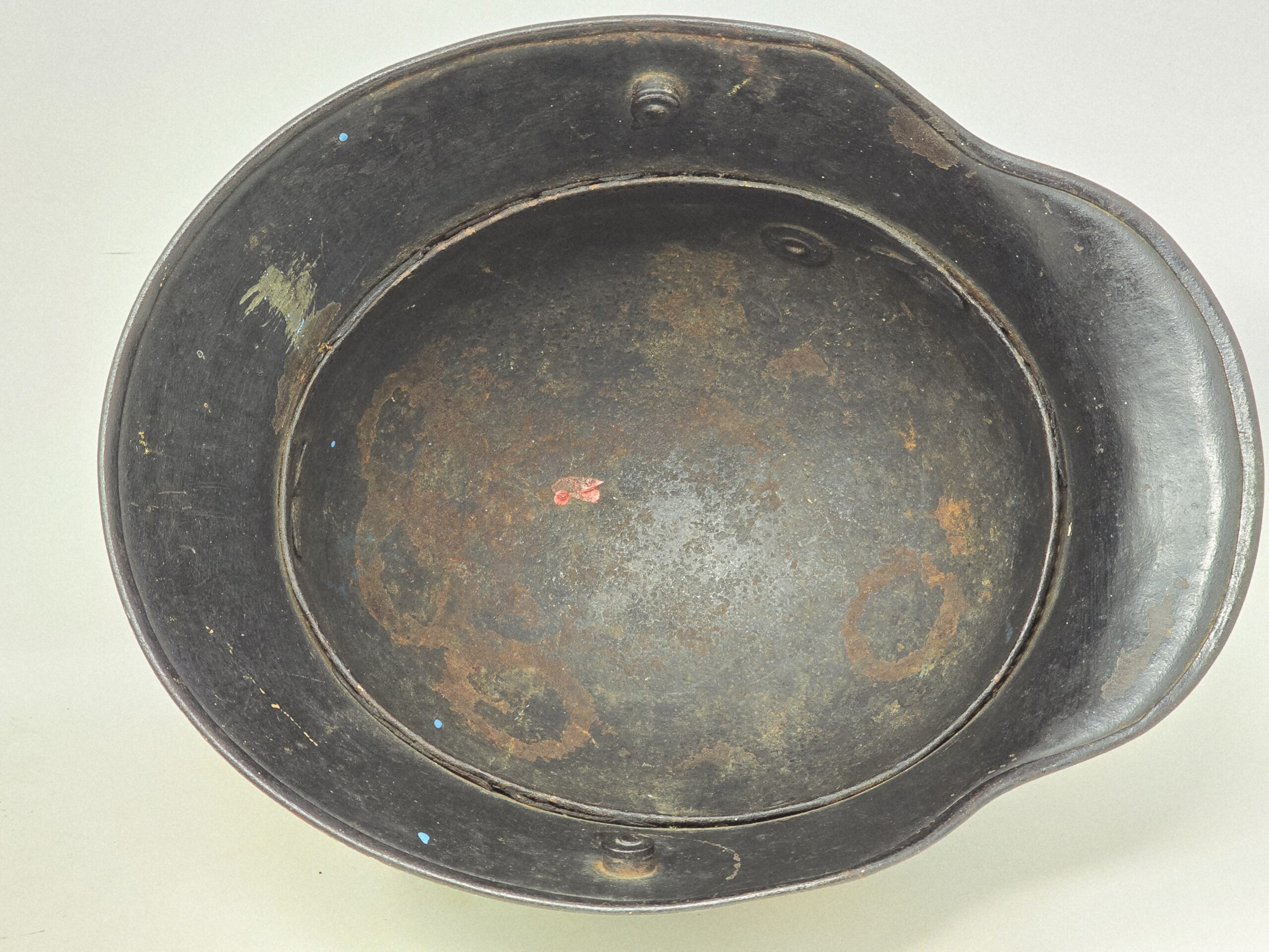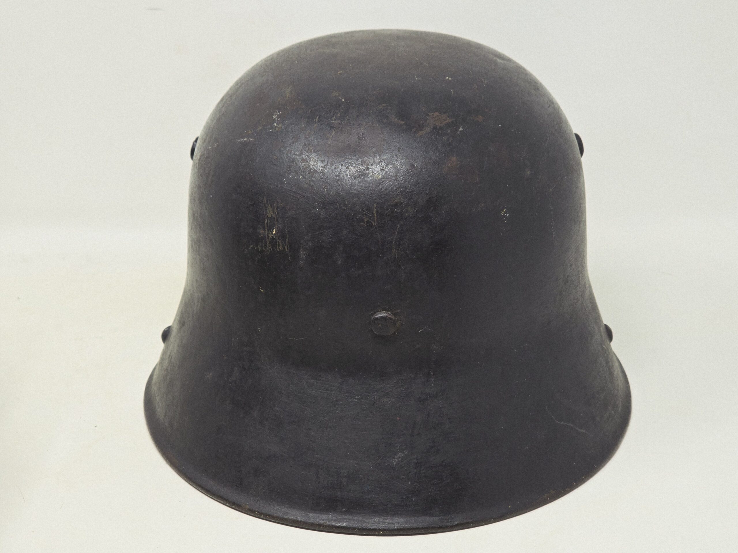 This example is a size 66 M16/17 German shell, re-painted in flat black and adorned with a set of CA Pocher runic and party shields. The paint is 90%-plus intact, the decals are full shield form but show fading from most likely repeated polishing (every detail of the pocher runes is evident, including the outline on the edges of the runes). The estimate helmet has not been stripped, because in the dullness of the flat finish is evidence of evaporated wax polish– likely from the period. As these were parade helmets, they were shined frequently, leading to a certain amount of insignia fading. A great helmet, out of a years old collection in the northeast US. COA accompanies.