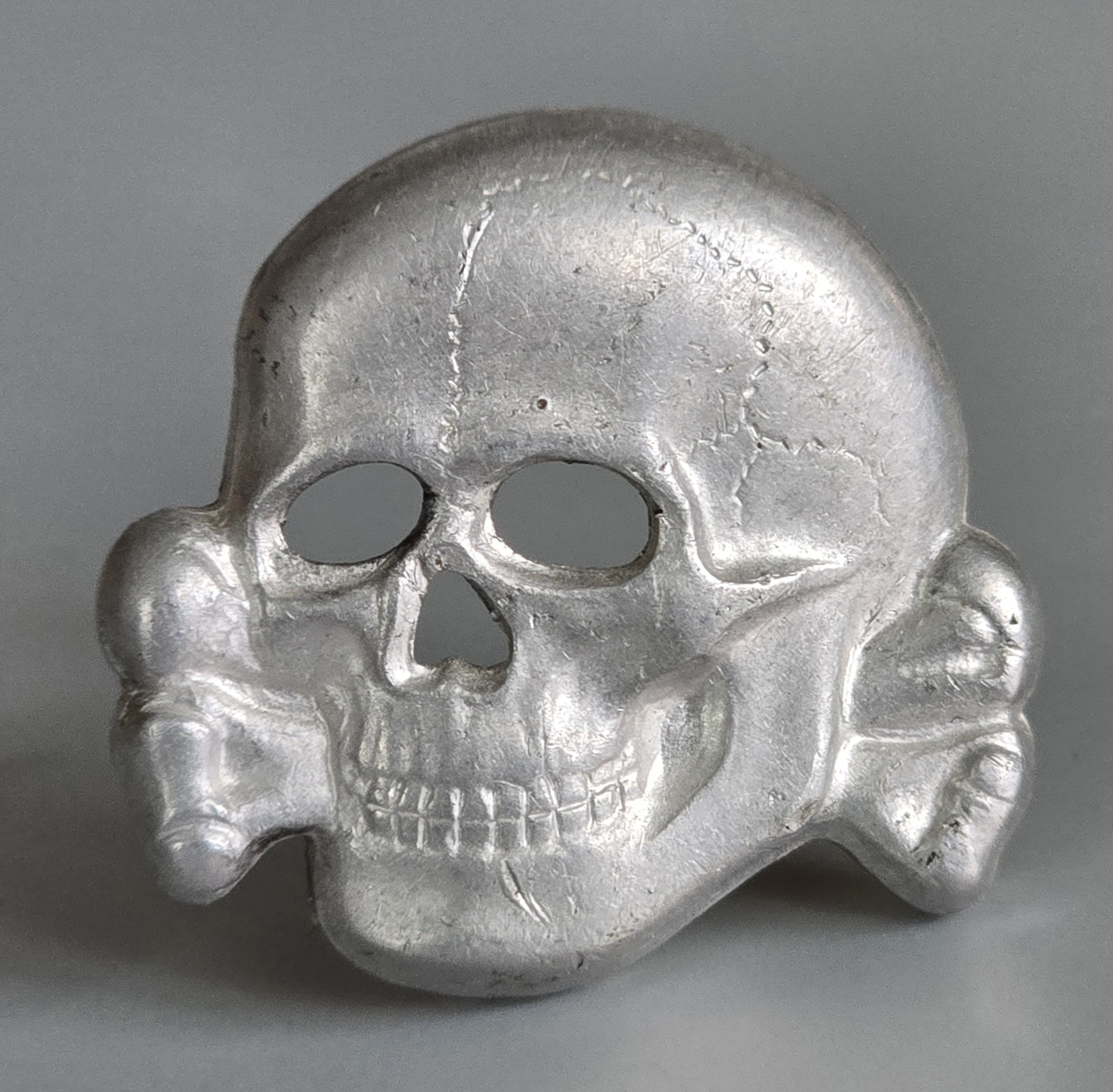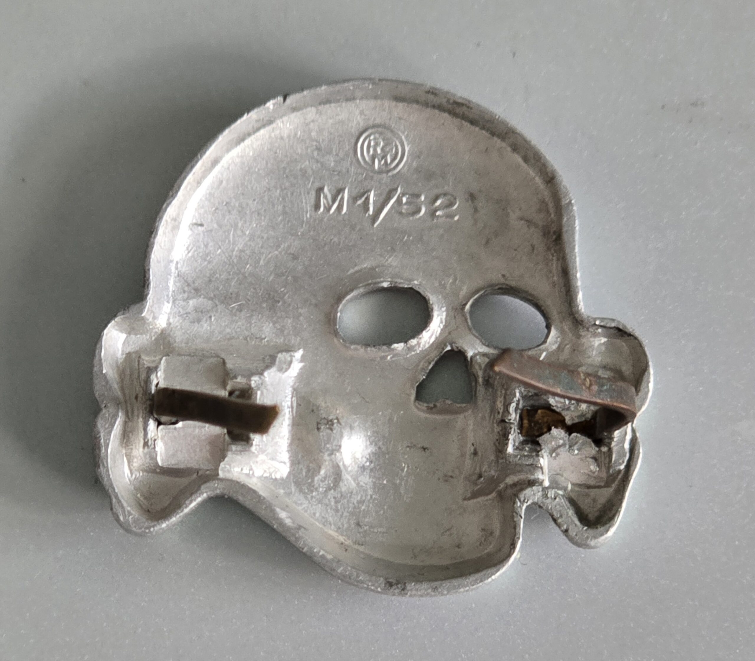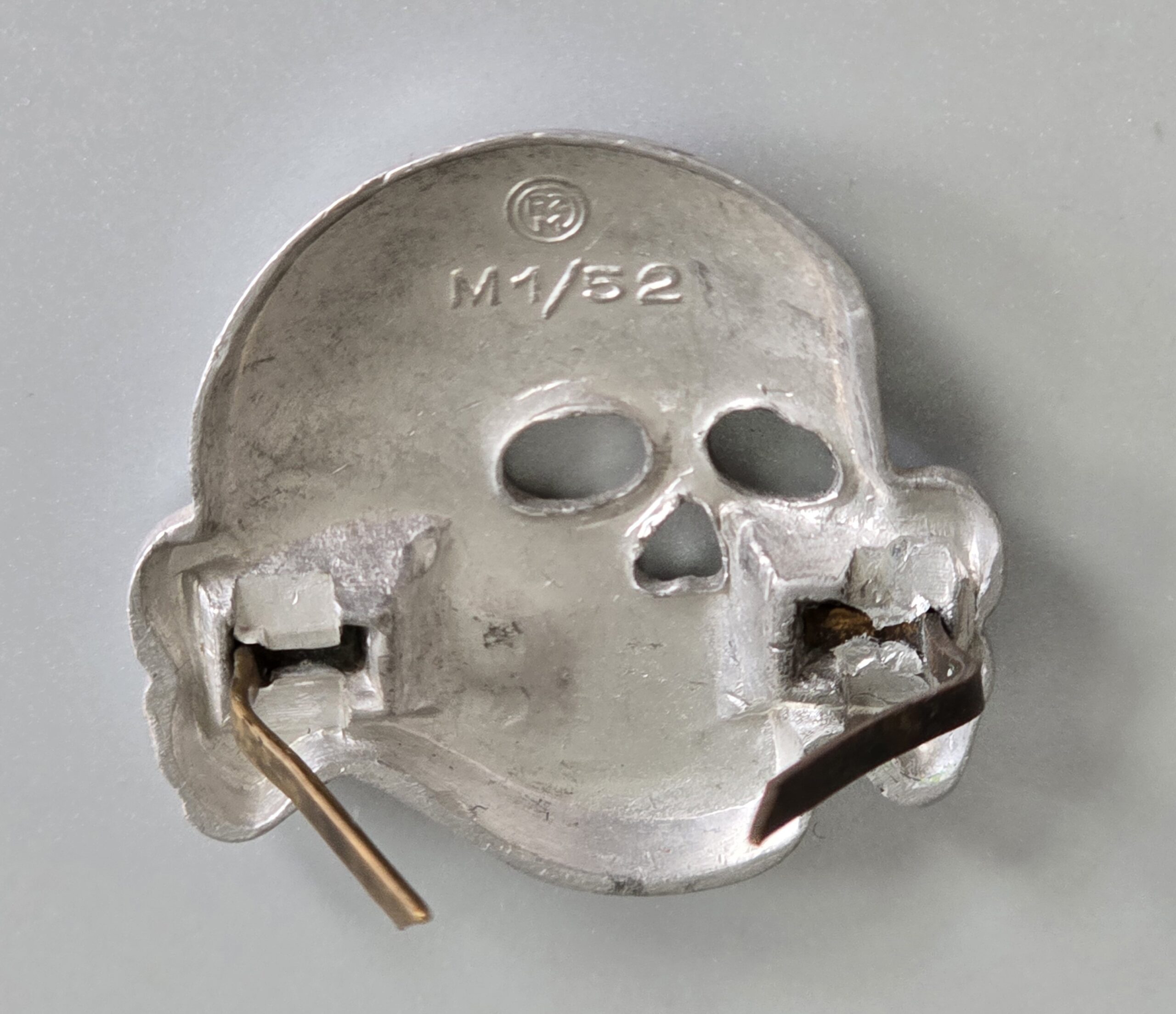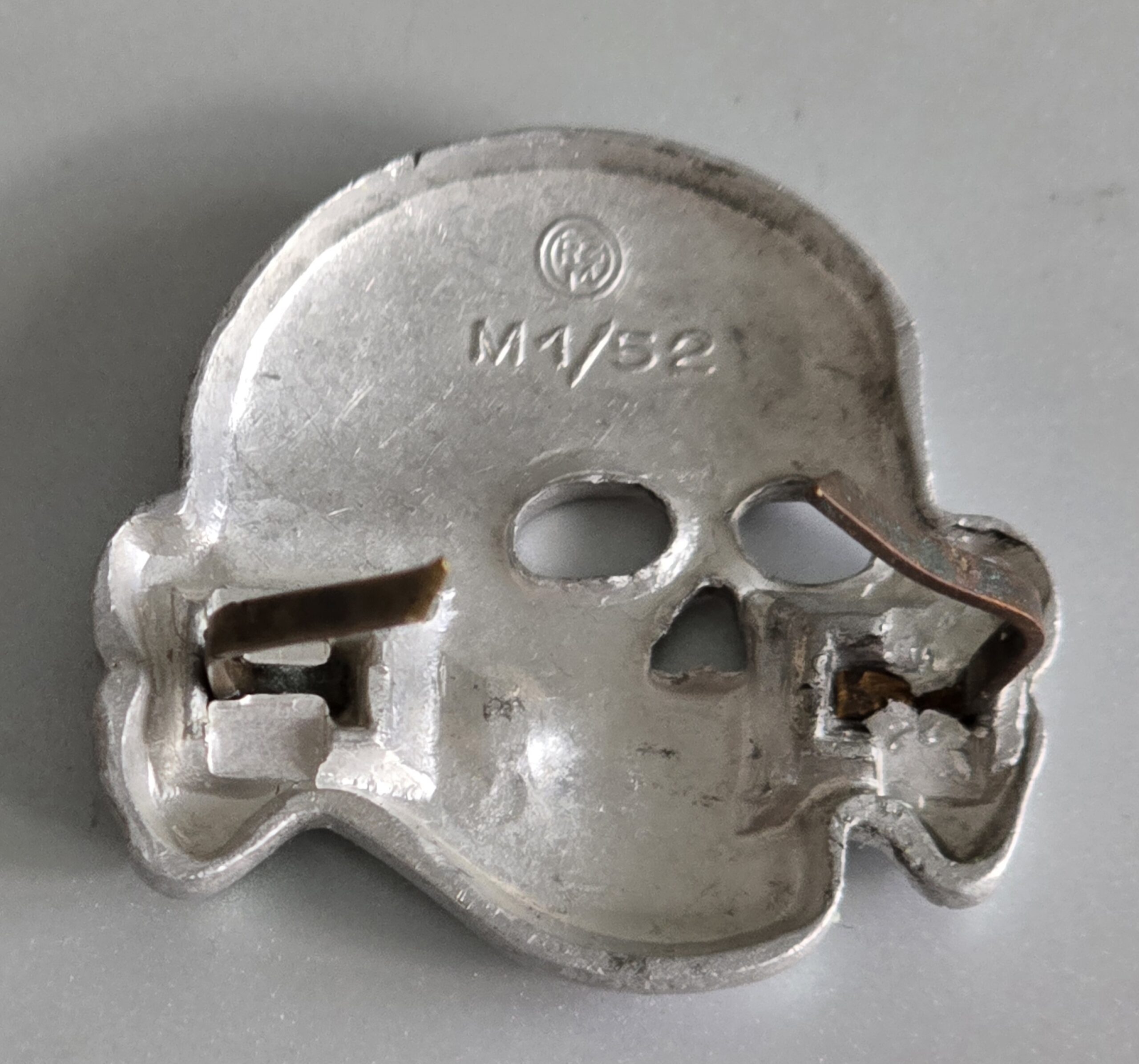 This is a beautiful aluminum Deschler skull, fine for any insignia collection or a restoration project. One of the prongs has been put back in place and the marks are visible on that crimp. Other than that, it’s pristine in every way. COA accompanies.