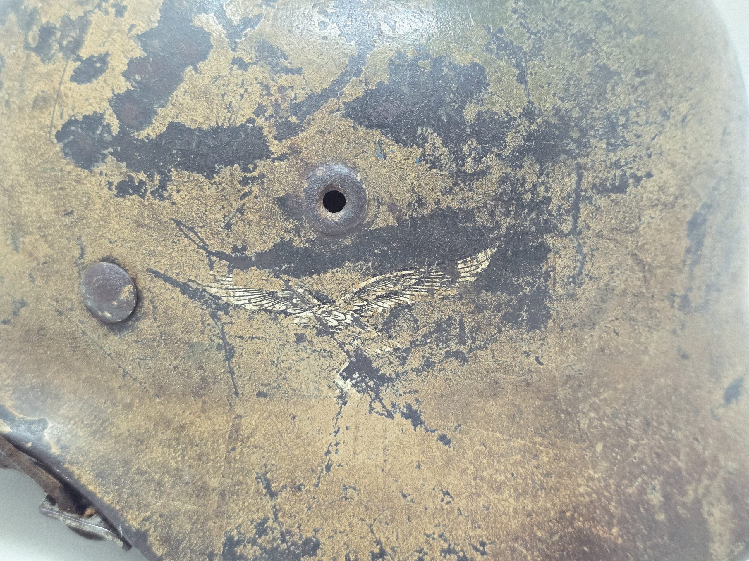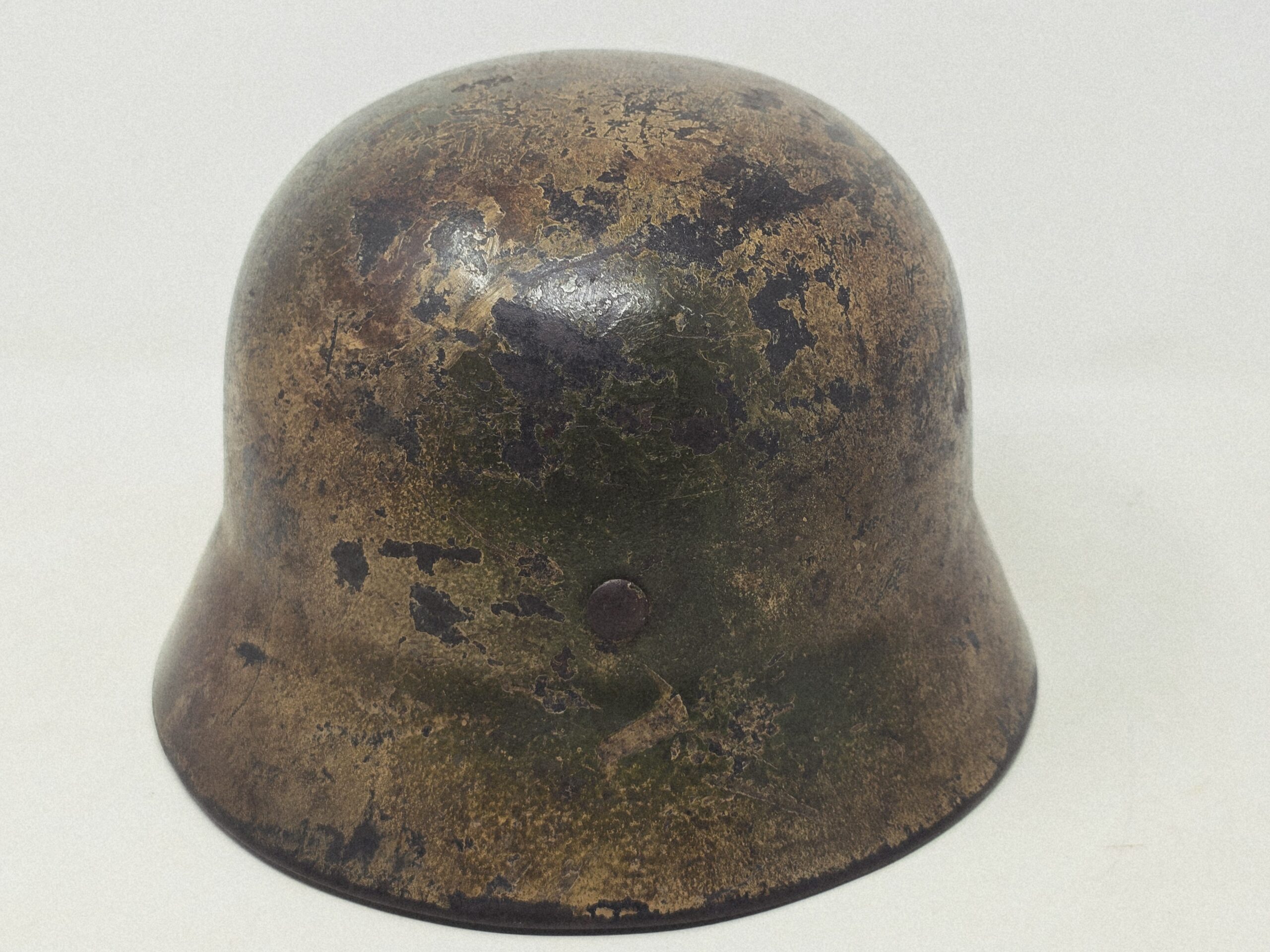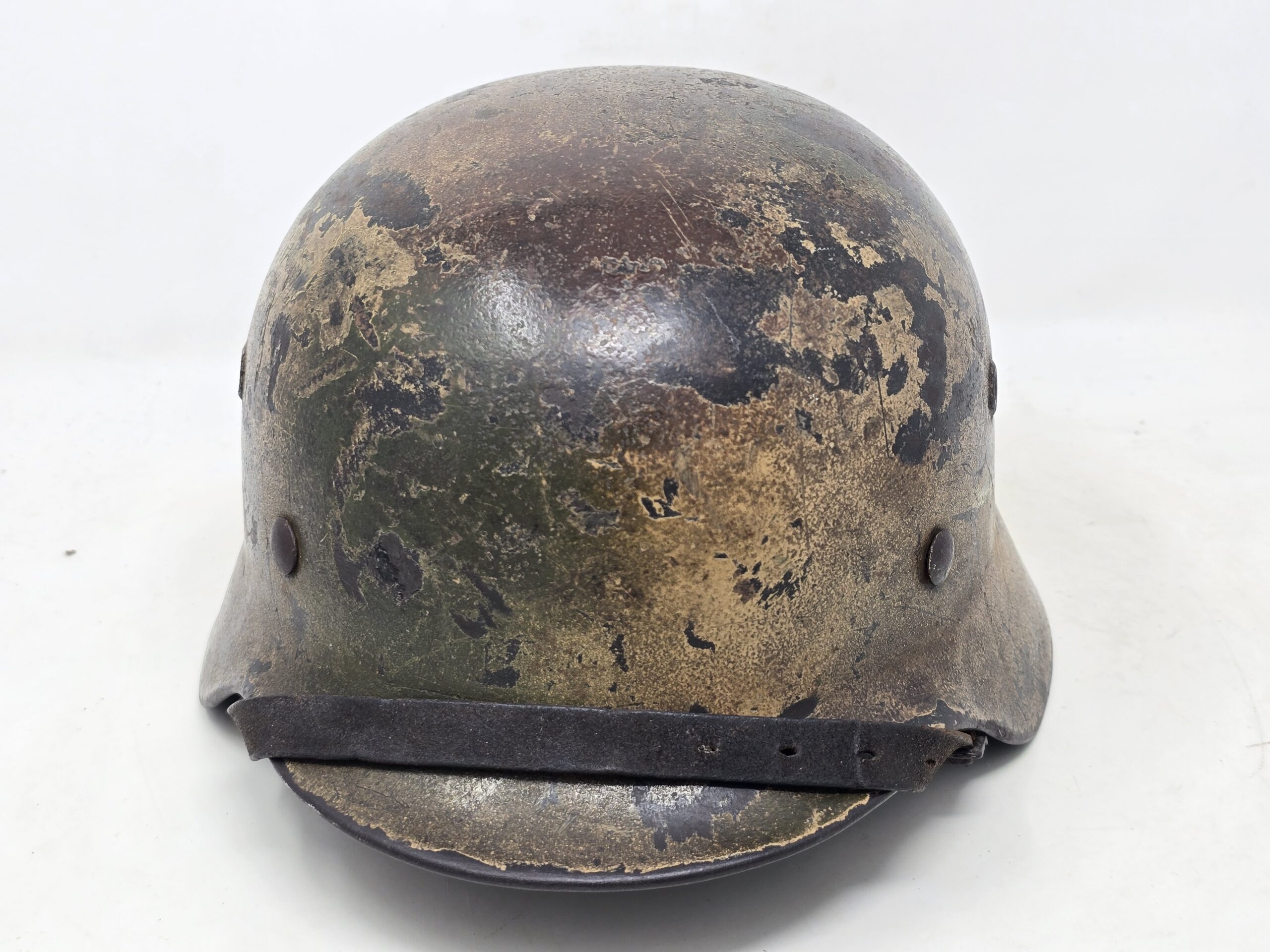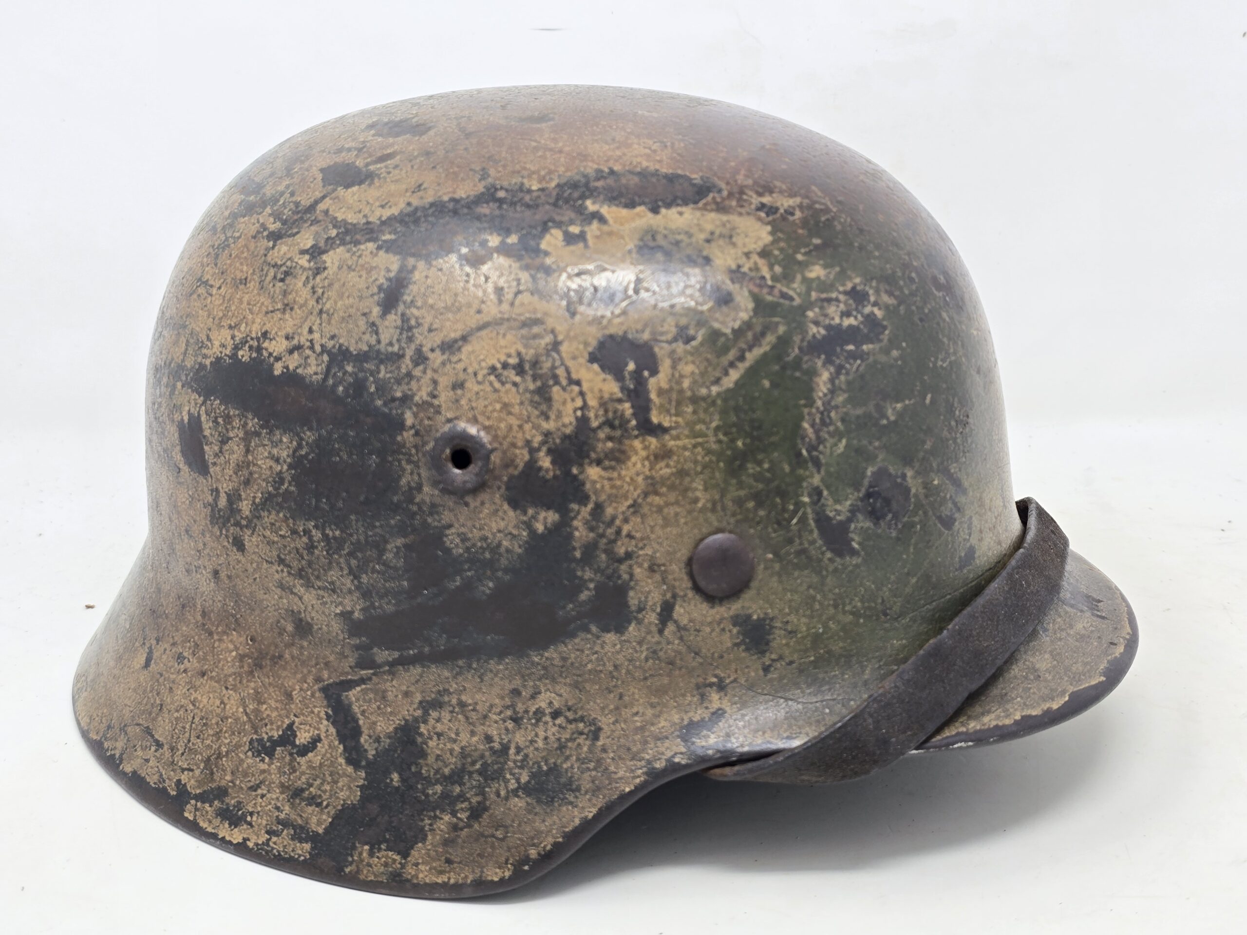 This helmet is a great example of an SE M40 size66, heat lot number 22011. The liner and chin strap are in very good serviceable condition. The helmet itself shows a service worn but still largely intact camouflage finish, with the Luftwaffe Eagle partially exposed. The camouflage finish consists of, in my opinion, a southern front finish- then updated green and red sprayed areas for Italy–Possibly Normandy campaigns. An excellent example, definitely a star of a camouflage collection. COA accompanies.