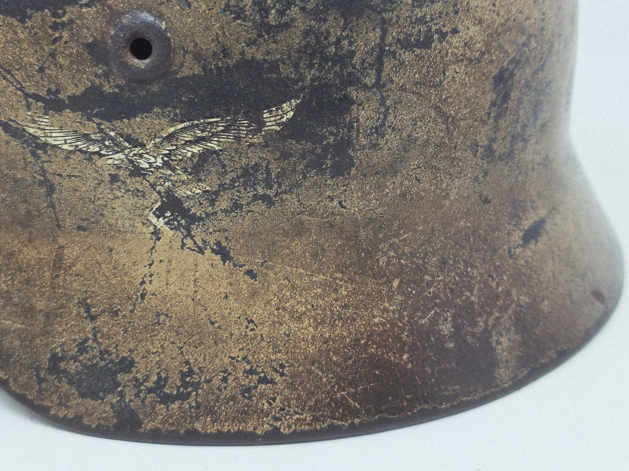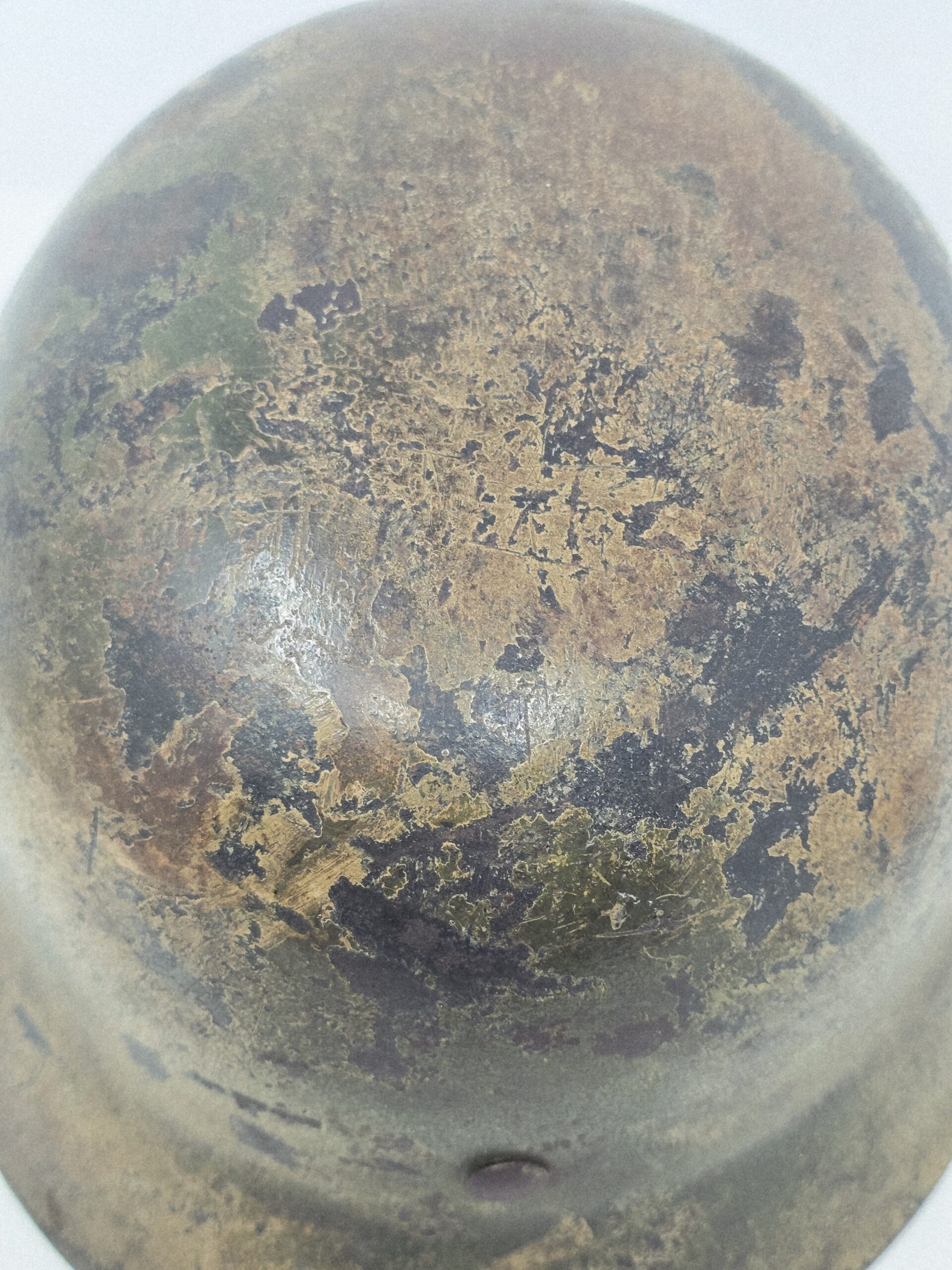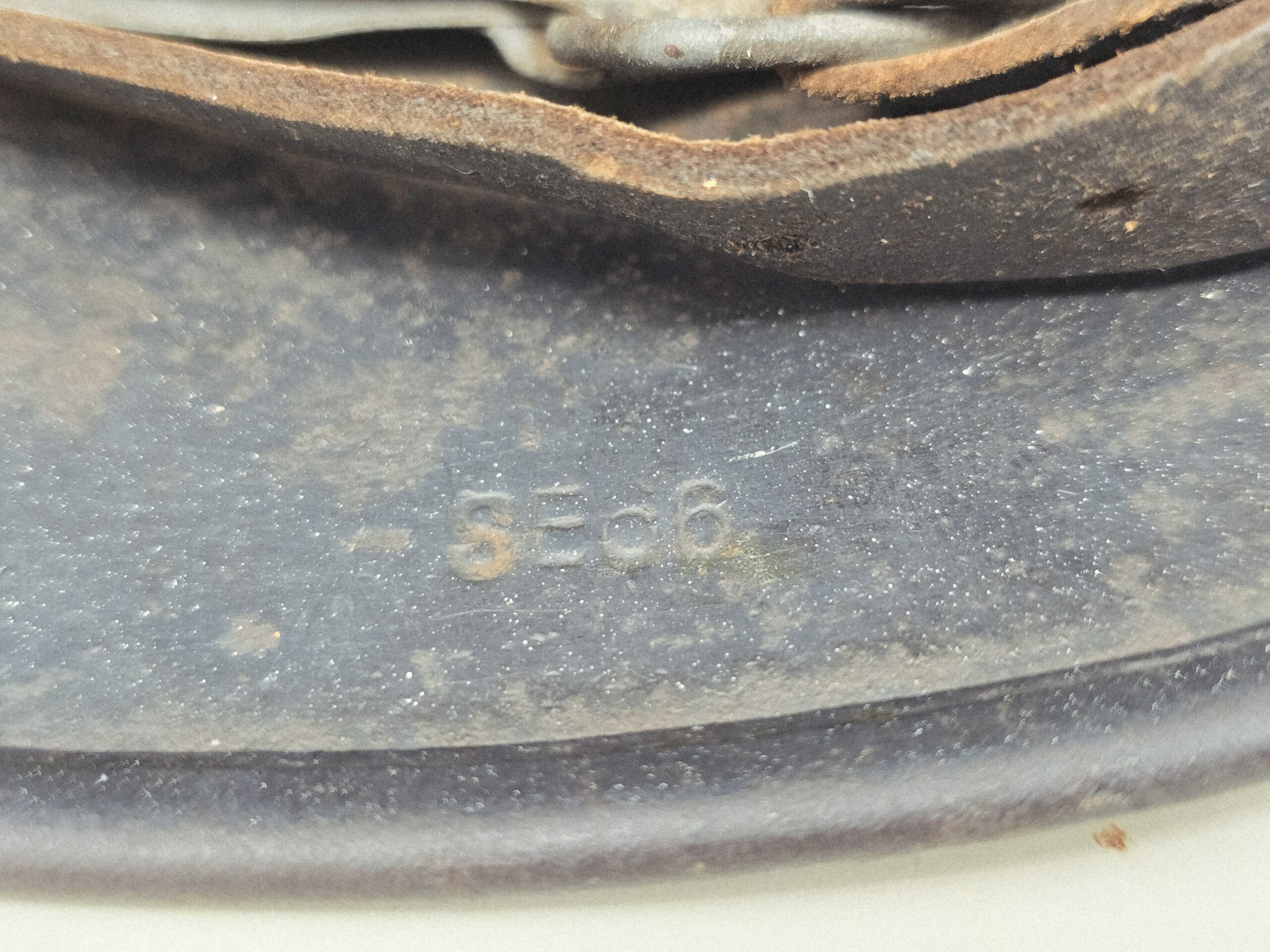 This helmet is a great example of an SE M40 size66, heat lot number 22011. The liner and chin strap are in very good serviceable condition. The helmet itself shows a service worn but still largely intact camouflage finish, with the Luftwaffe Eagle partially exposed. The camouflage finish consists of, in my opinion, a southern front finish- then updated green and red sprayed areas for Italy–Possibly Normandy campaigns. An excellent example, definitely a star of a camouflage collection. COA accompanies.