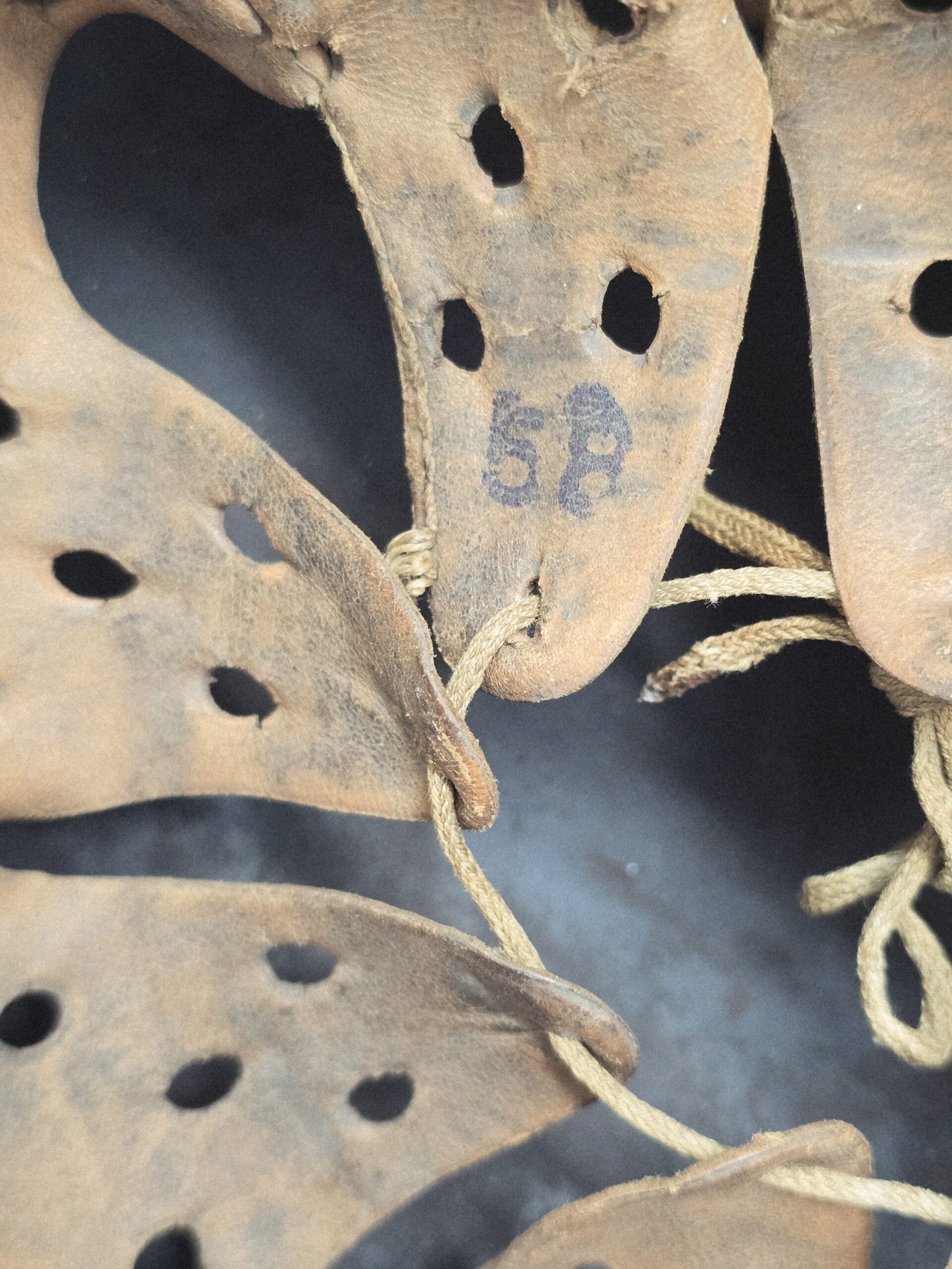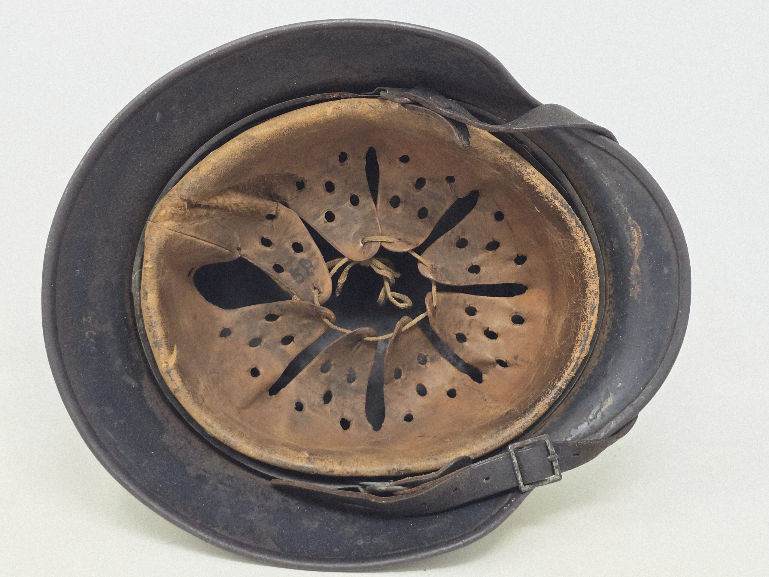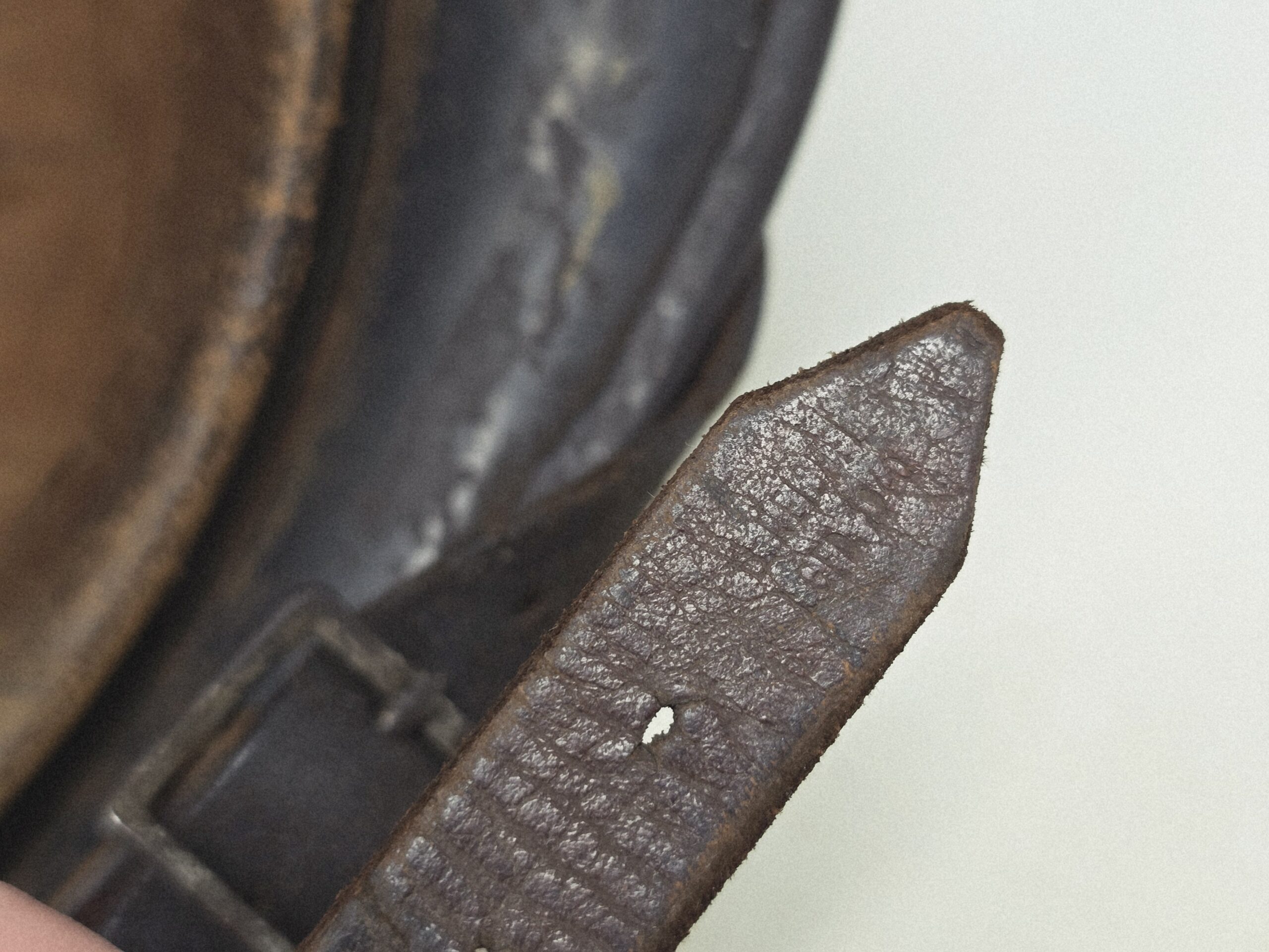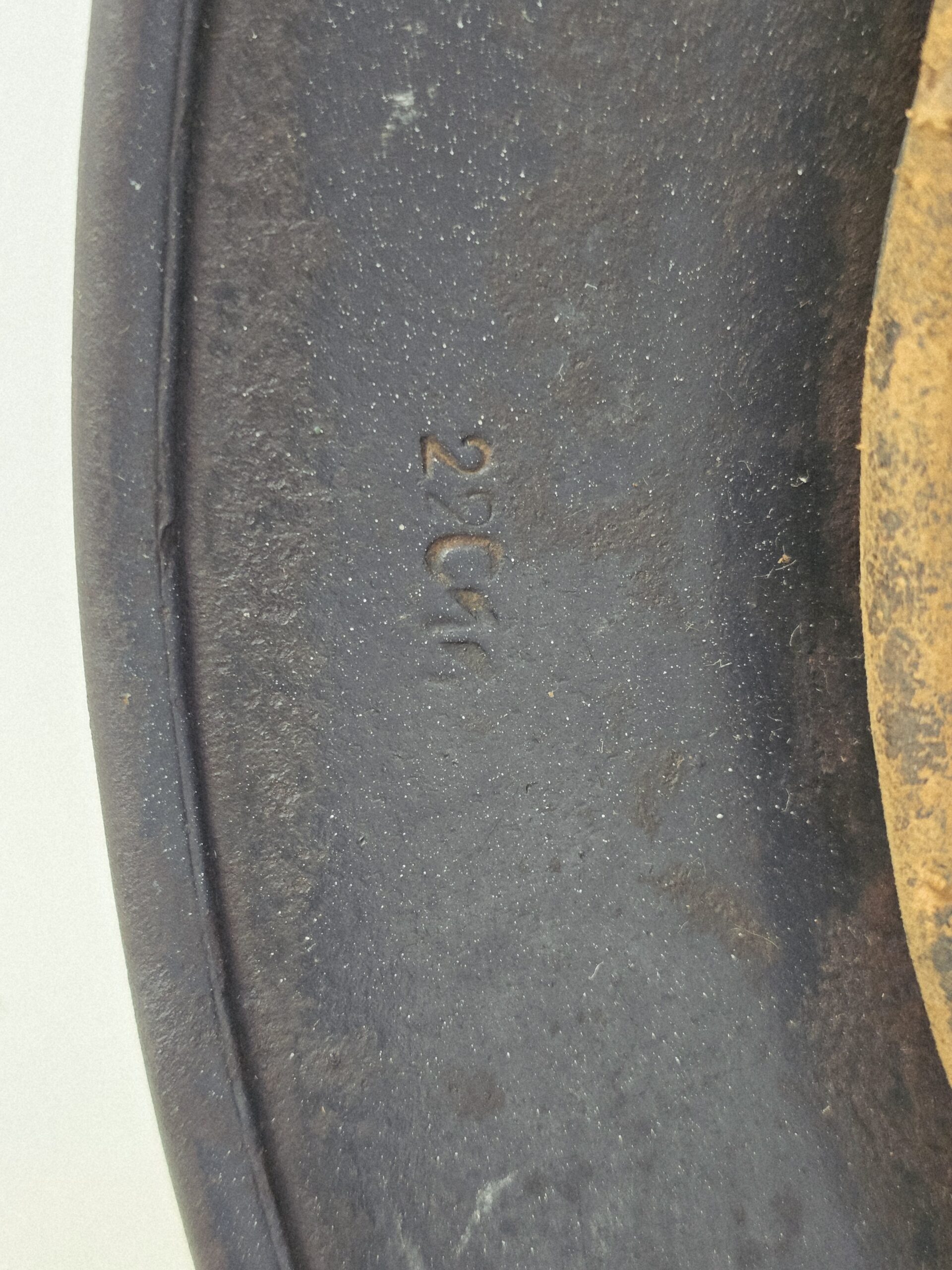 This helmet is a great example of an SE M40 size66, heat lot number 22011. The liner and chin strap are in very good serviceable condition. The helmet itself shows a service worn but still largely intact camouflage finish, with the Luftwaffe Eagle partially exposed. The camouflage finish consists of, in my opinion, a southern front finish- then updated green and red sprayed areas for Italy–Possibly Normandy campaigns. An excellent example, definitely a star of a camouflage collection. COA accompanies.
