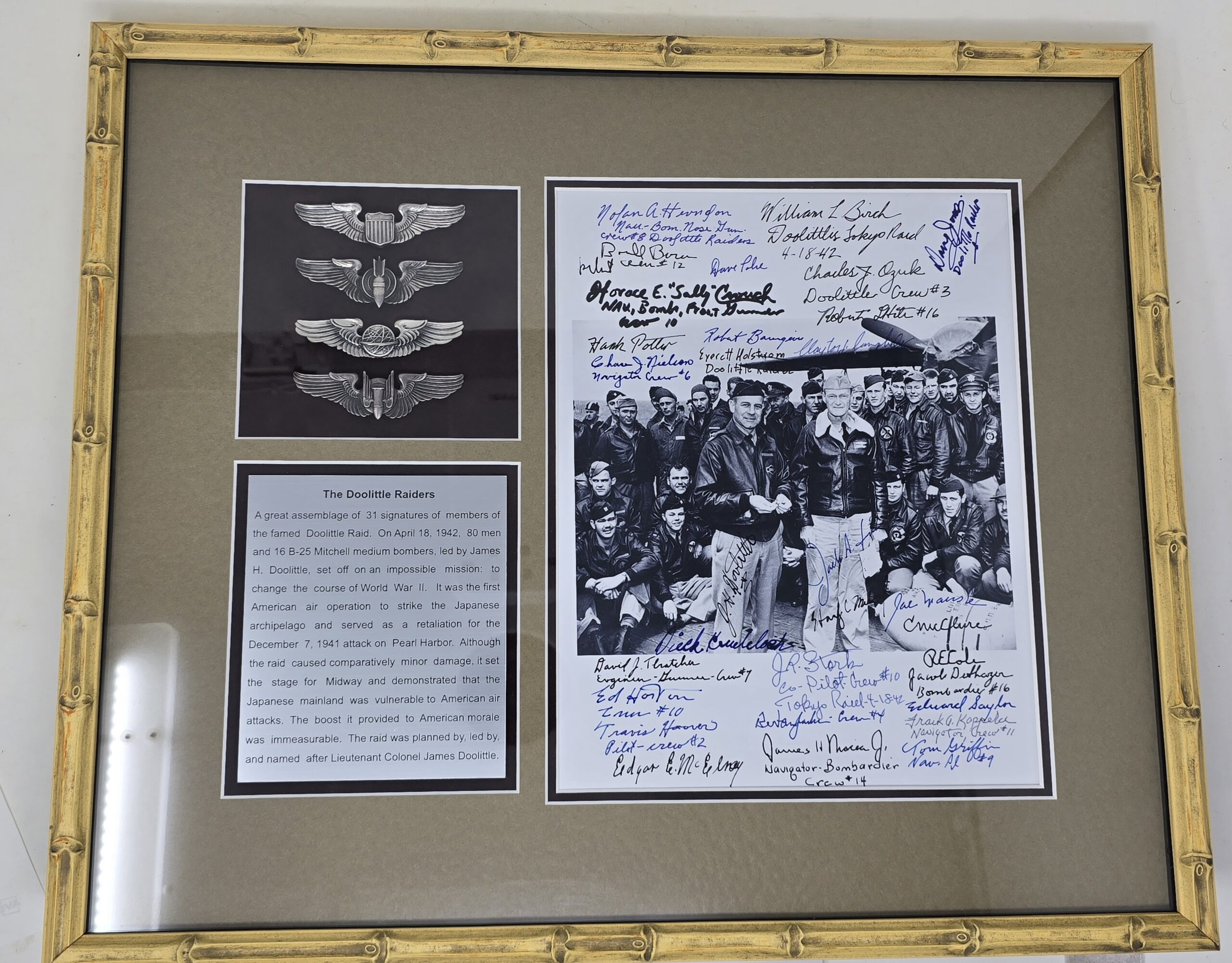 Another beautifully framed photograph of the B25 Mitchell Bomber and Crew from the famous Doolittle Raid on Tokyo. Along with the autographs of the Doolittle Raiders, an incredible piece of history ane of the epic events of World War 2. The wings are original US WWII pilots’ wings in silver, hallmarked. (They are NOT the wings of the Doolittle Raiders). A beautiful display for the collection room.