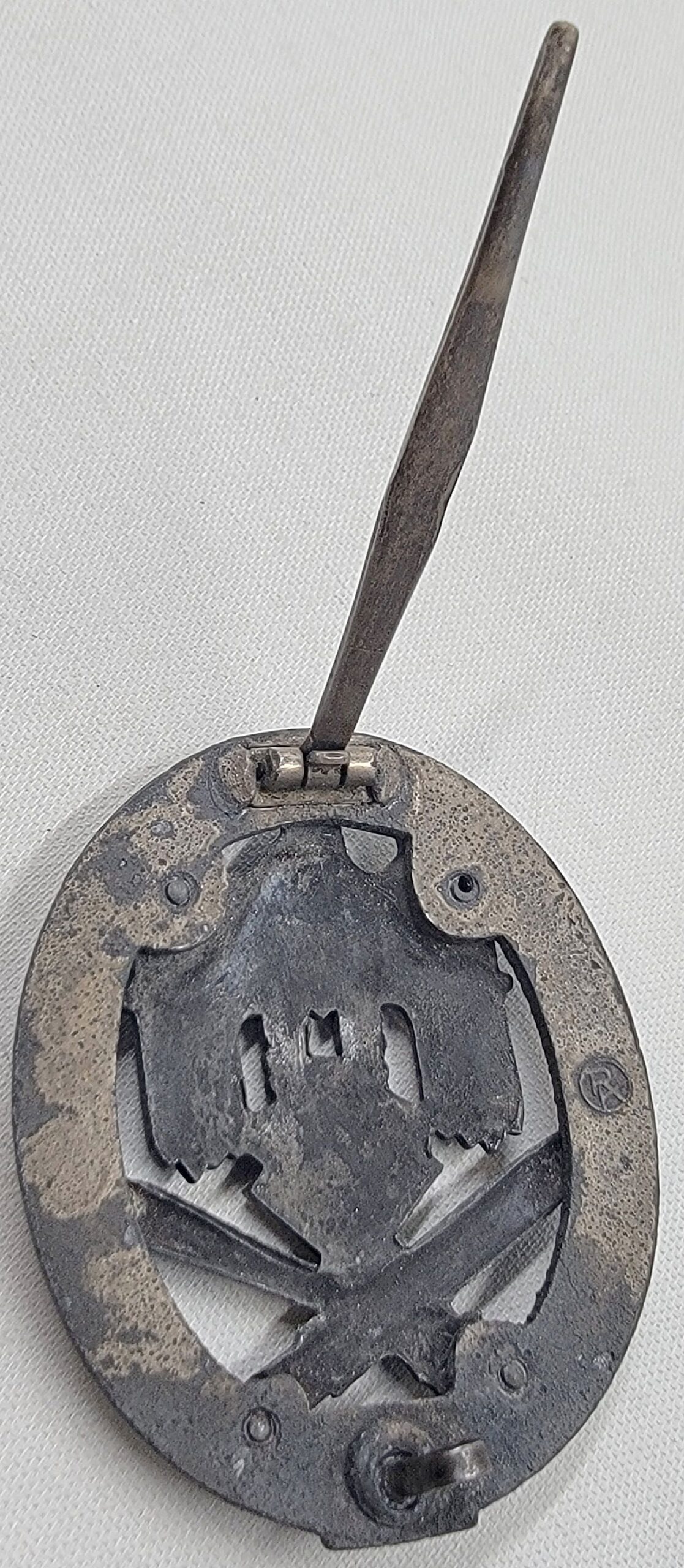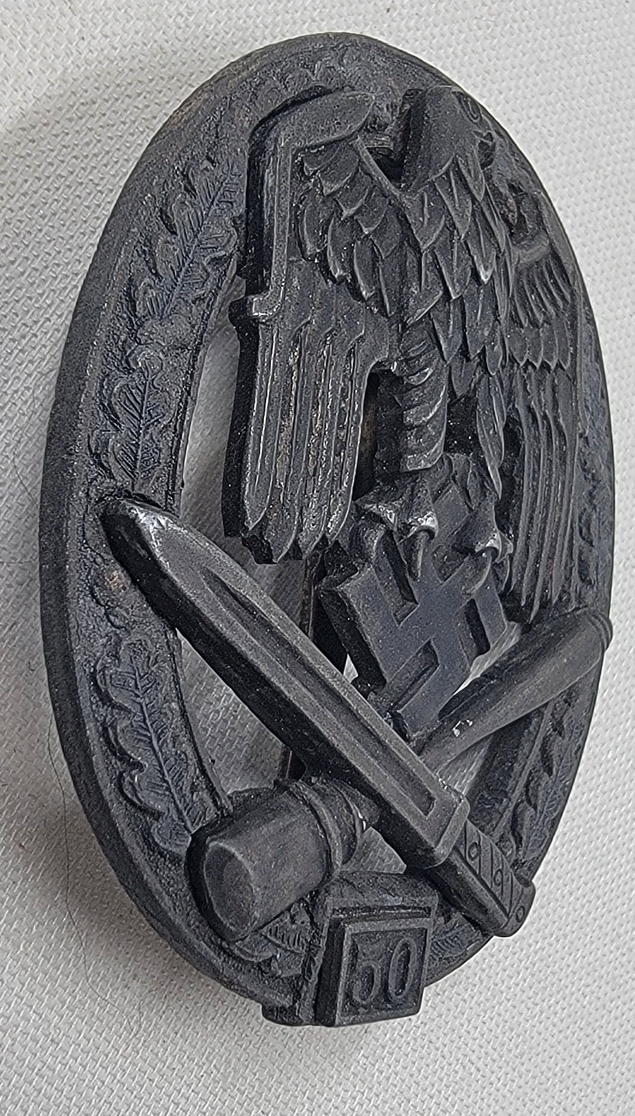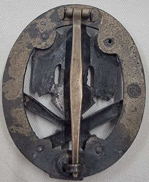 Correct zinc number planchet. Any textbook original 50 Engagement General Assault Badge, is a tough-to-find artifact. Maker marked on the wreath with the stylized RK makers mark of Rudolf Karneth. Super Sharp details intact on the obverse. Traces of the plating remain on the reverse. All fittings are secure. A direct Veteran purchase by consignor over 4 decades ago. COA accompanies.