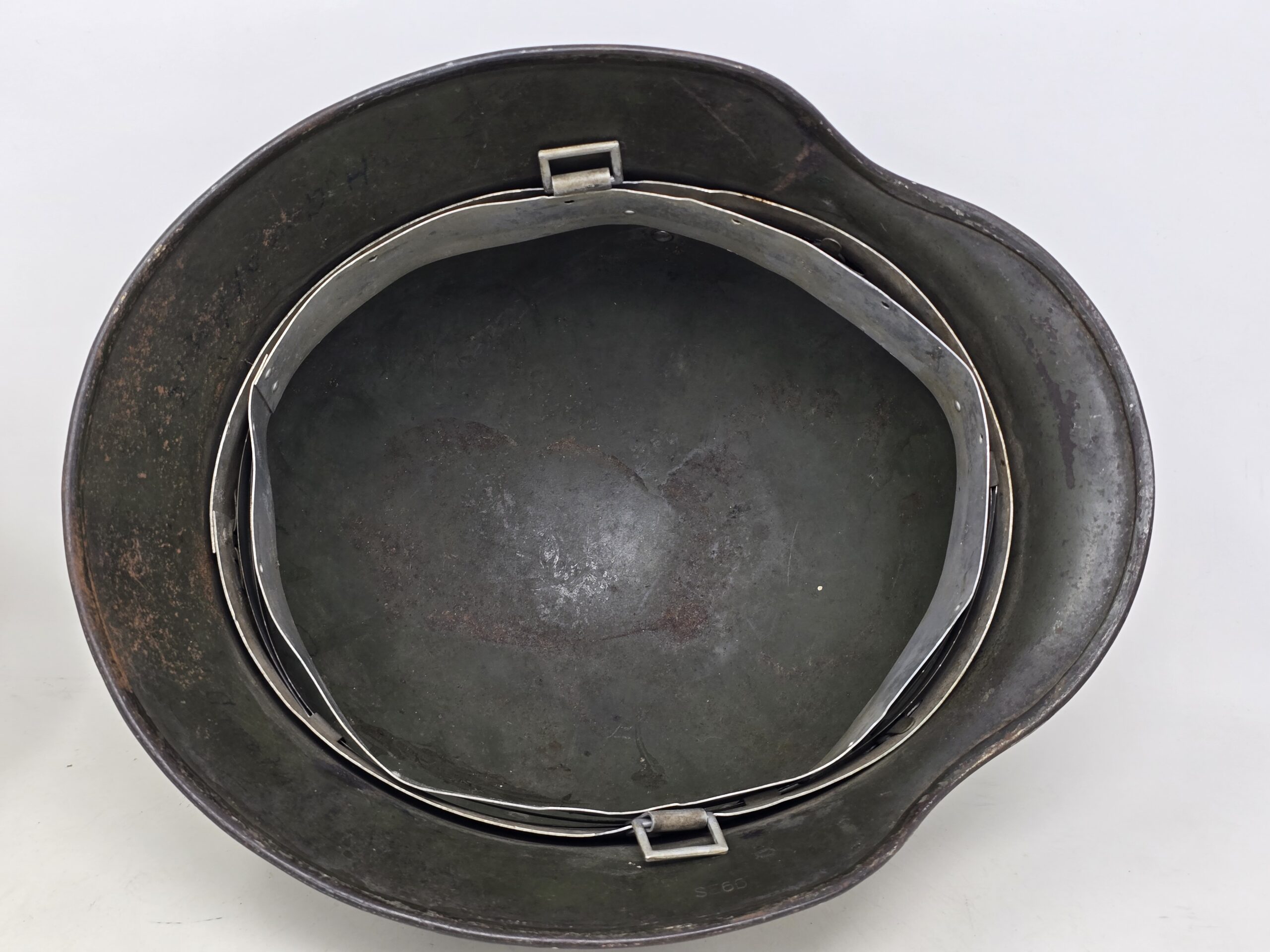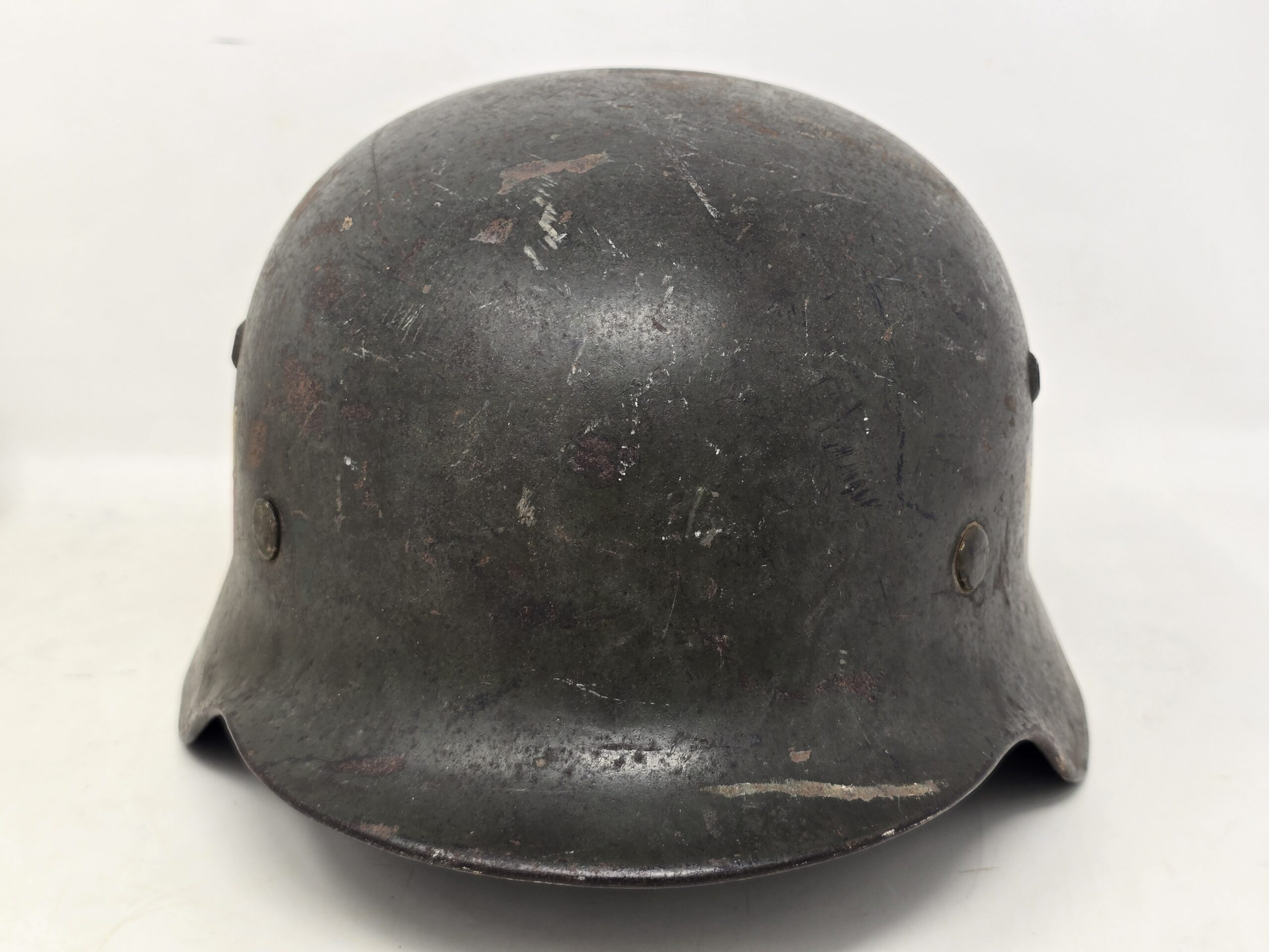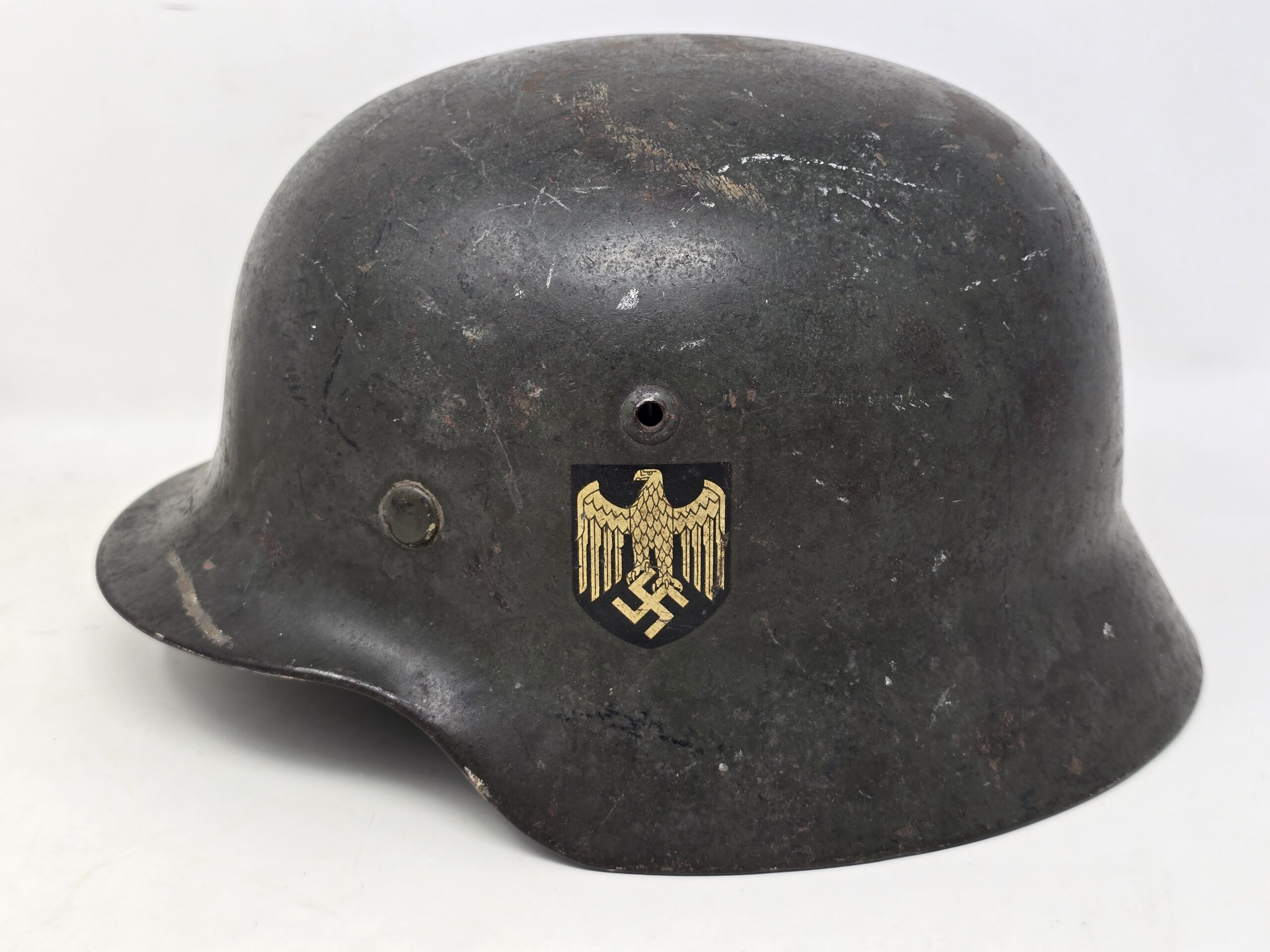 This heer M35 double decal is SE66,  Heat-lot, number #669. The Adler shield is nearly a 100% condition. The paint overall is mostly complete, but shows a lot of period use and some storage patina. The tricolor shield appears fully to be period hand applied, but upon close observation of the leading edge, one can see that there is a tricolor decal underneath. Based on the authentic appearance of the hand paint, my assessment is it was period touched up, possibly due to being used in a Garrison setting. The liner leather portion is missing. The inner band and outer band are intact. The outermost band is untouched and the pins are fully intact, with the slot washers in place– not moved or changed, which is a plus for liner restoration potential. Nice example, a bit salty, but has that good look. COA accompanies.