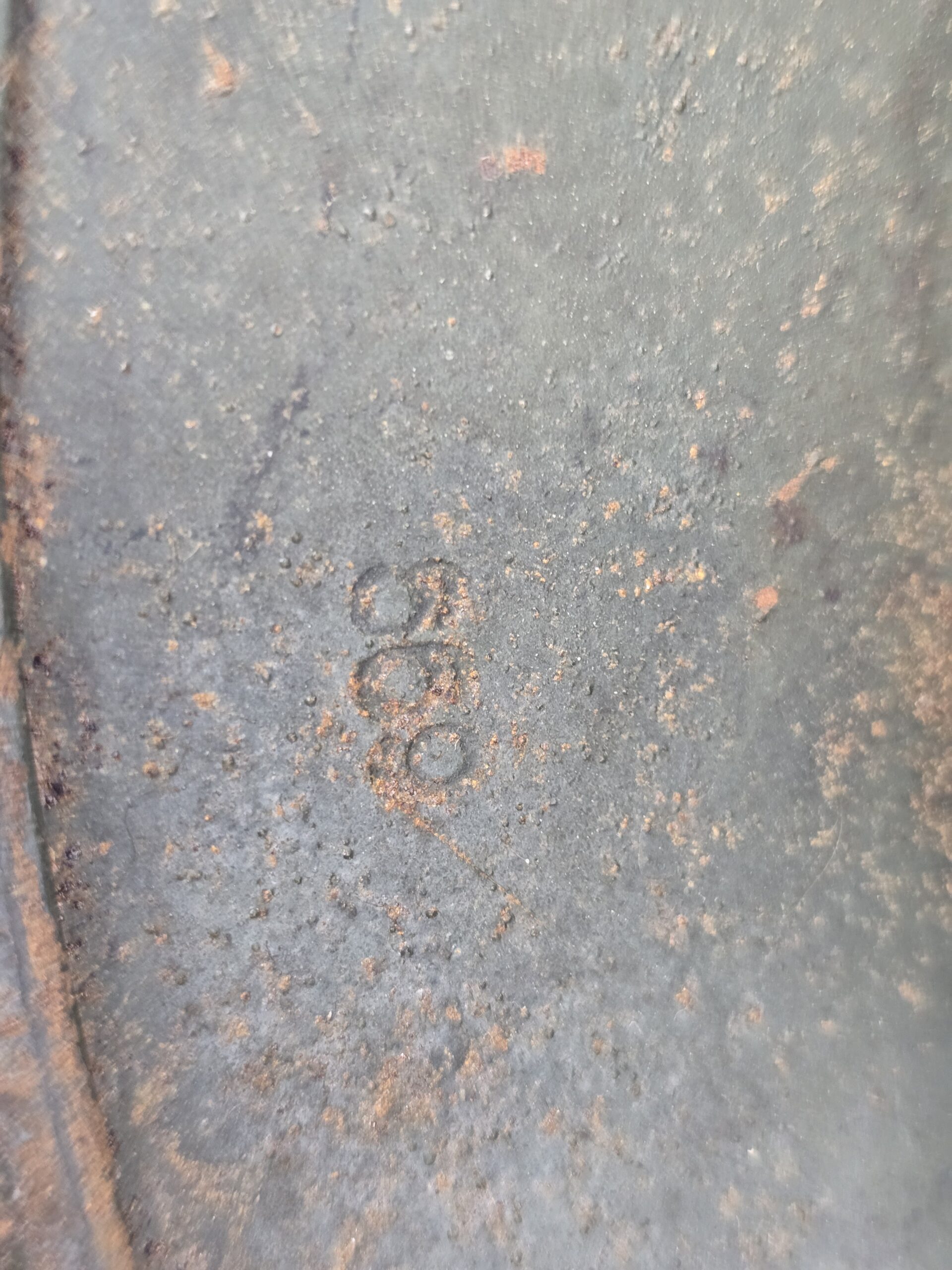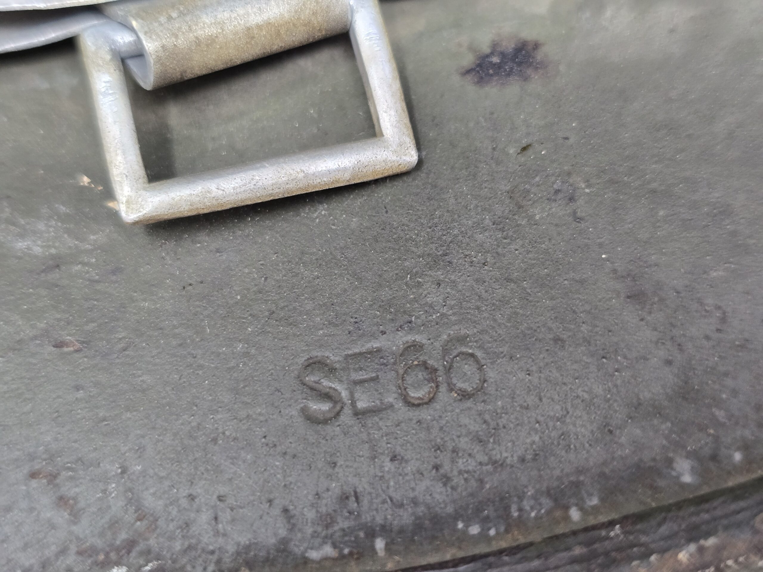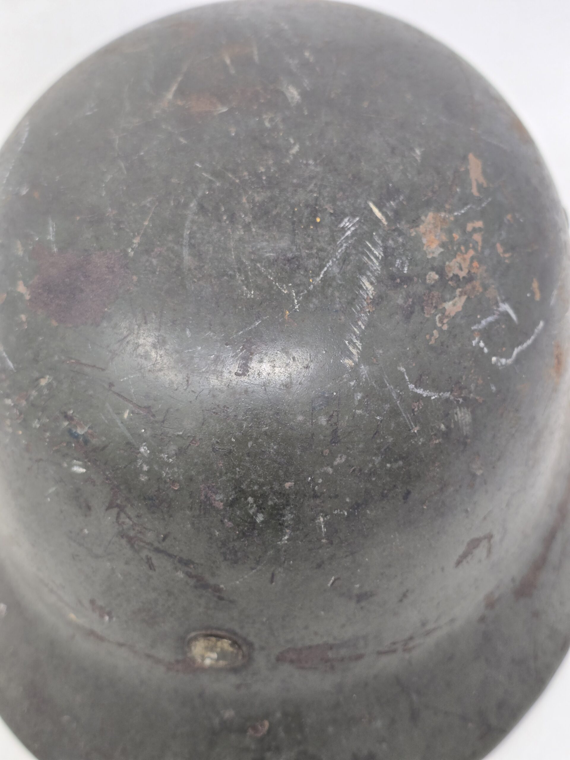 This heer M35 double decal is SE66,  Heat-lot, number #669. The Adler shield is nearly a 100% condition. The paint overall is mostly complete, but shows a lot of period use and some storage patina. The tricolor shield appears fully to be period hand applied, but upon close observation of the leading edge, one can see that there is a tricolor decal underneath. Based on the authentic appearance of the hand paint, my assessment is it was period touched up, possibly due to being used in a Garrison setting. The liner leather portion is missing. The inner band and outer band are intact. The outermost band is untouched and the pins are fully intact, with the slot washers in place– not moved or changed, which is a plus for liner restoration potential. Nice example, a bit salty, but has that good look. COA accompanies.