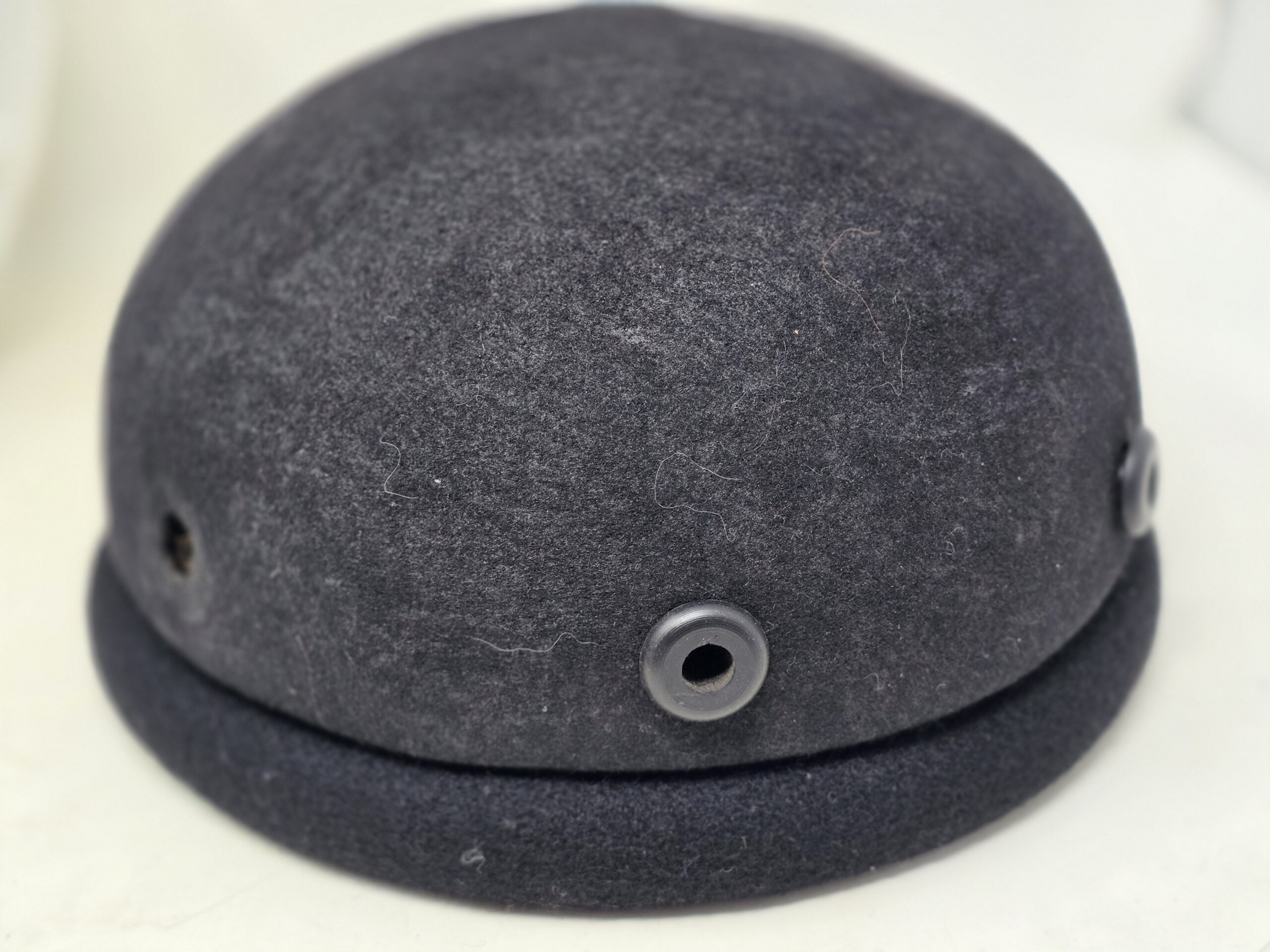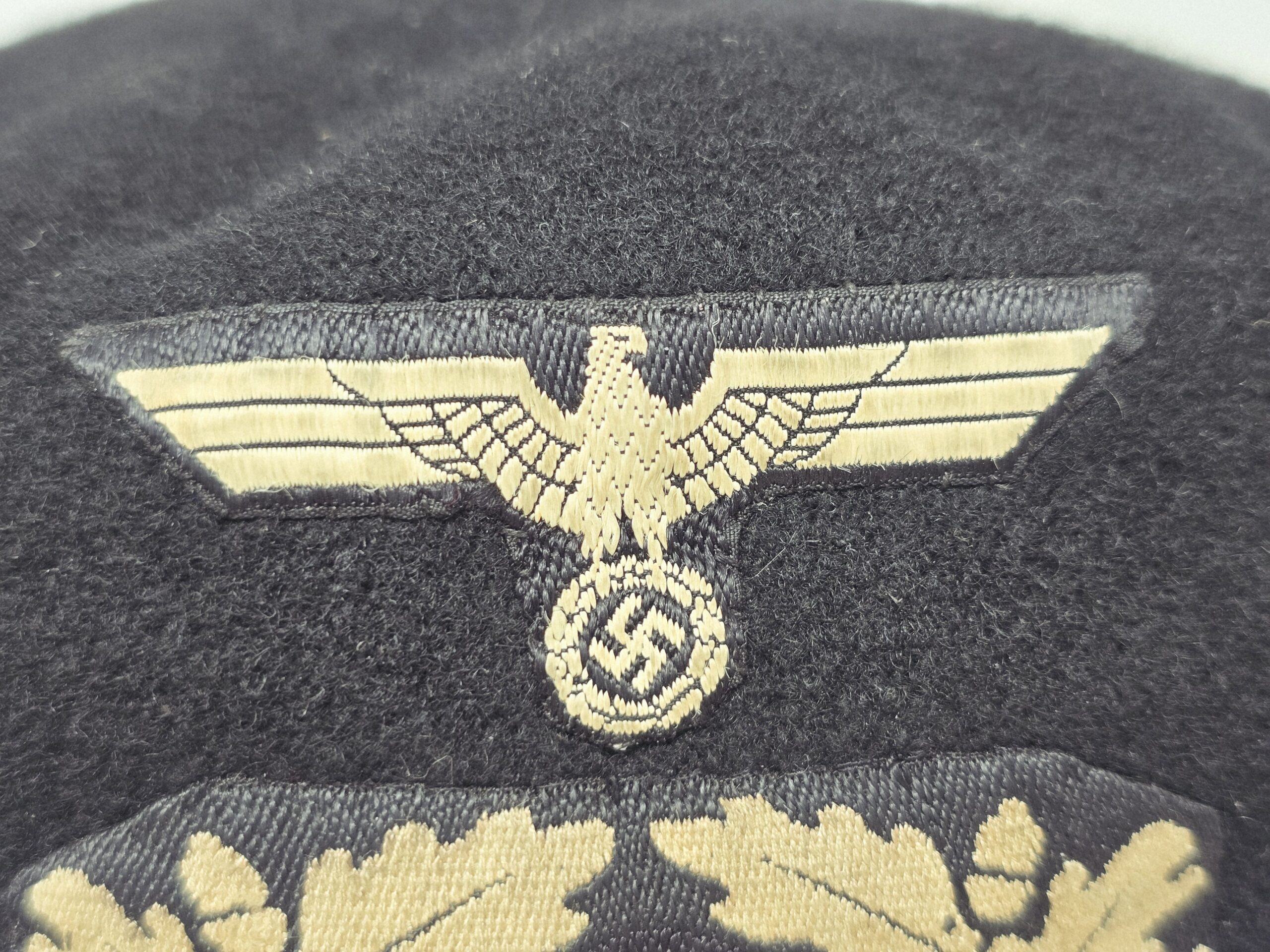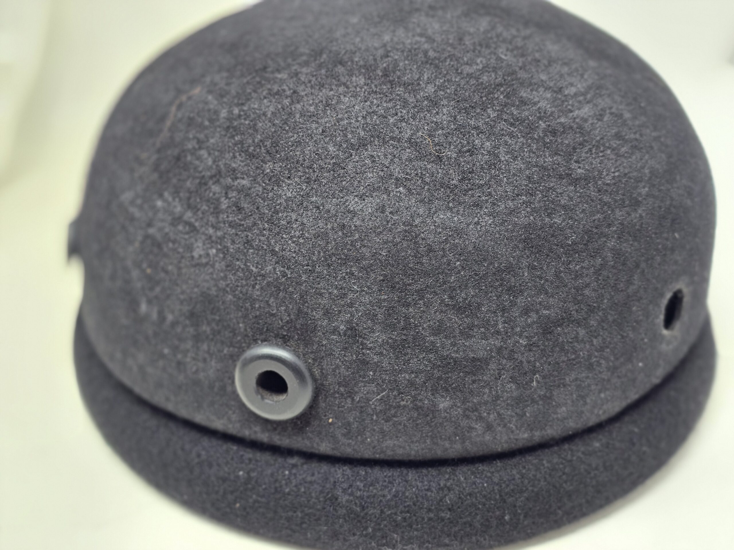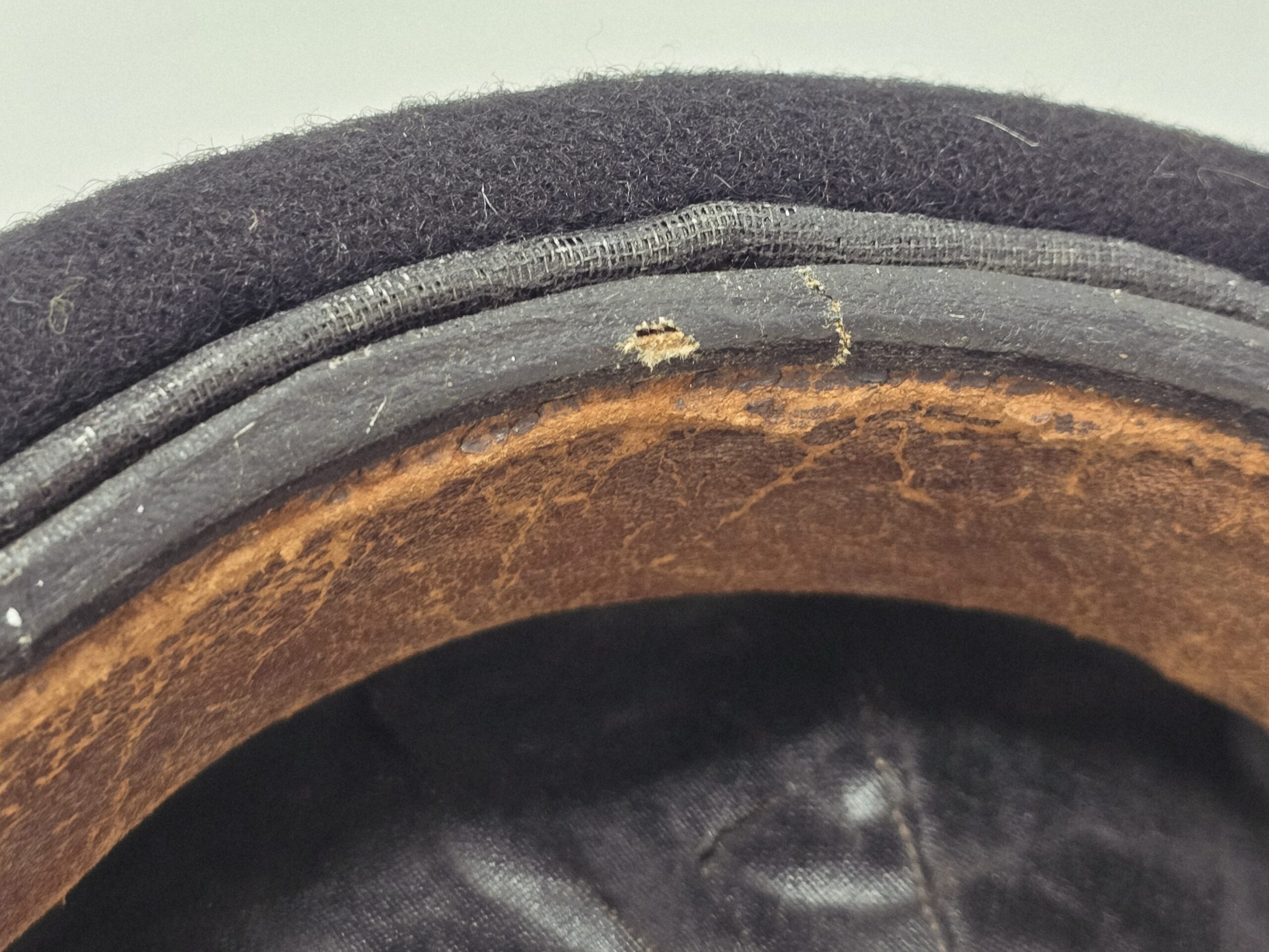 This is a service used, salty heer Panzer Beret, one of the more rare items of field gear in the German inventory. The interior helmet shows a lot of use but is almost fully intact, with just a couple of openings in the coated fabric top– one showing the straw batting on the inside of the interior helmet. There are 2 rubber vent lugs missing. But overall, the helmet maintains the integrity of its shape and solidity. The top cover has its original insignia, showing some fading commensurate with the weathering of the wool. Held up to the light, the wool shows the correct spiral weave that it should have. Again, a rare item, a must have for the early army panzer collection and display. COA accompanies.