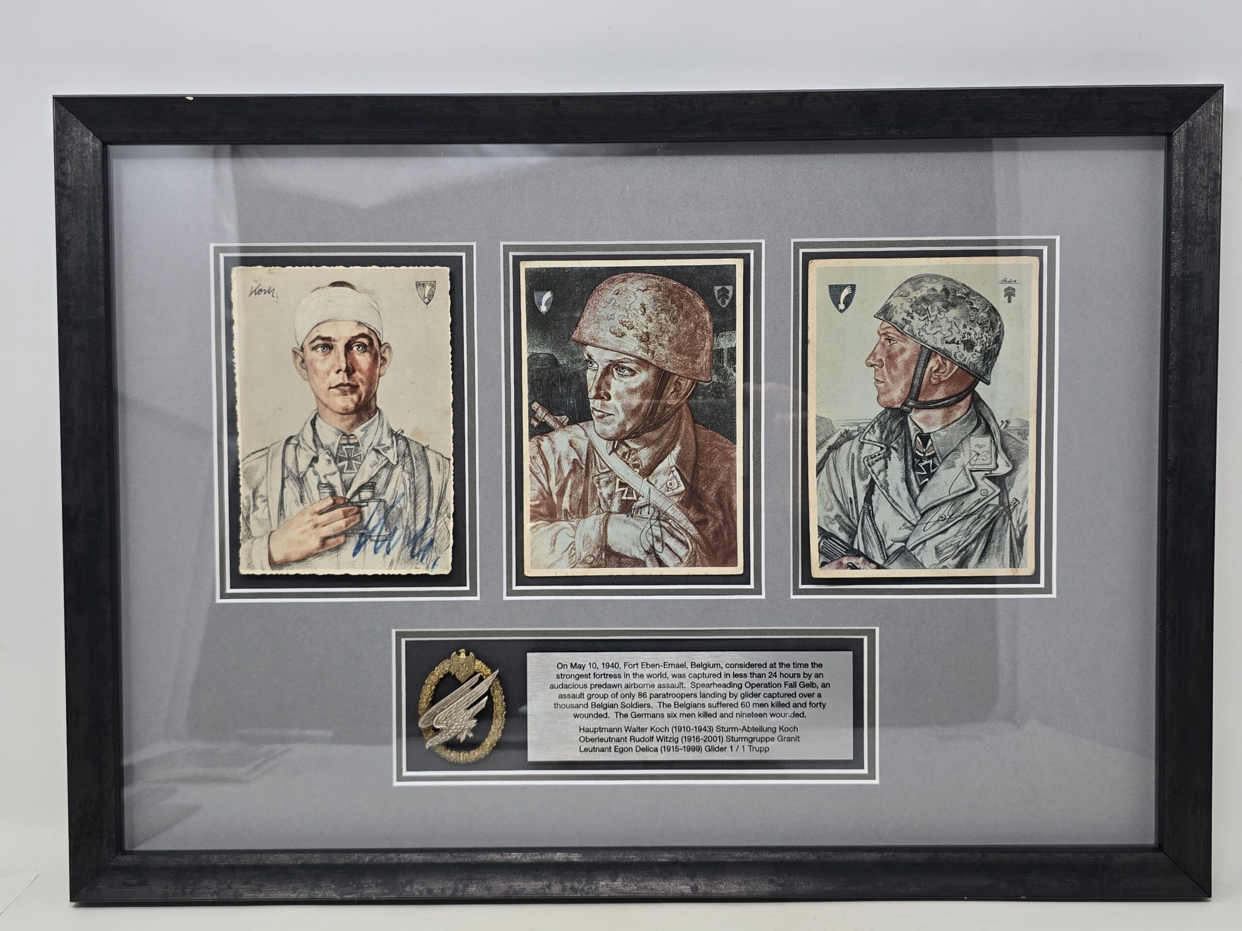 This is a very Collectible assemblage of German Fallschirmjäger- Autographed portrait cards. The portraits are of three of the most famous Eben-Emael veterans, Koch, Witzig and Delica, on their original postcards specially printed from artist portraits of them, for handing out. As the plaque on the assemblage implies, this was one of the most audacious operations in military history. A very interesting, unique and rare set of autographs, for the advanced FJ collector. COA accompanies.