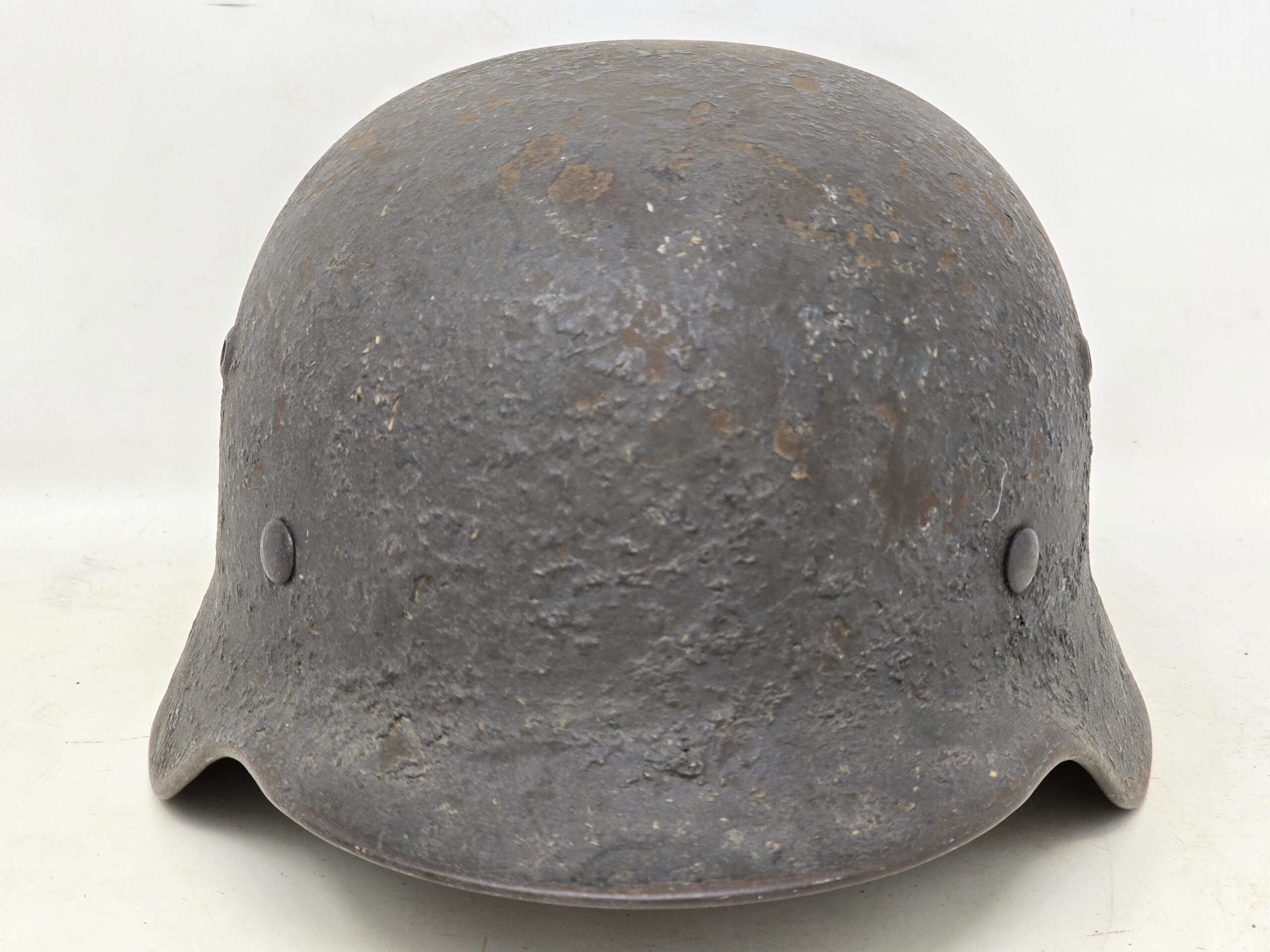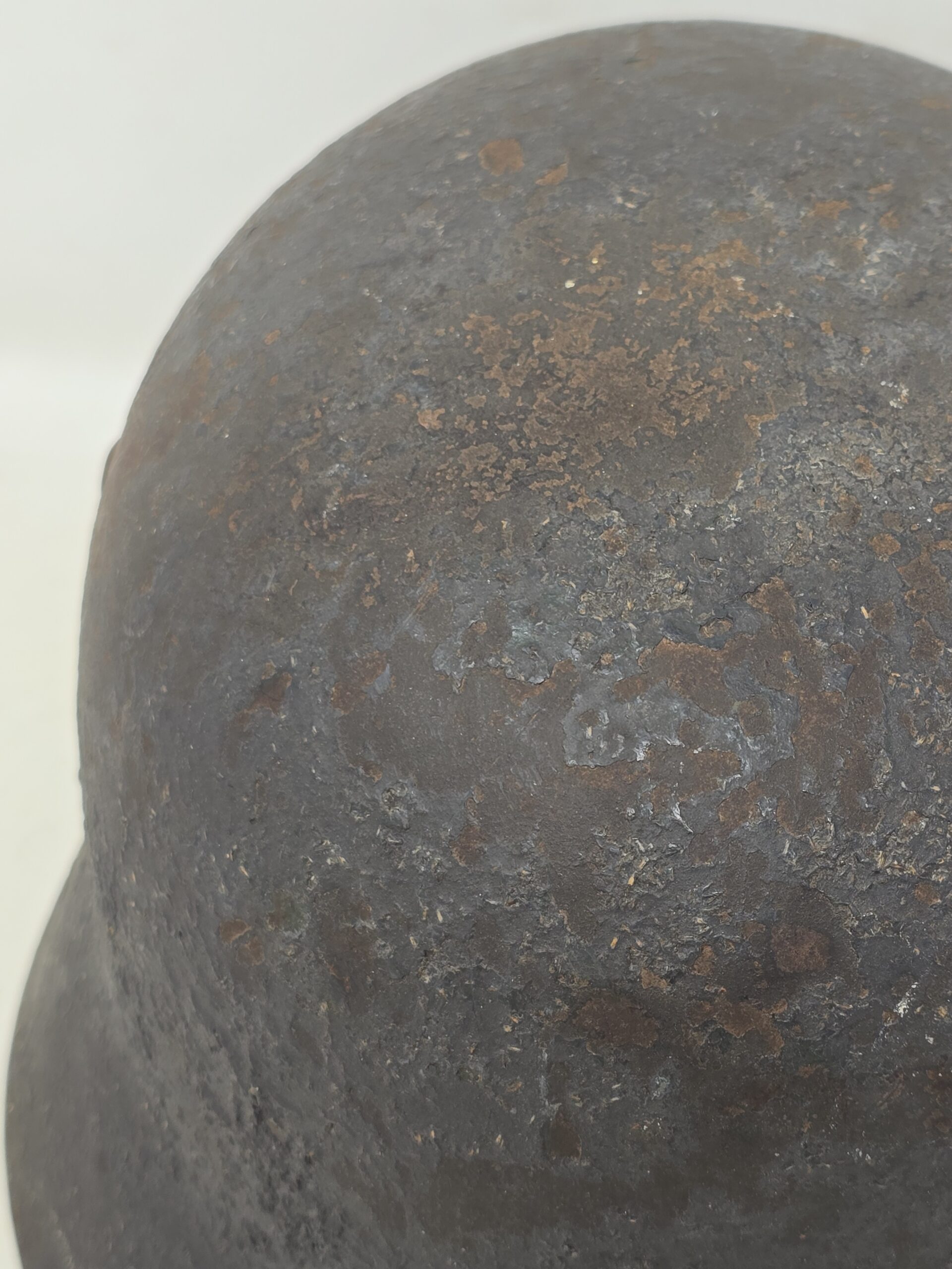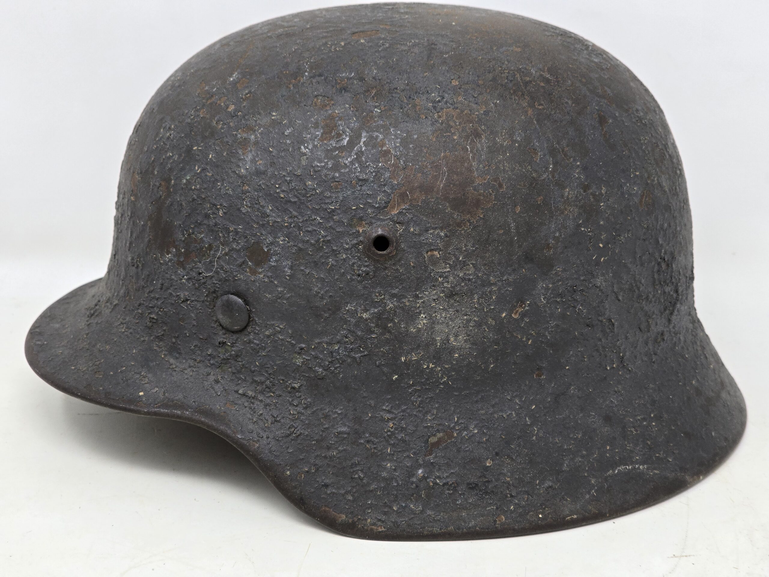 As camo helmets go, monochrome examples tend to be overlooked. But this one is definitely a head-turner. It consists of a reissue M35 Luftwaffe, SE64 (heat lot number invisible), that has been overpainted in a thick grey vehicle paint, heavily textured with dirt / mud. This creates a camouflage resembling a stone. The M40 style reissue liner and chinstrap are complete and show light service wear, commensurate to the light wear of the helmet. Pins are untouched intact. Period videos often show helmets camouflaged in this manner for street fighting. Same videos show LW troops participating in street fighting in Warsaw and other cities during the Eastward drive. A great helmet, with battlefield appeal. COA accompanies.