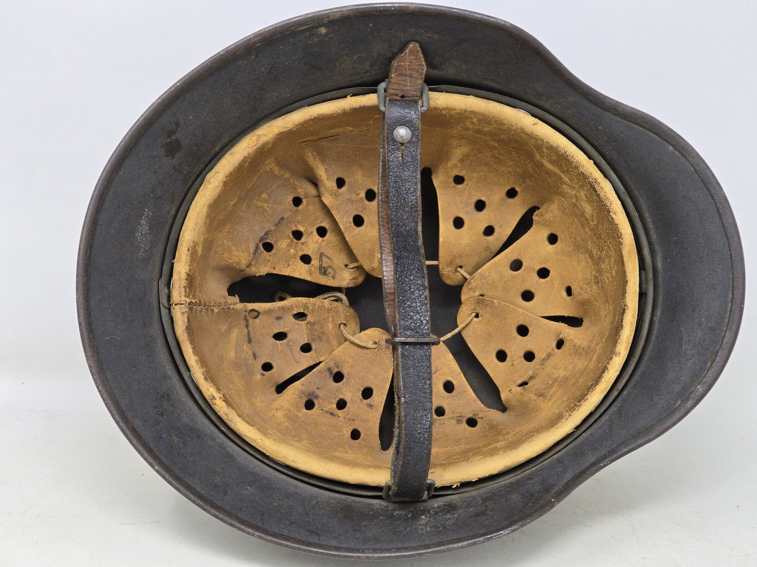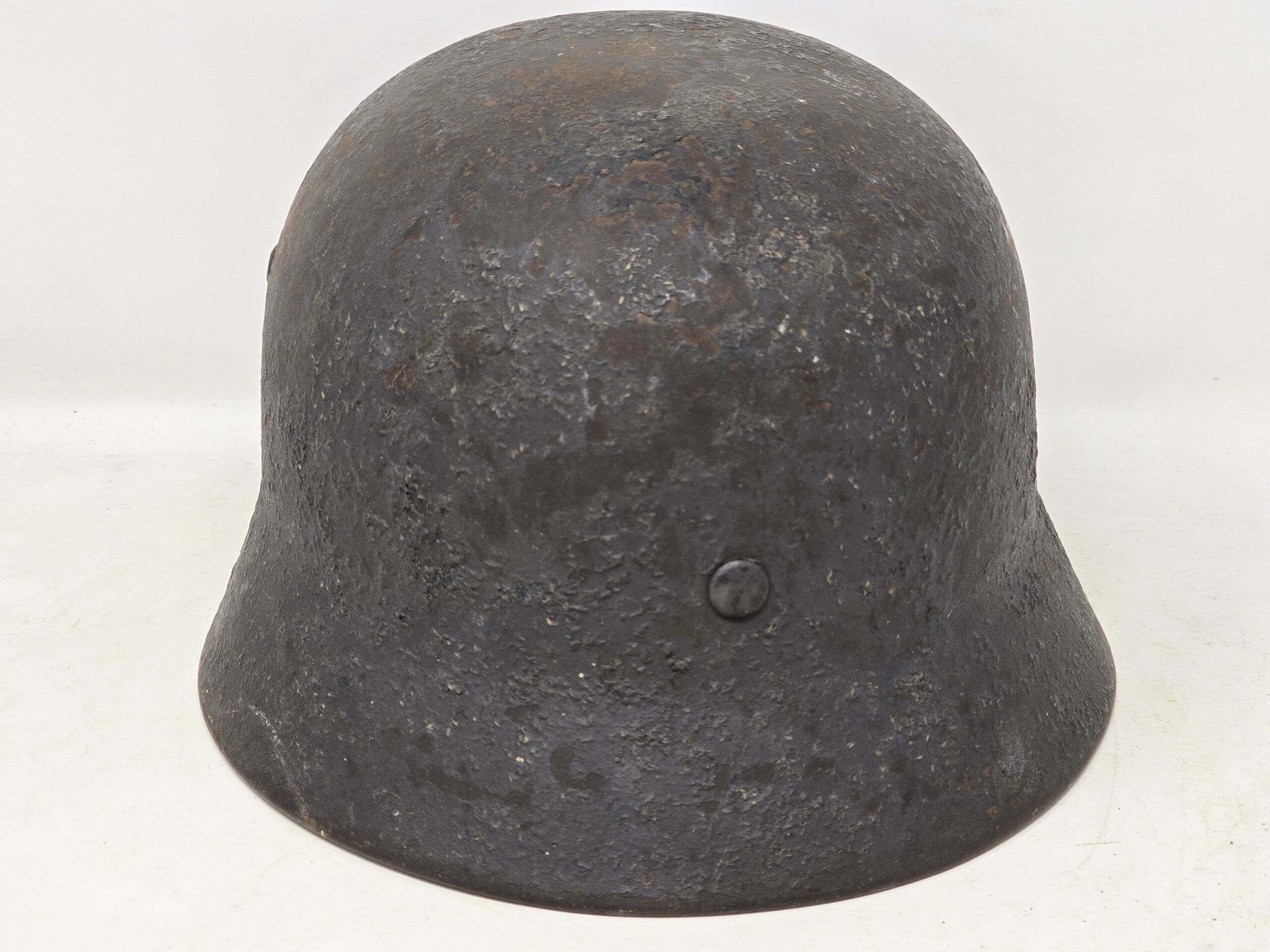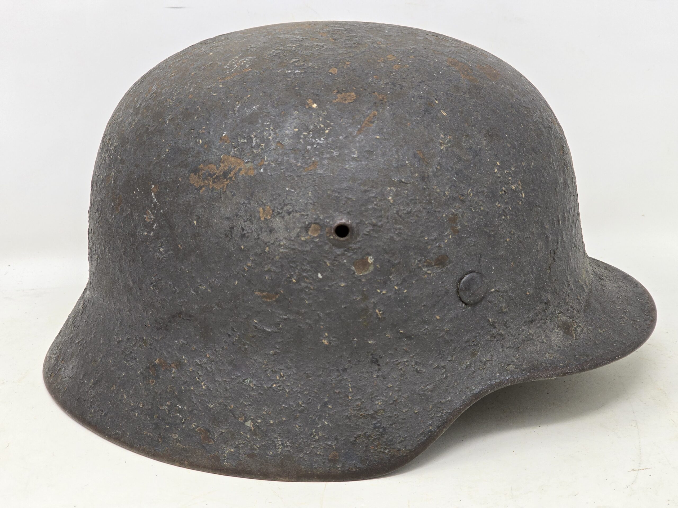As camo helmets go, monochrome examples tend to be overlooked. But this one is definitely a head-turner. It consists of a reissue M35 Luftwaffe, SE64 (heat lot number invisible), that has been overpainted in a thick grey vehicle paint, heavily textured with dirt / mud. This creates a camouflage resembling a stone. The M40 style reissue liner and chinstrap are complete and show light service wear, commensurate to the light wear of the helmet. Pins are untouched intact. Period videos often show helmets camouflaged in this manner for street fighting. Same videos show LW troops participating in street fighting in Warsaw and other cities during the Eastward drive. A great helmet, with battlefield appeal. COA accompanies.