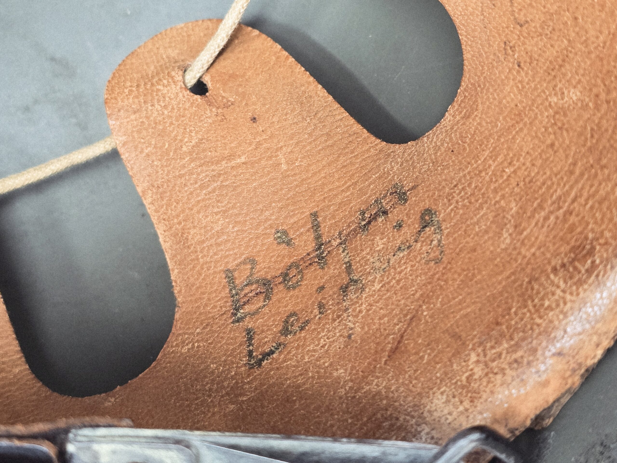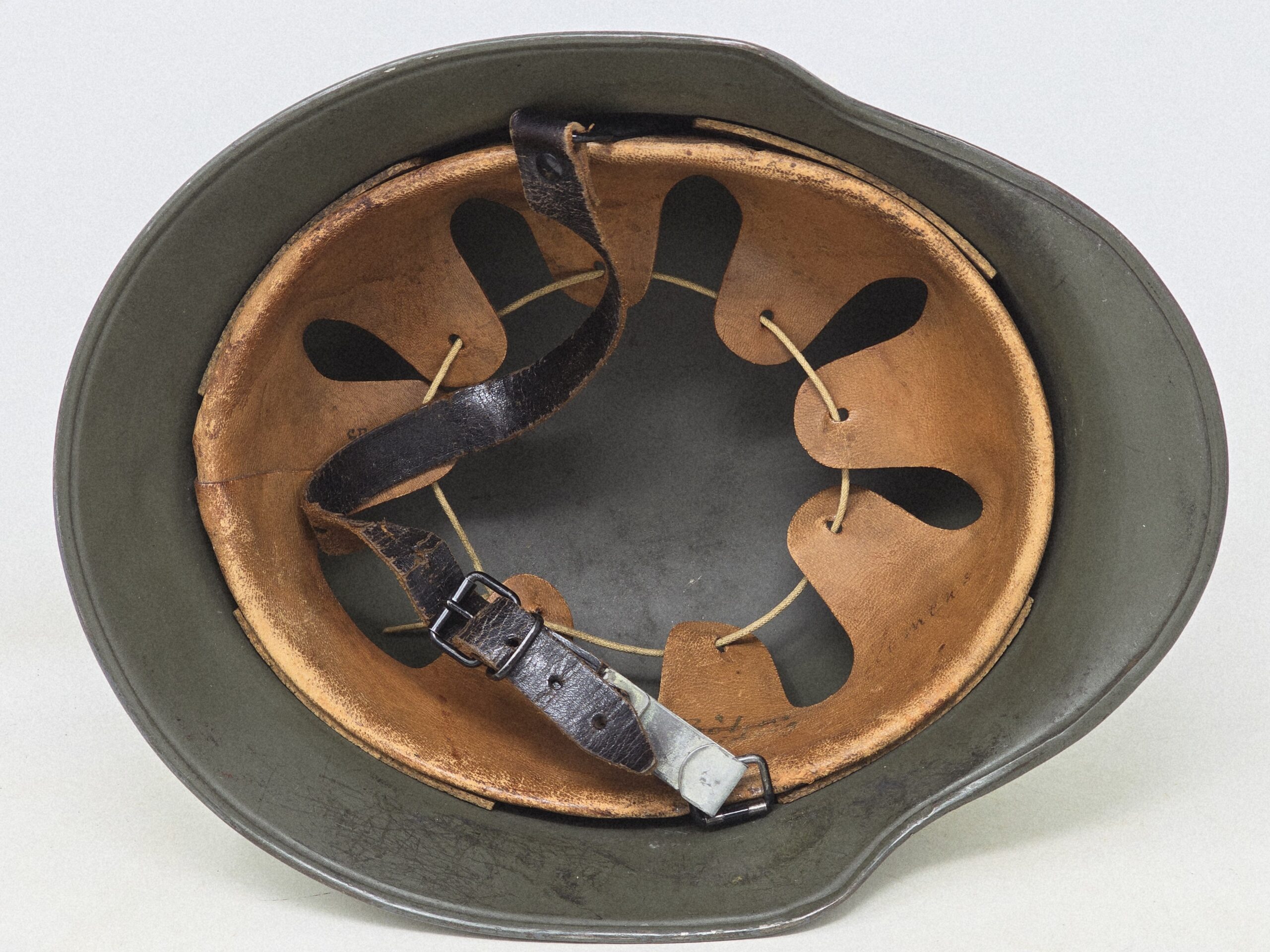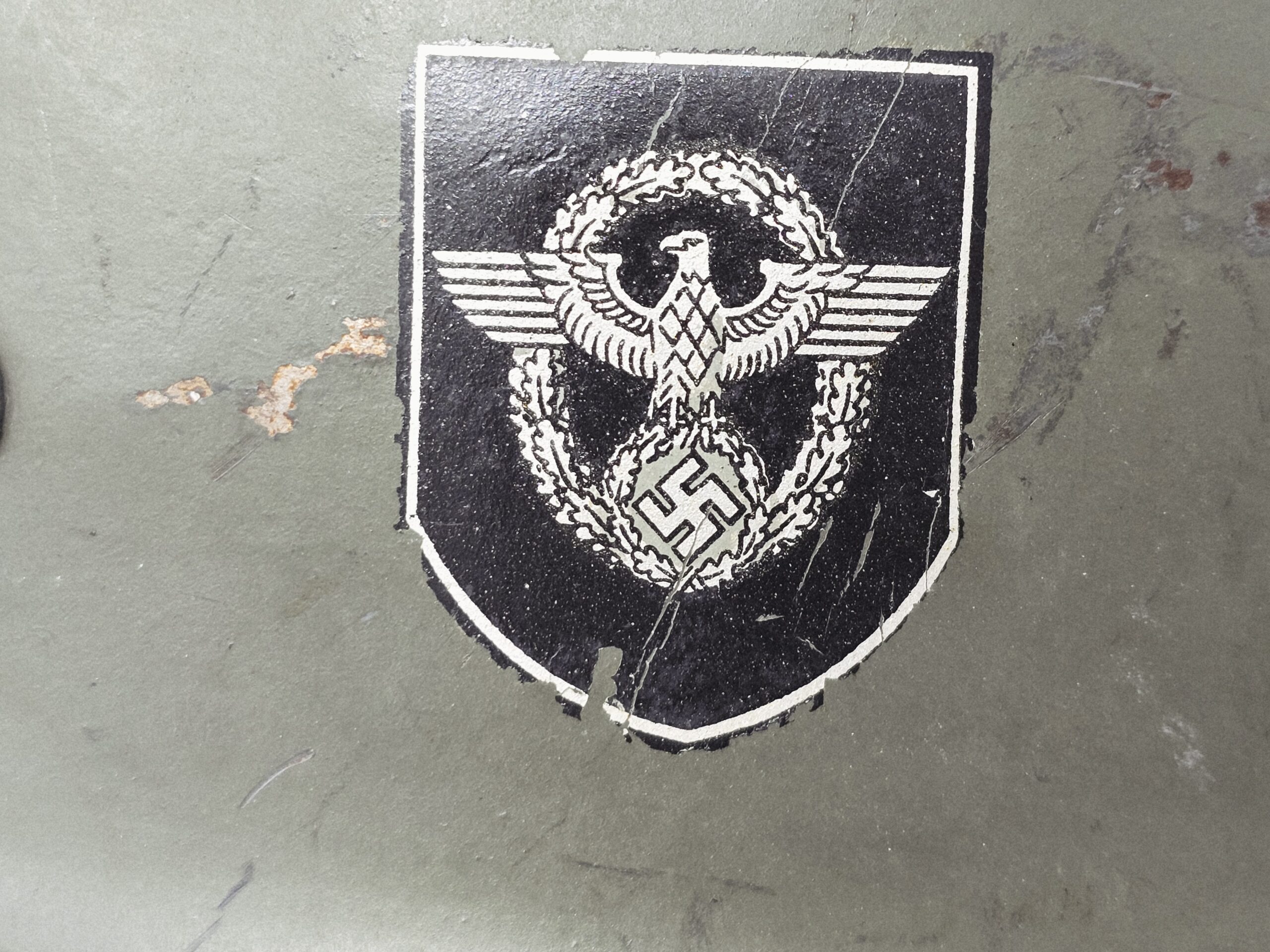 This helmet configuration is normally seen with SS decals, as this was the universal SD helmet style most often encountered. The decals are the unbordered Polizei, in fine condition. The paint is also fine, with moderate service use indicated. Slight ding on the rear of the helmet shell. The liner and strap show light use, and there are two names in the helmet. A fine piece for the einsatzkommando display. COA accompanies.
