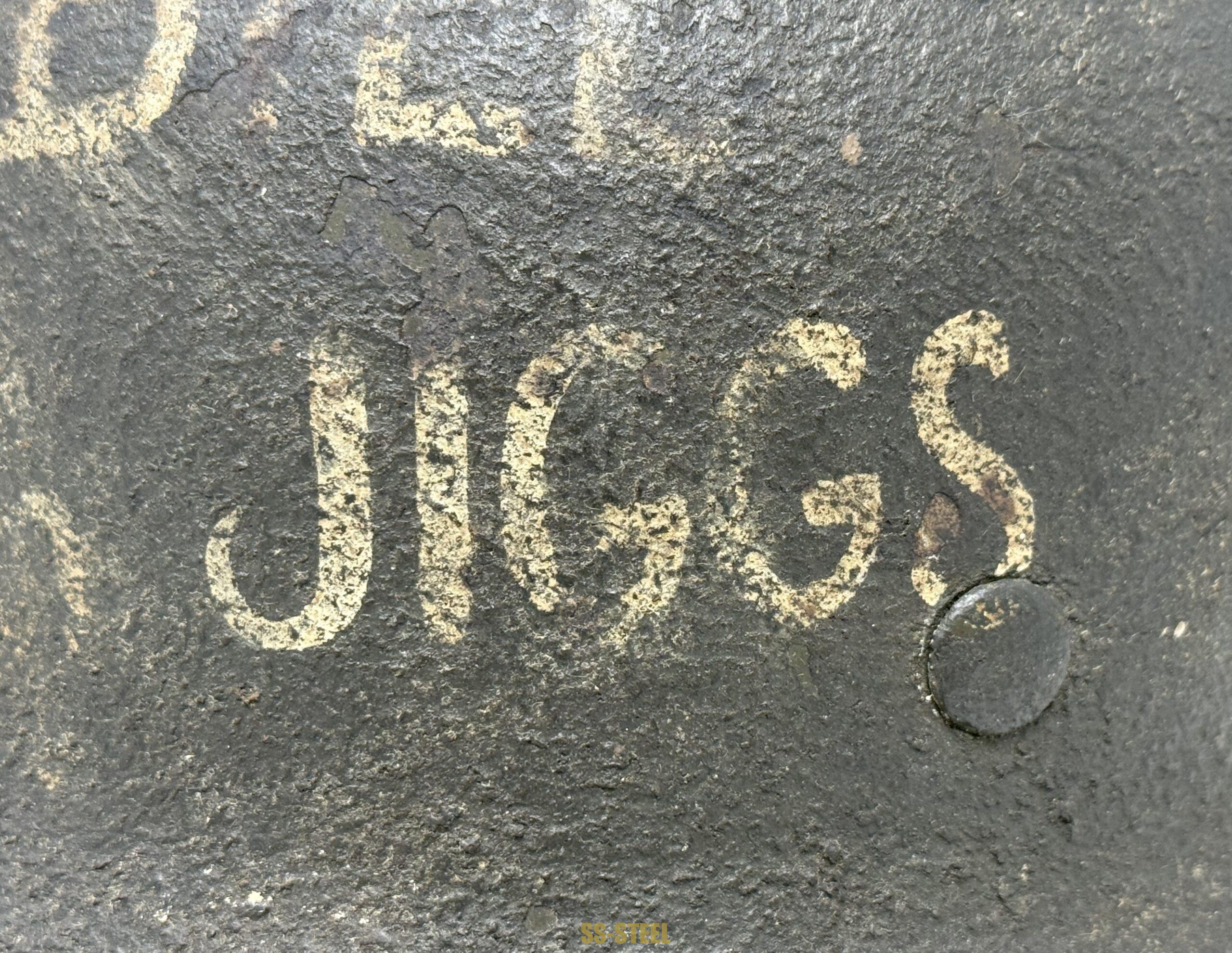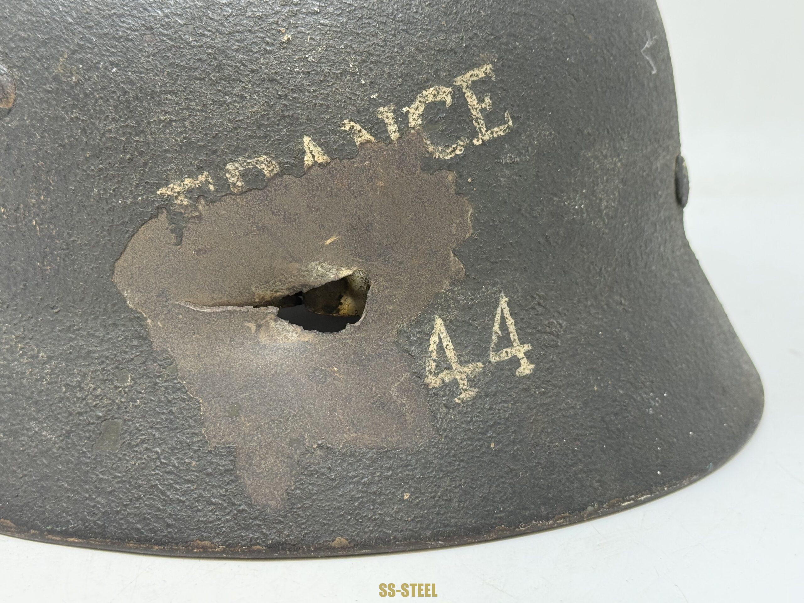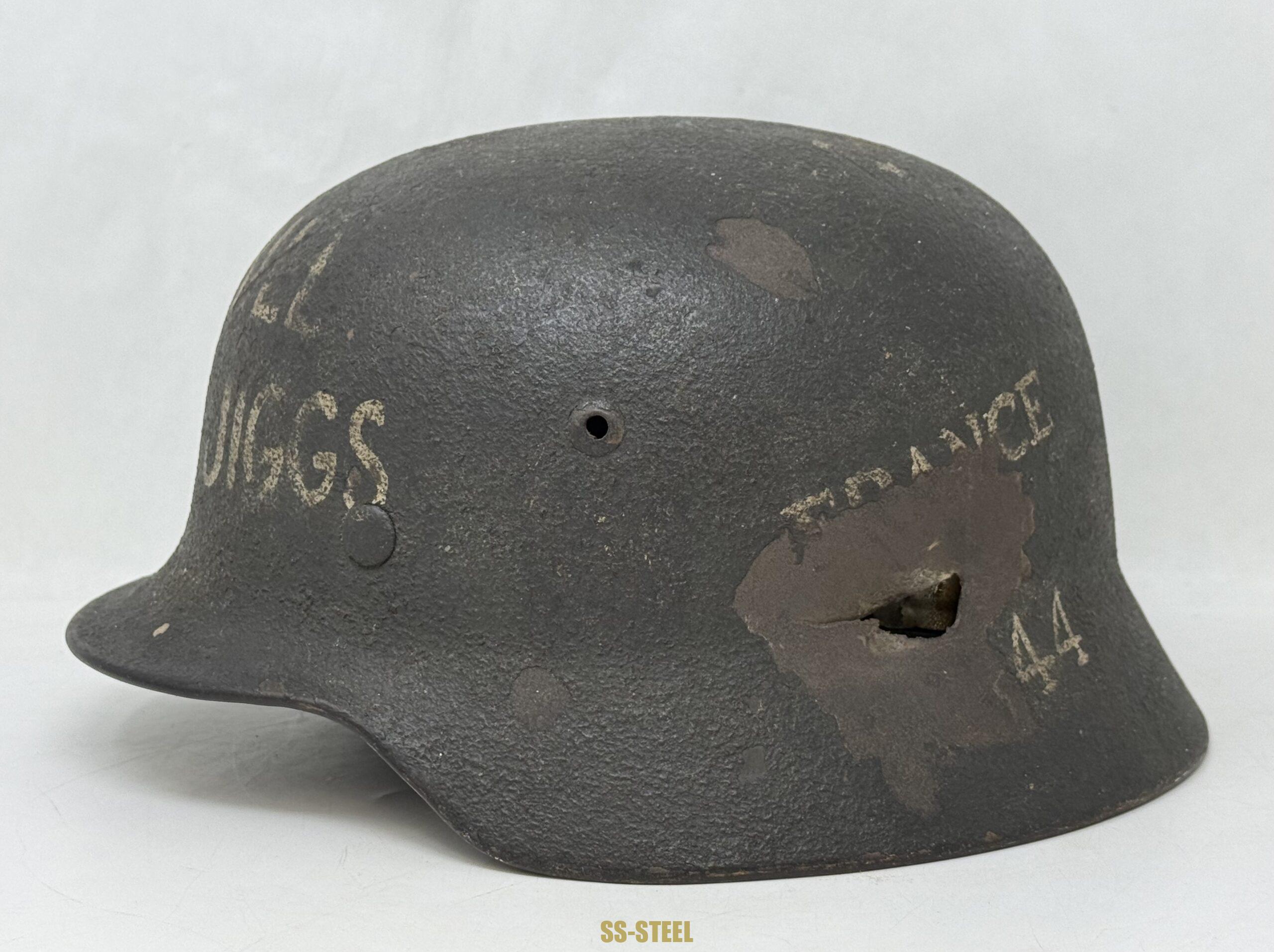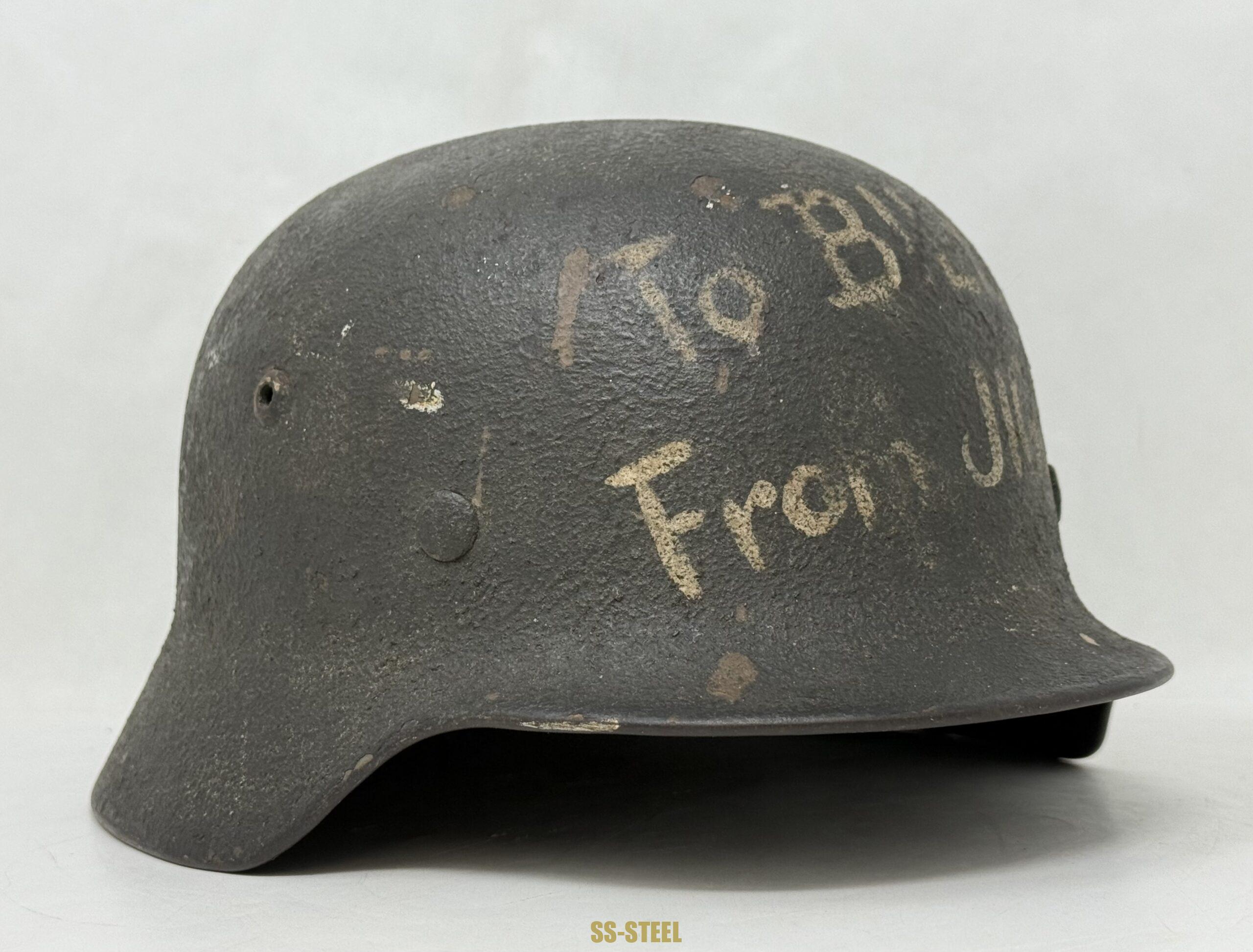 M35 helmet by ET size 66, batch number 4582. Helmet features rough overpaint with Adler decal peeking through the paint finish. The helmet shows what appears to be a bullet strike and the inscription “FRANCE 44” indicating likely a souvenir taken after the Normandy invasion. The inscription was done after the strike to helmet as the letters show faded on the bare metal which did not take as well as the overpaint section. The helmet shows another inscription “TO BILL FROM JIGGS” indicating a gift from US veteran. Helmet is equipped with orignal untouched liner, showing fragmentation damage but is in otherwise good condition. Interesting helmet in a perfect display size. COA accompanies.