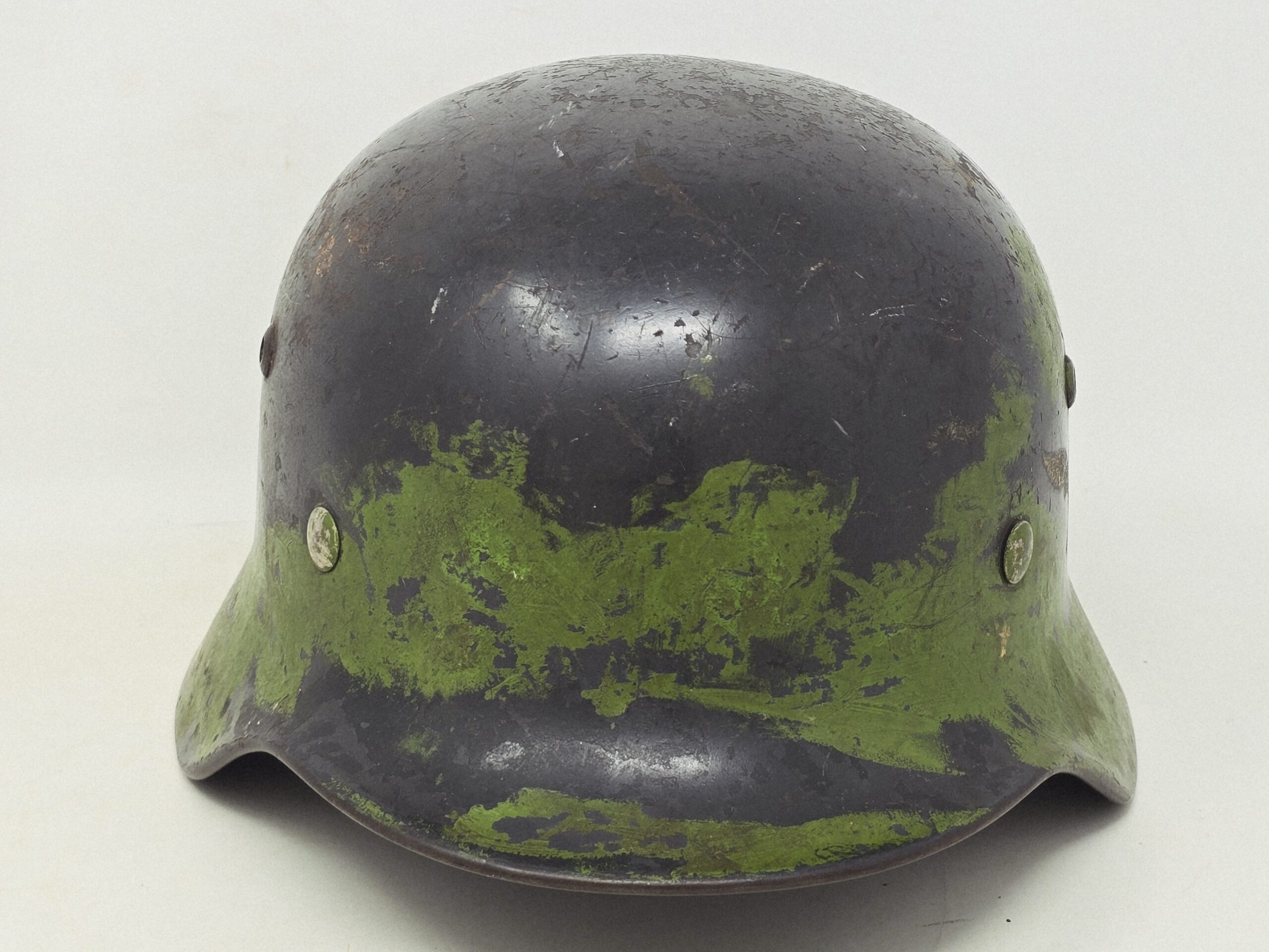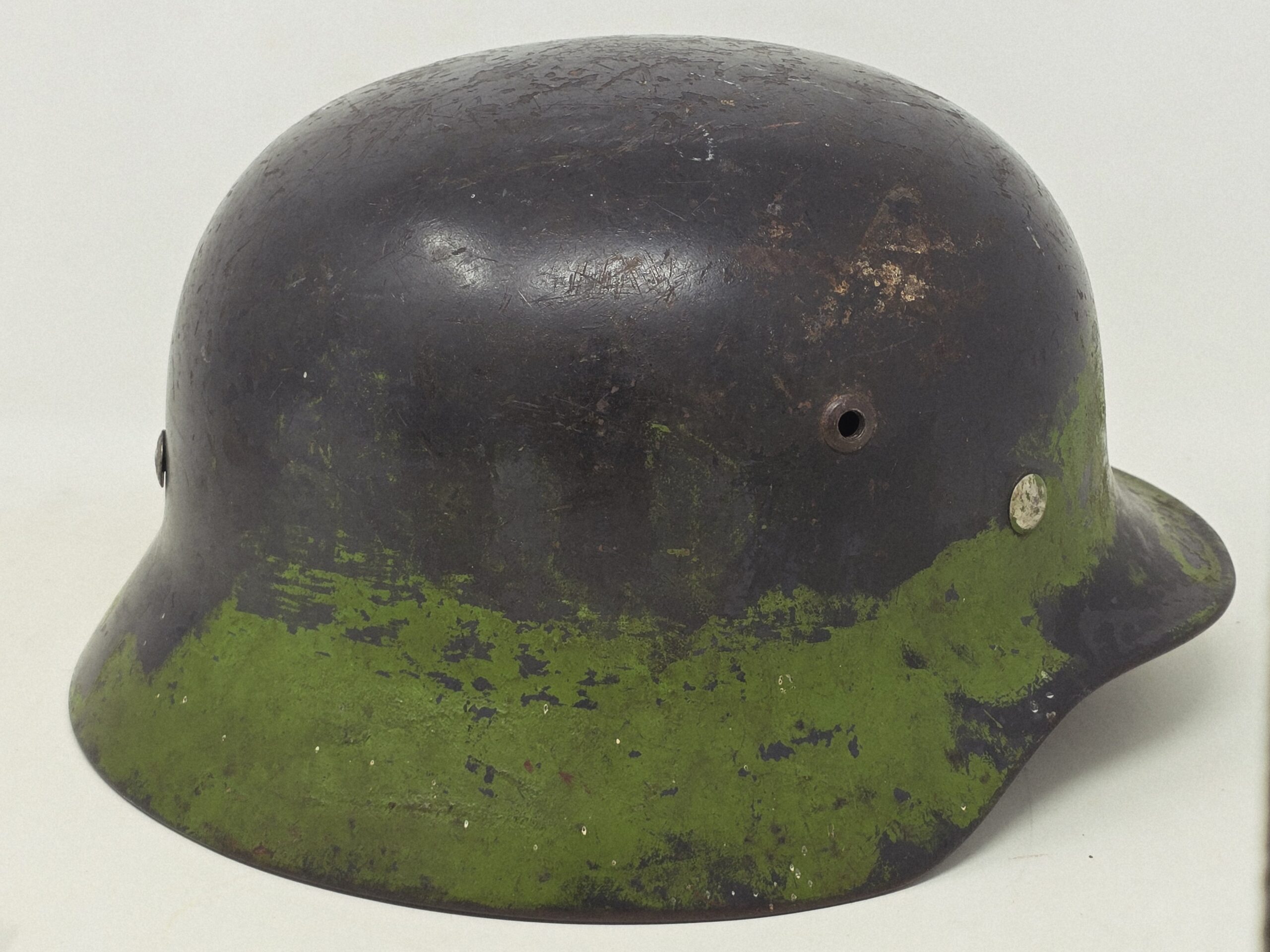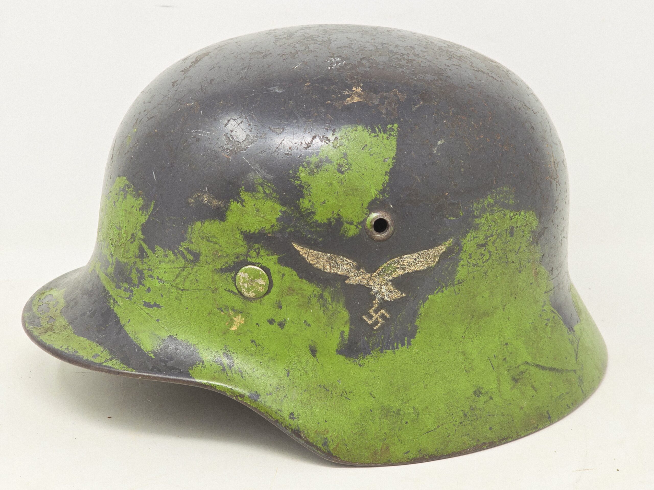 This M35 Luftwaffe helmet is a Q64 with a 4 digit batch number, and bears a partial camouflage finish that appears to have been in conjunction with a burlap cover or other type of upper camouflage. The national colors shield was removed per orders, but the Eagle– very sun-cracked and weathered– is still intact on the left side. The liner shows darkening from extensive wear, and the chin strap is missing. Overall, a great camouflage helmet, likely from the Normandy front. Unusual and a conversation piece! COA accompanies.
