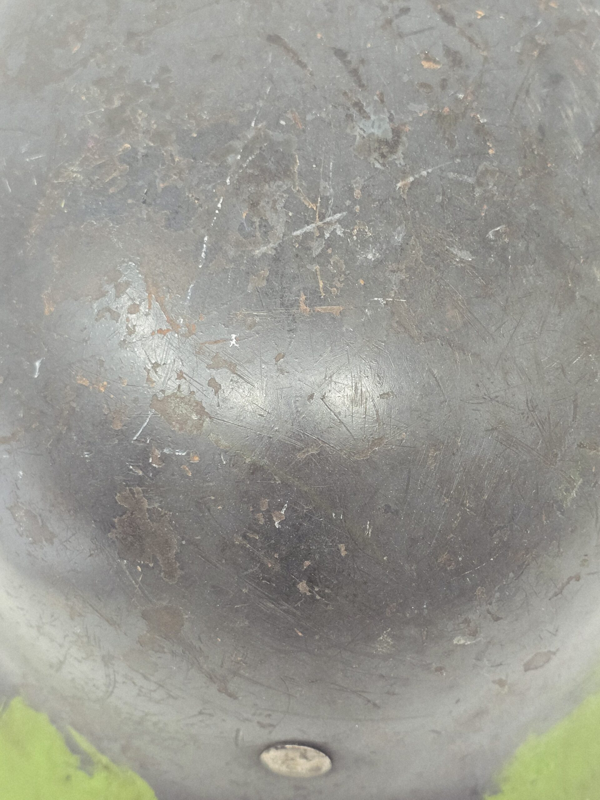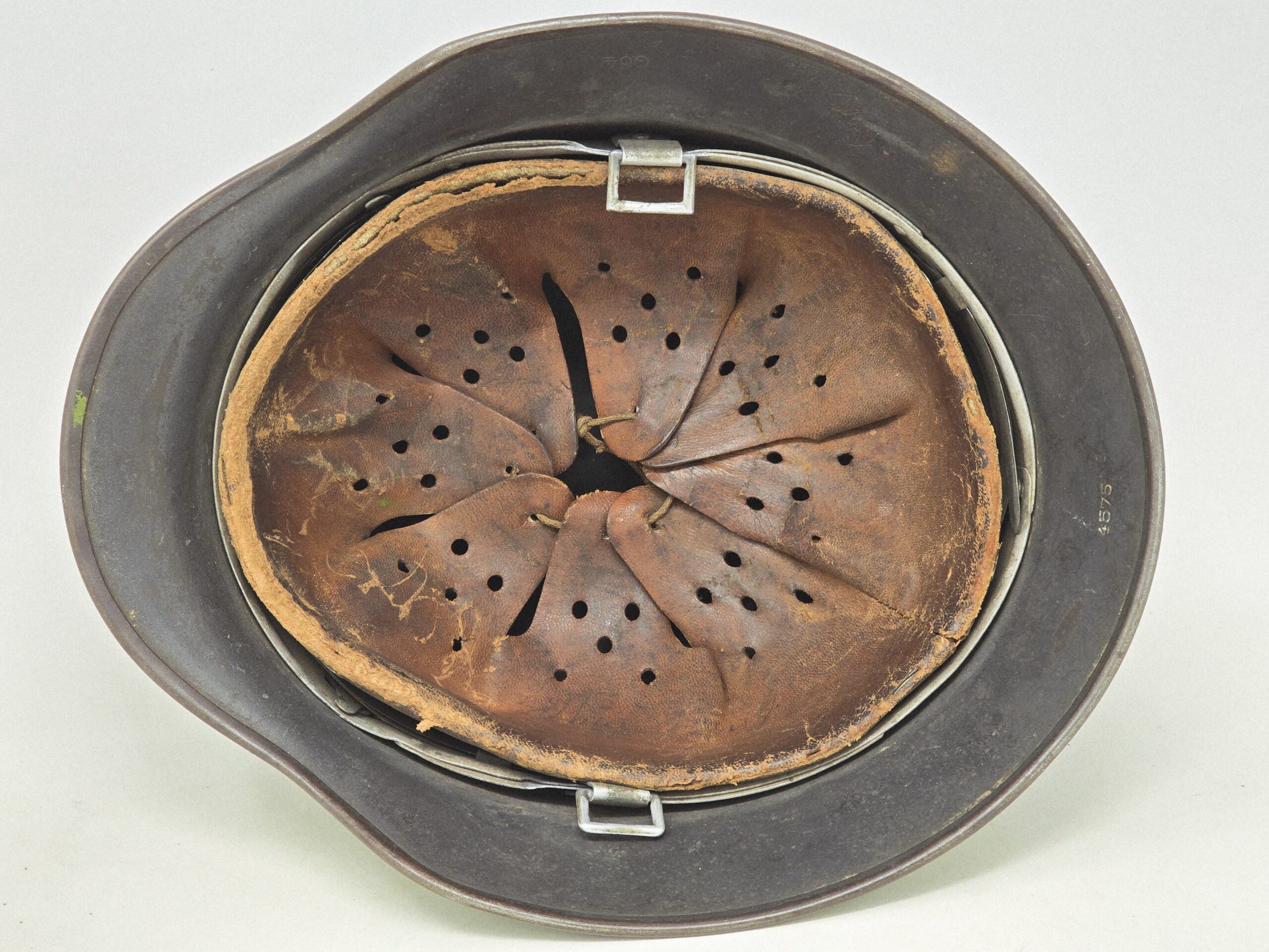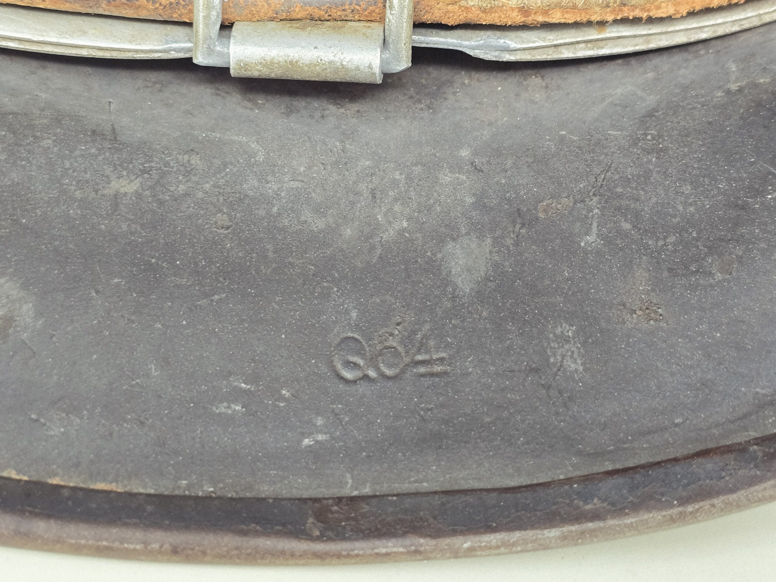 This M35 Luftwaffe helmet is a Q64 with a 4 digit batch number, and bears a partial camouflage finish that appears to have been in conjunction with a burlap cover or other type of upper camouflage. The national colors shield was removed per orders, but the Eagle– very sun-cracked and weathered– is still intact on the left side. The liner shows darkening from extensive wear, and the chin strap is missing. Overall, a great camouflage helmet, likely from the Normandy front. Unusual and a conversation piece! COA accompanies.