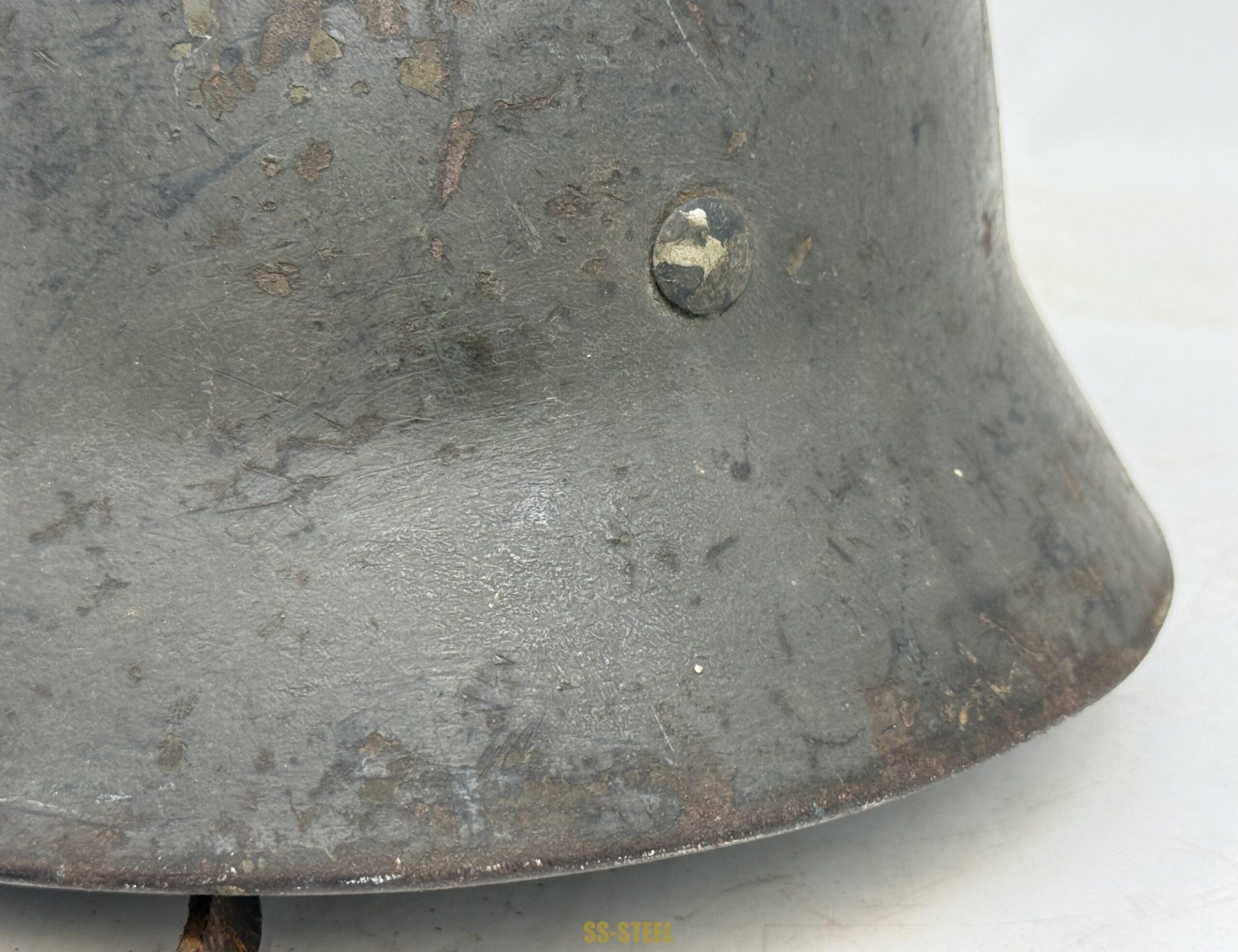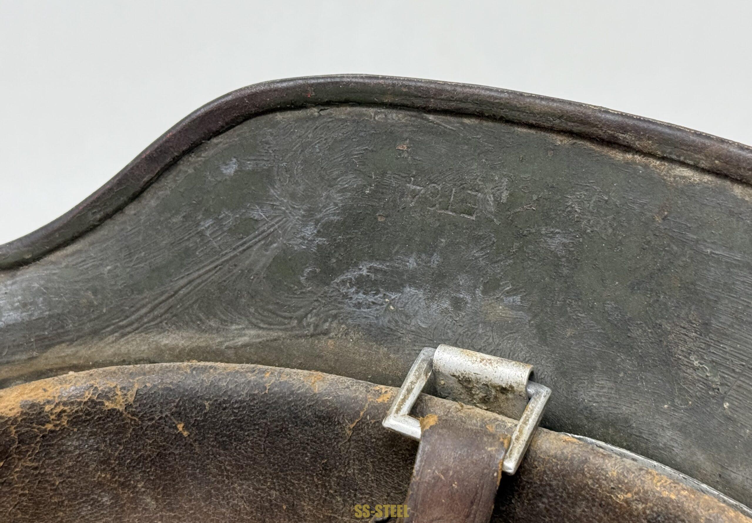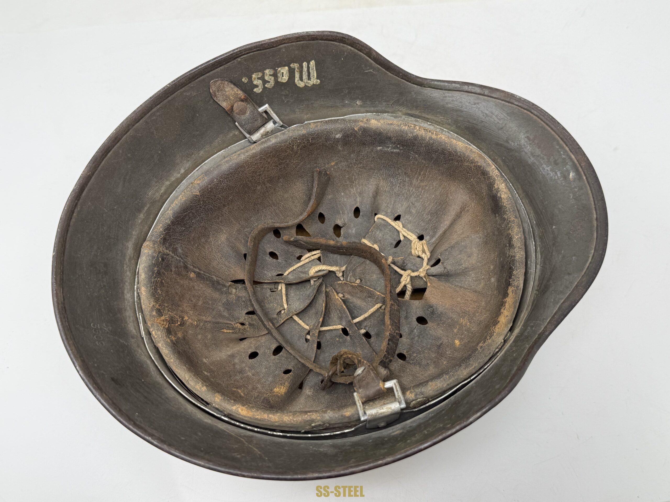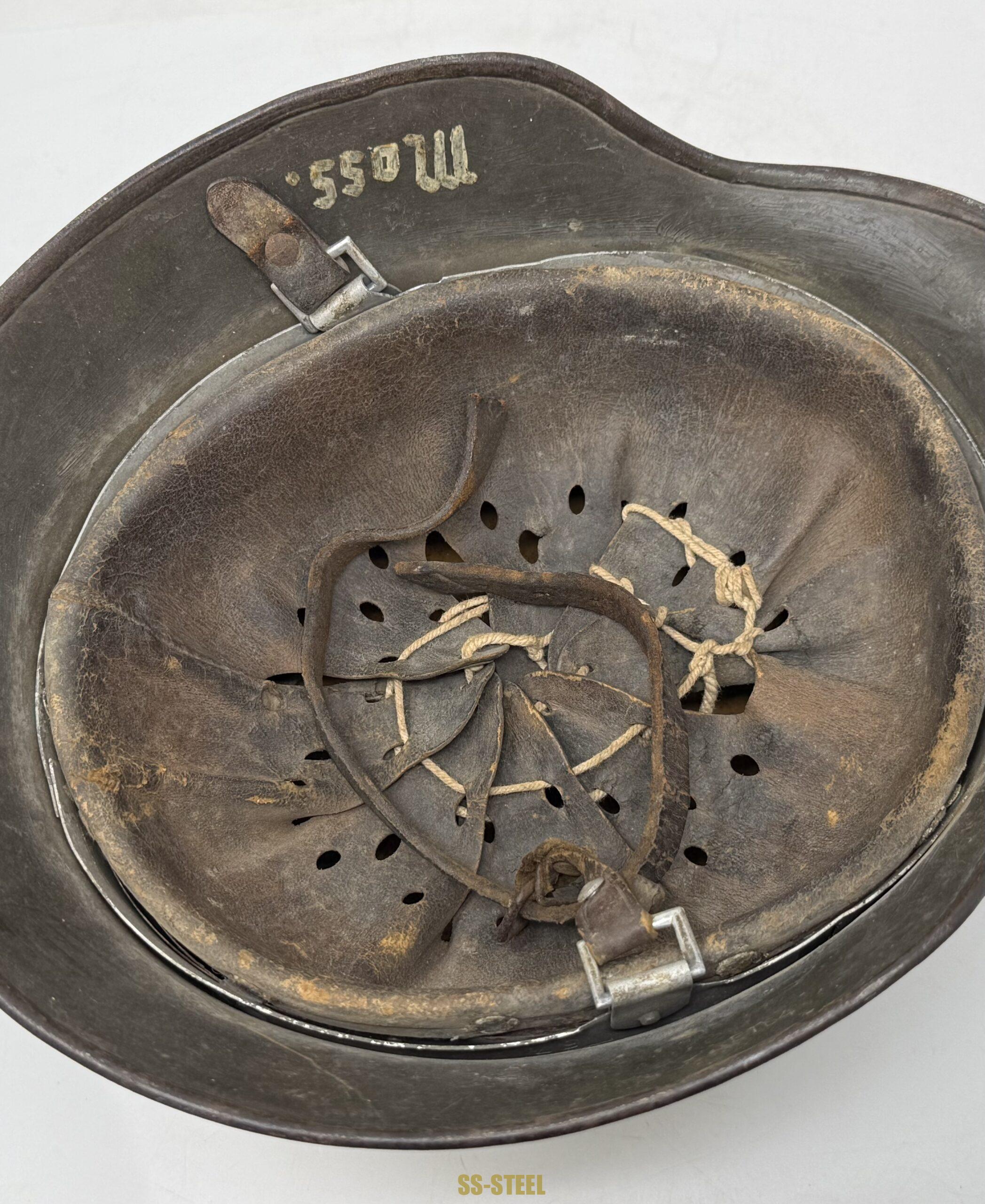 M35 Heer single decal helmet by ET size 64, batch number 3509. Helmet is fresh from woodwork featuring shipboard grey overpaint/camo finish with Adler decal neatly painted around. Helmet is equipped with untouched liner that shows and interesting custom finish with tie string done by soldier. The name “MOSS” can be seen on inner skirt. Nice battle worn never in a collection from consideration. COA accompanied.