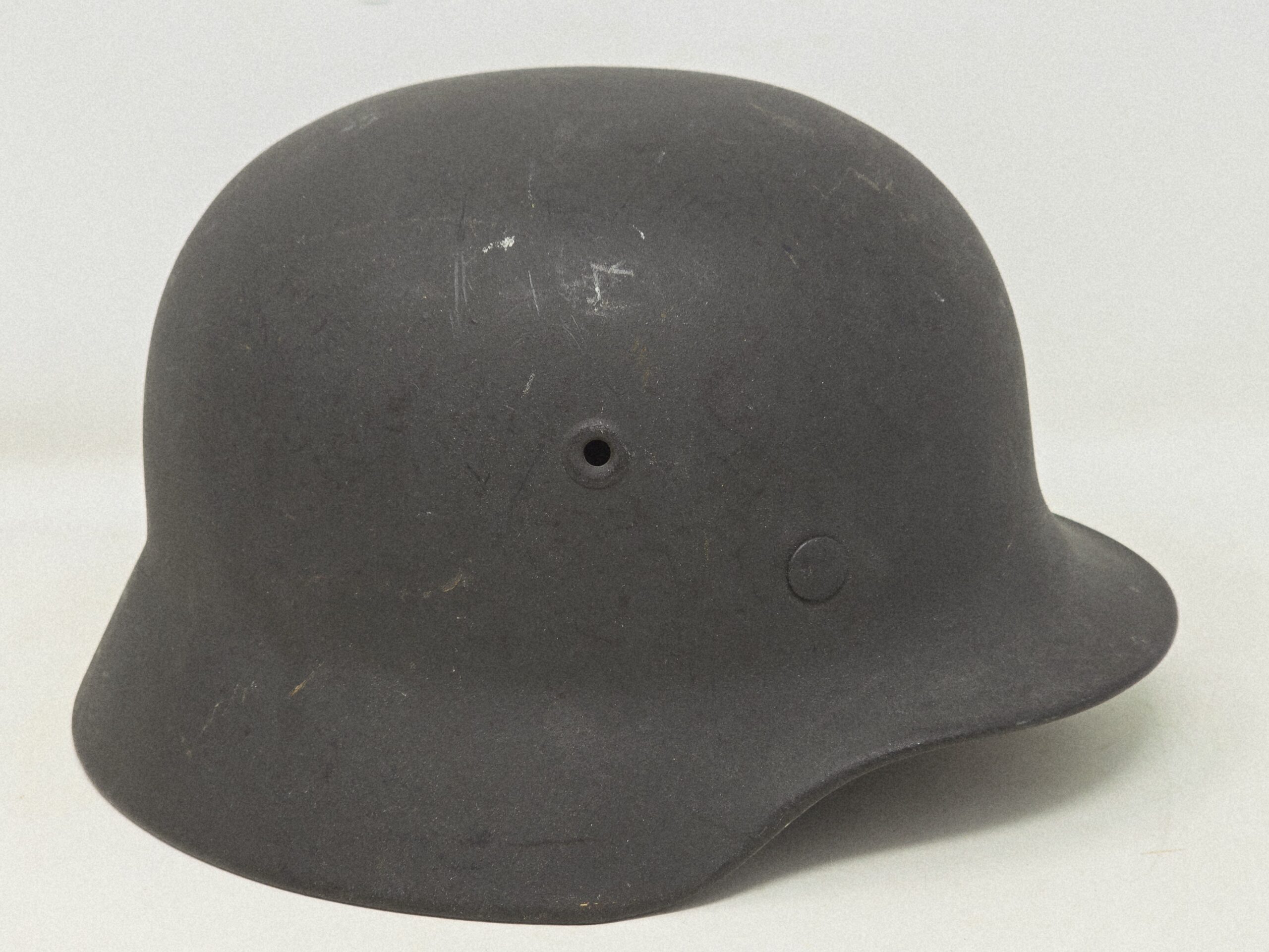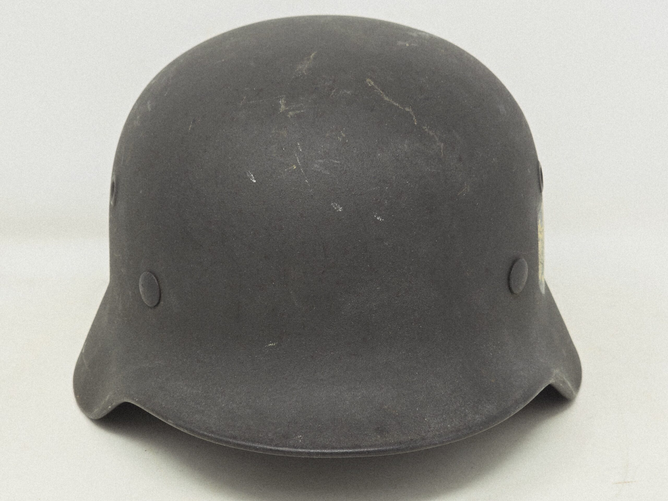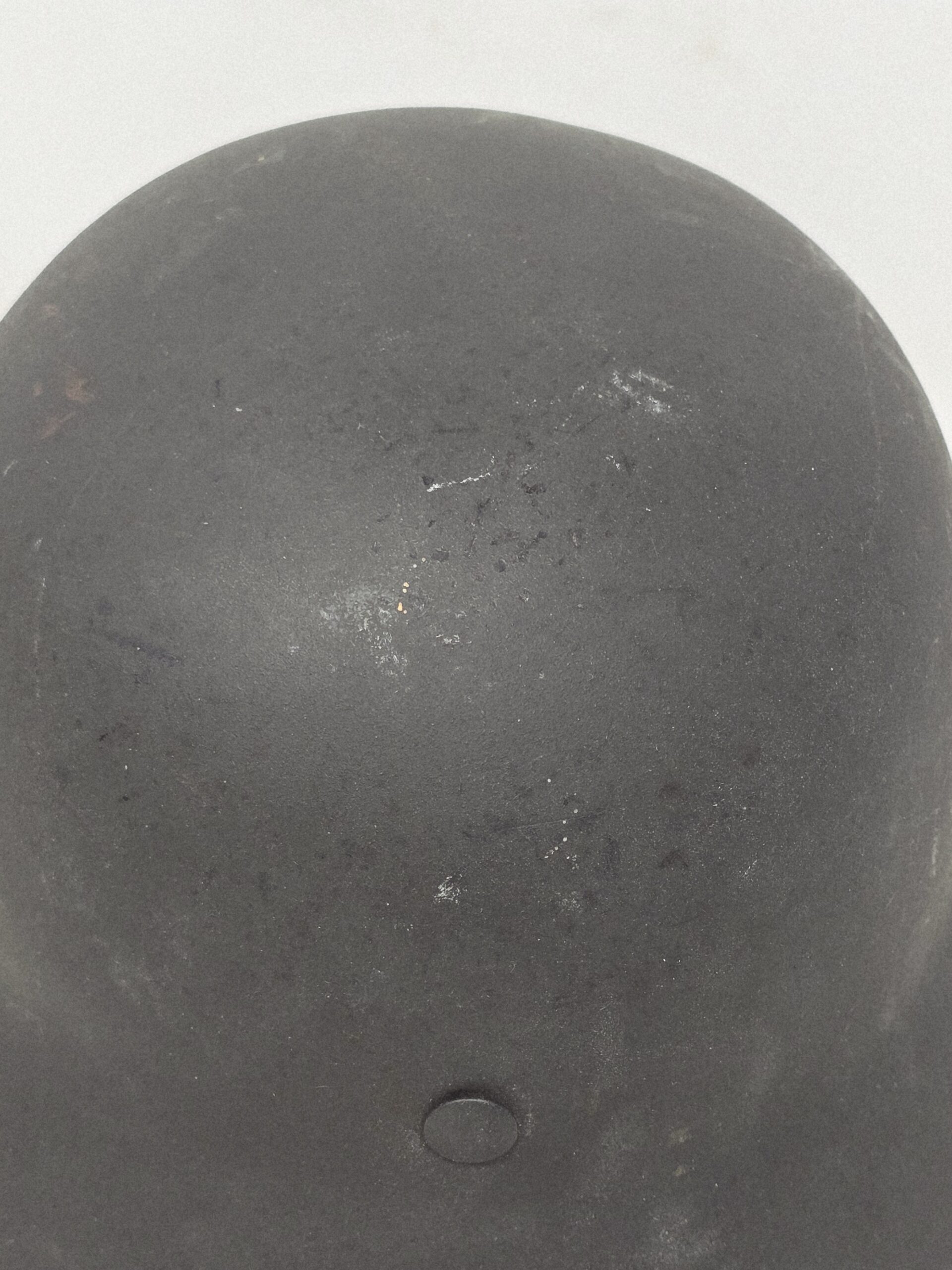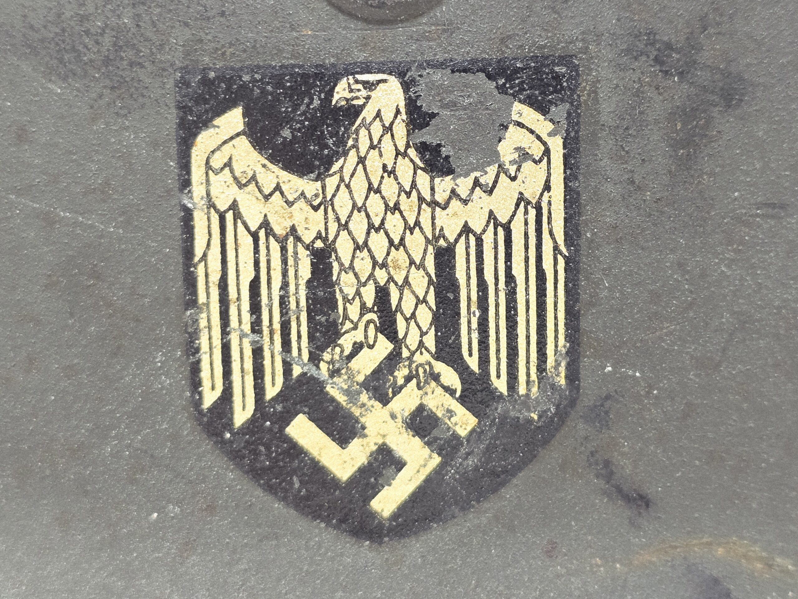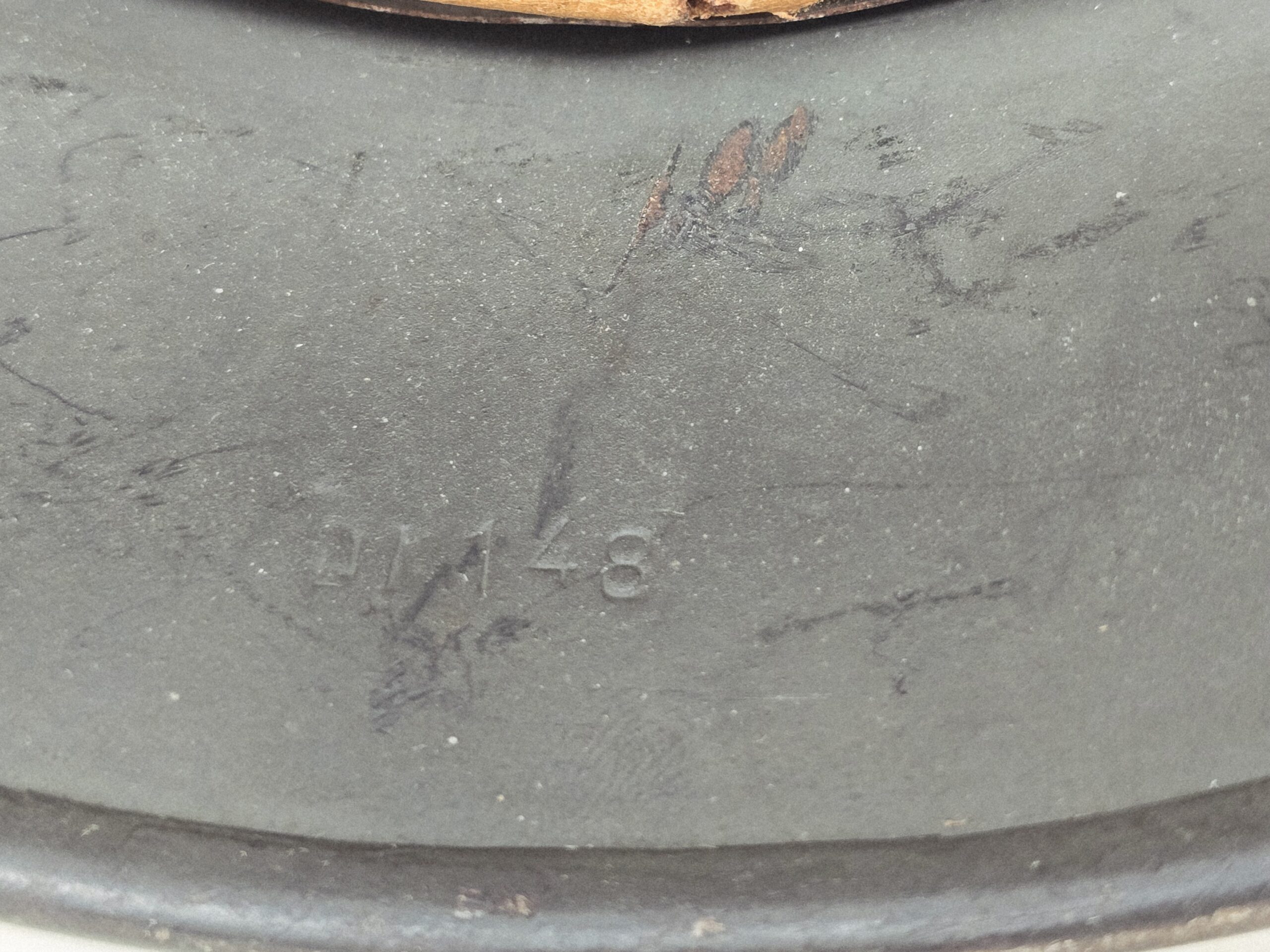 This is a basically mint helmet, Q62 #DN148, with single heer decal and factory Quist schiefergrau finish. The helmet shows no service use, and the decal shows some flaking due to the varying quality of lacquer used to topcoat the decals at the factory. Dummy’s camp is present. Chin strap is dated 1942. A super fine example, COA accompanies.
