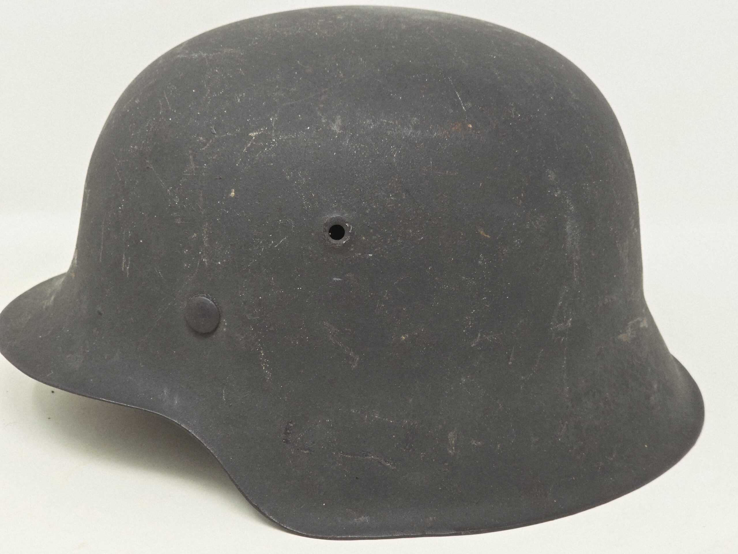 This helmet basically is an unissued CKL size 64, heat lot number #4881. The interior has a crisp, clear dome stamp. The liner is blonde and is stamped size 56. There is a tiny bit of age showing at the edge of the liner. The chin strap is RB Numbered. Overall, the helmet shows no service wear, just storage condition. A fine addition to the German helmet collection. COA accompanies.