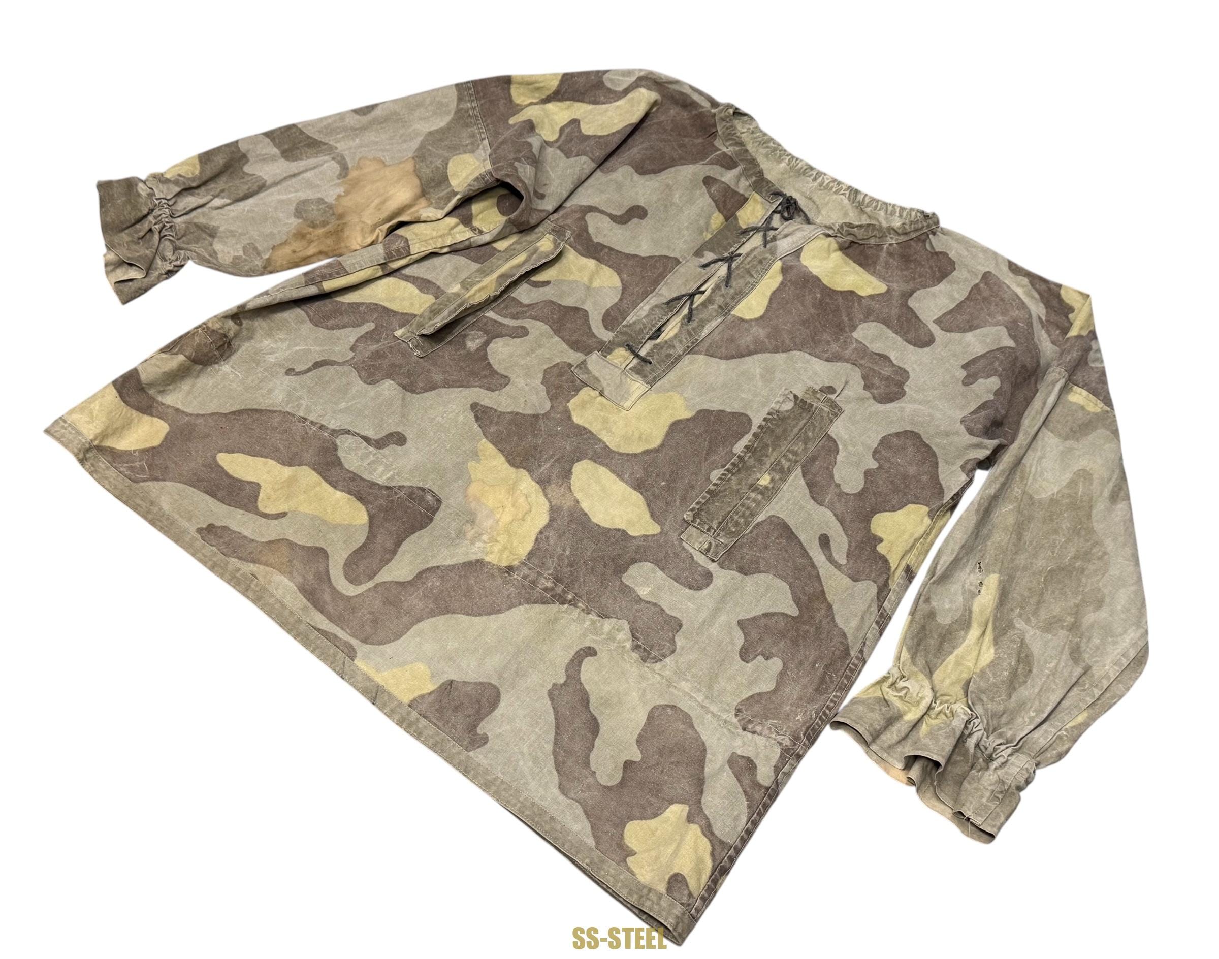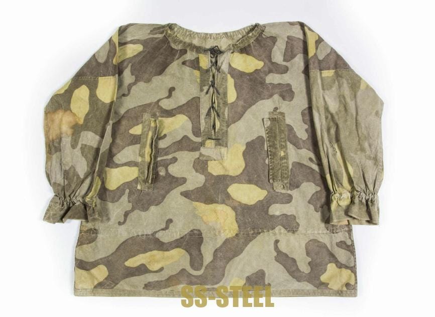 This is an outstanding example of an SS style camouflage smock, produced in Italian camouflage material (and in this case, bearing a possibly Italian surname). These smocks were used heavily by the Luftwaffe ground forces engaged in fighting in Italy, and in early 1944 were issued bulk to the 12th SS Panzer Division ,,Hitlerjugend”, where they featured widely throughout the Normandy campaign. The smock is well documented within the collector community, and comes from a top level collector who consigned it here. The garment itself shows moderate service wear, with still vibrant colors. There is no damage, but a stain on one sleeve that possibly represents and old dried blood stain. A great period photo from the web shows a LW troop wearing exactly one of these. A very desirable camo piece for the collection, COA accompanies.