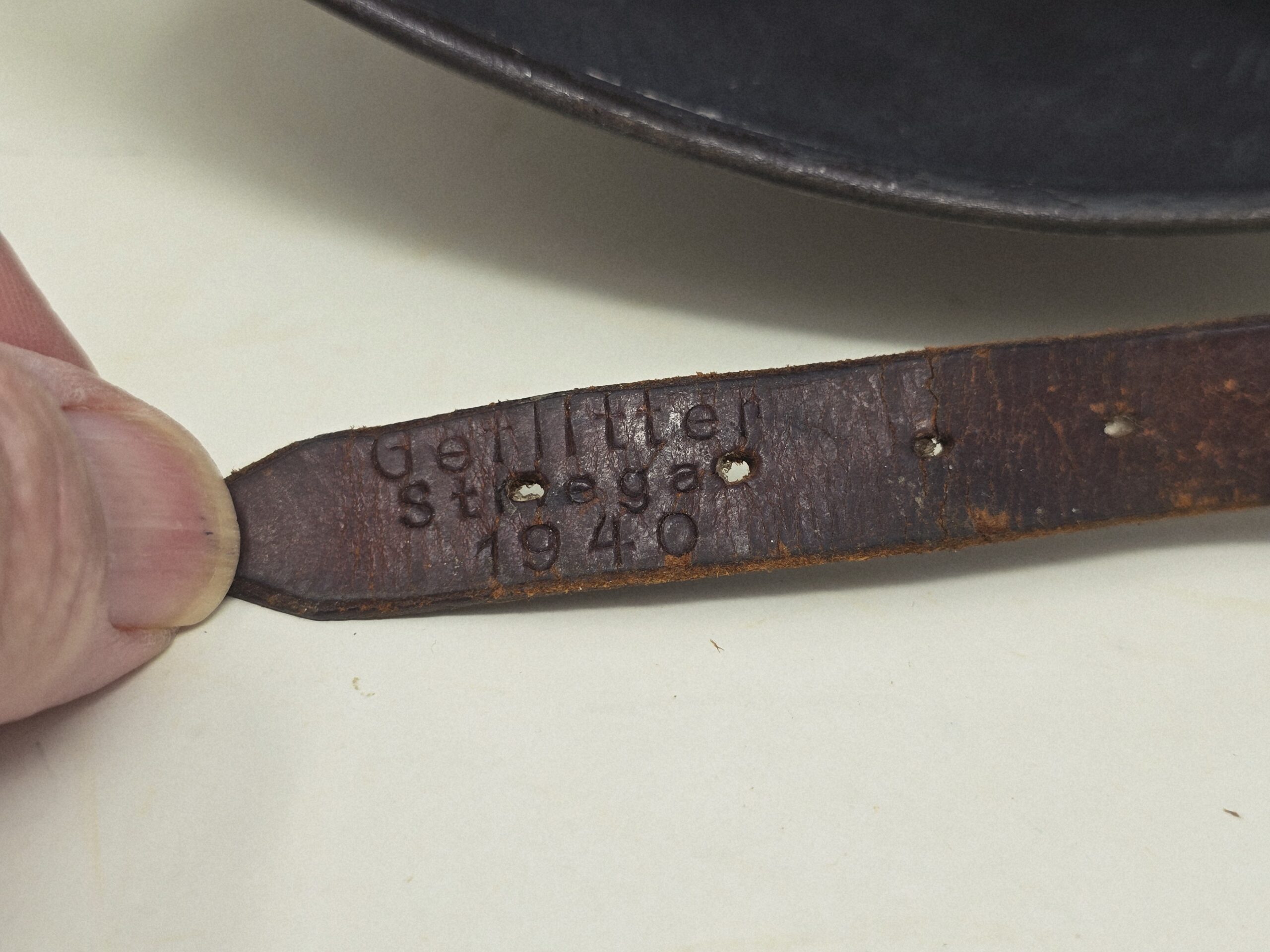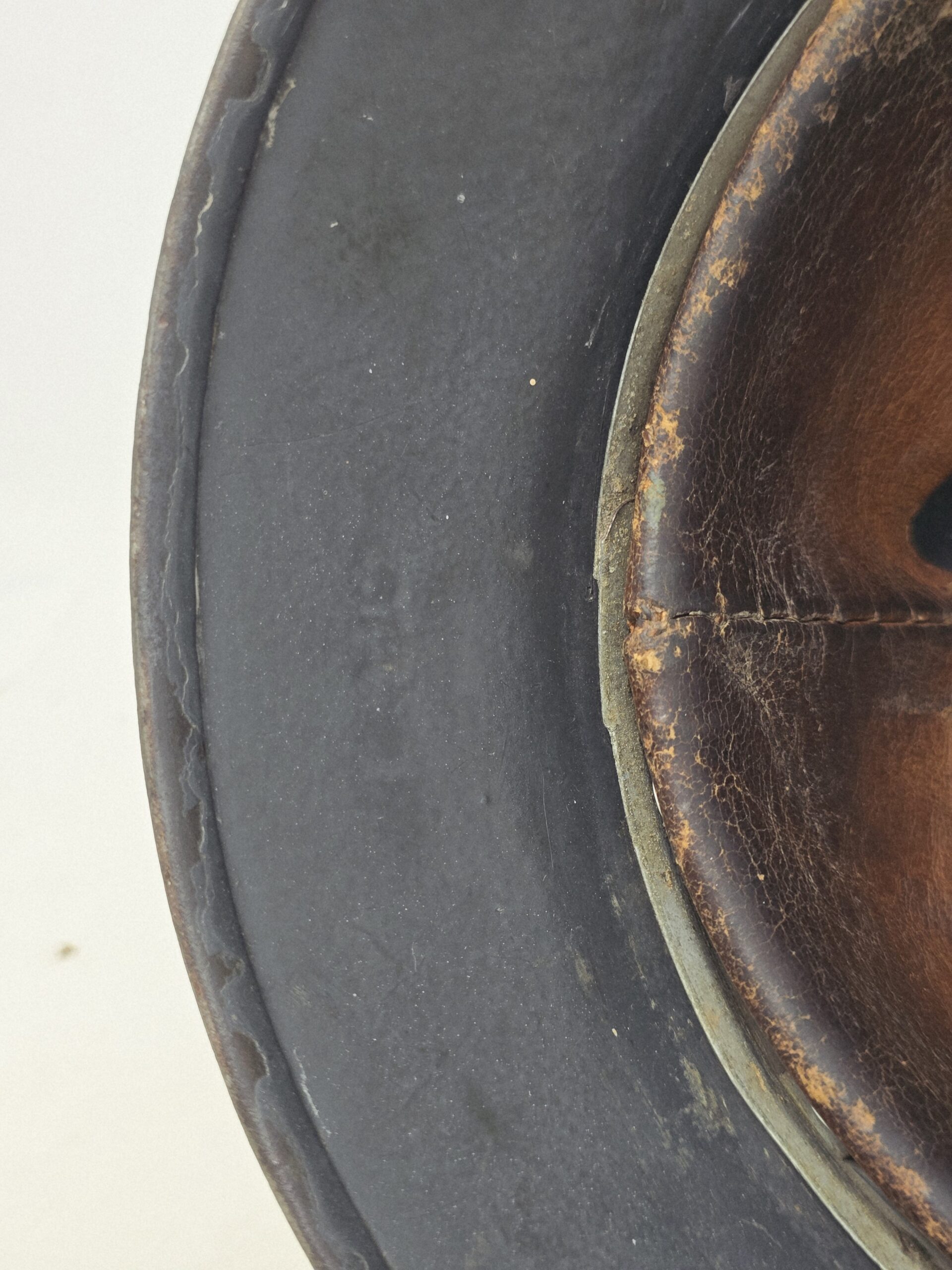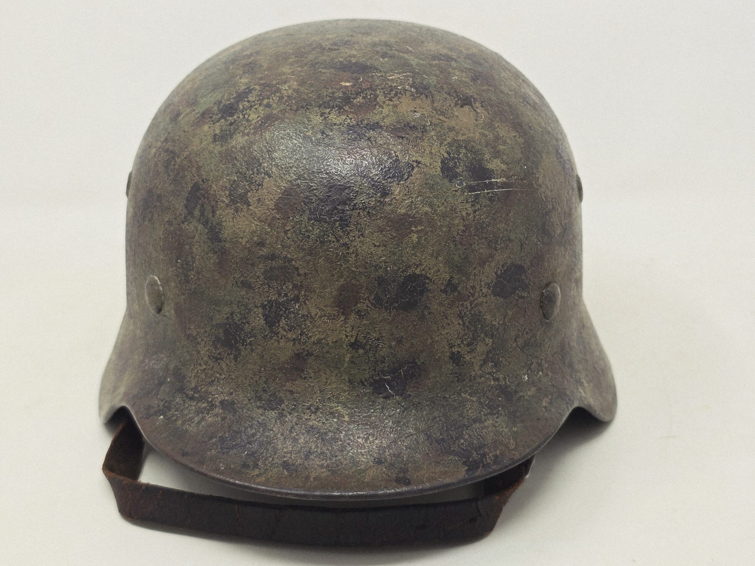 This is a fine SE66 (# batch number not visible) Luftwaffe M35 camouflage helmet, displaying a thick, multi-color, hand-applied camouflage, atop the helmet’s reissue finish. The color scheme resembles clay, and blends extremely well with colors in a rocky area. The Luftwaffe decal is only slightly visible via some cracking along the wing, changing the texture of the camo paint slightly, which tells the viewer it is under a thick layer– but still there. The size 58 marked liner is in excellent condition, as is the chin strap, which is also well marked and dated 1940. That’s the vintage of the re finish and reinstallation of the 1940 style liner during the reissue process. A real beautiful top shelf camo helmet, from one of the most discriminating collections, coa accompanies. ( Apologies — will have a full liner shot and other liner photos first thing tomorrow. Liner is fully intact and fine.) kh.