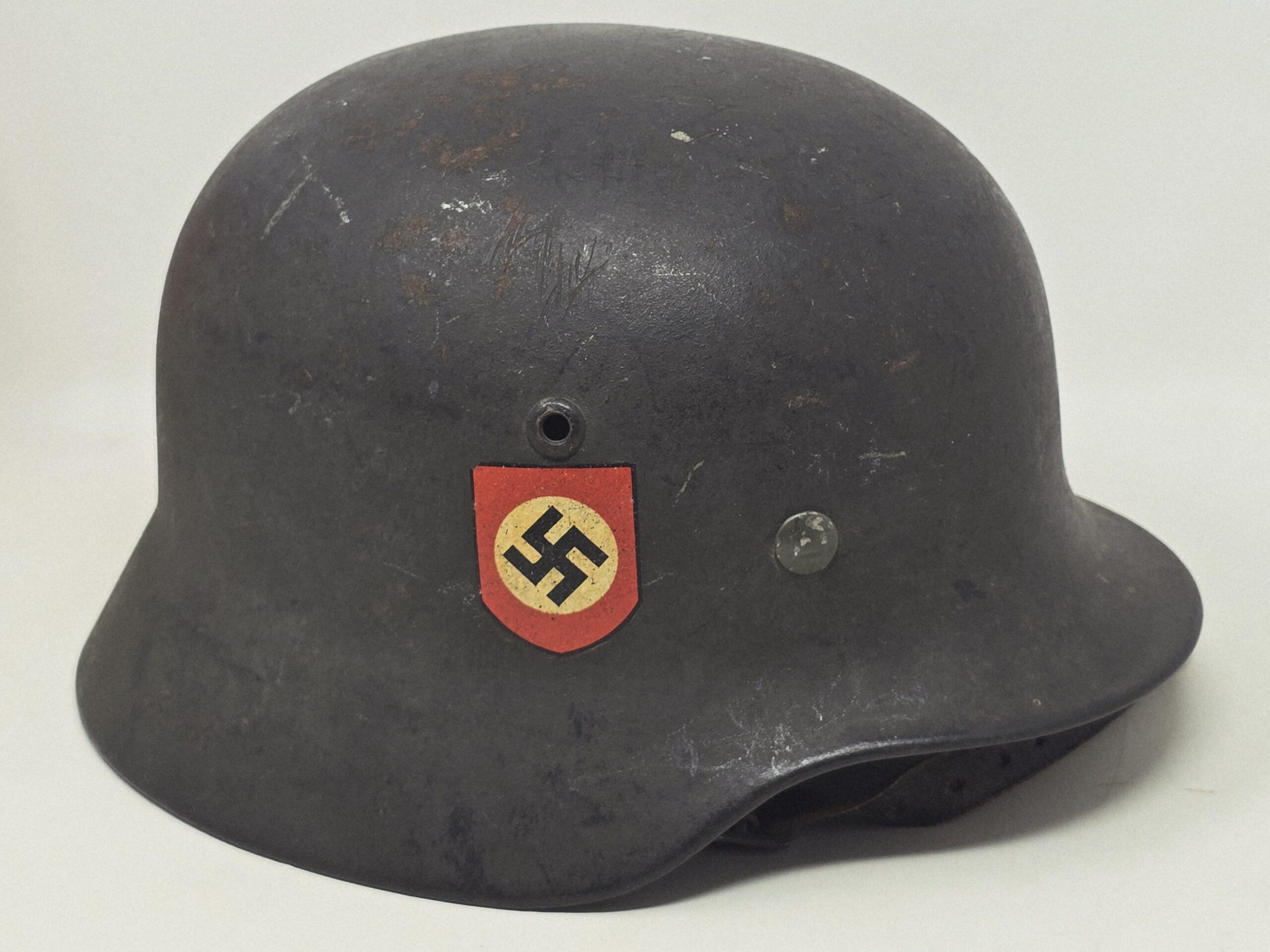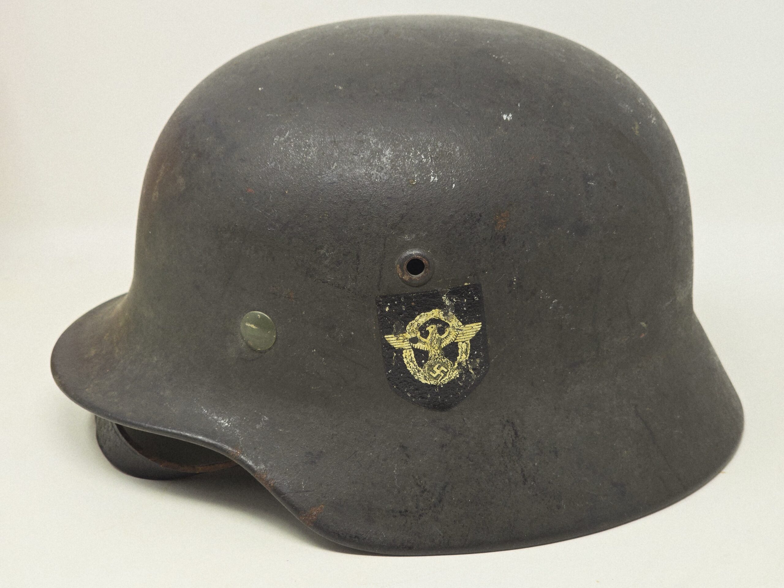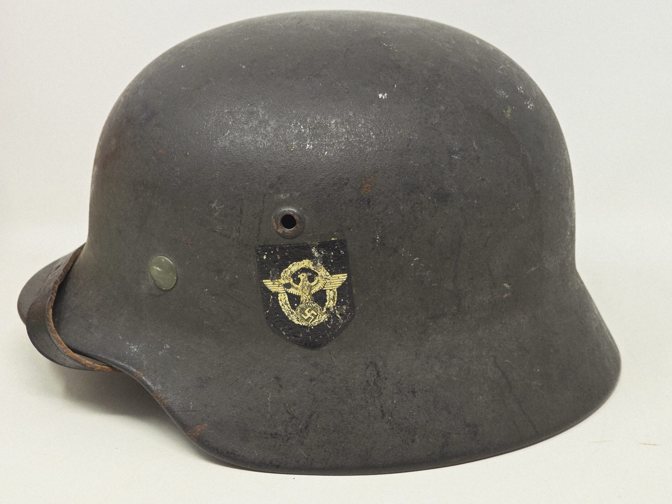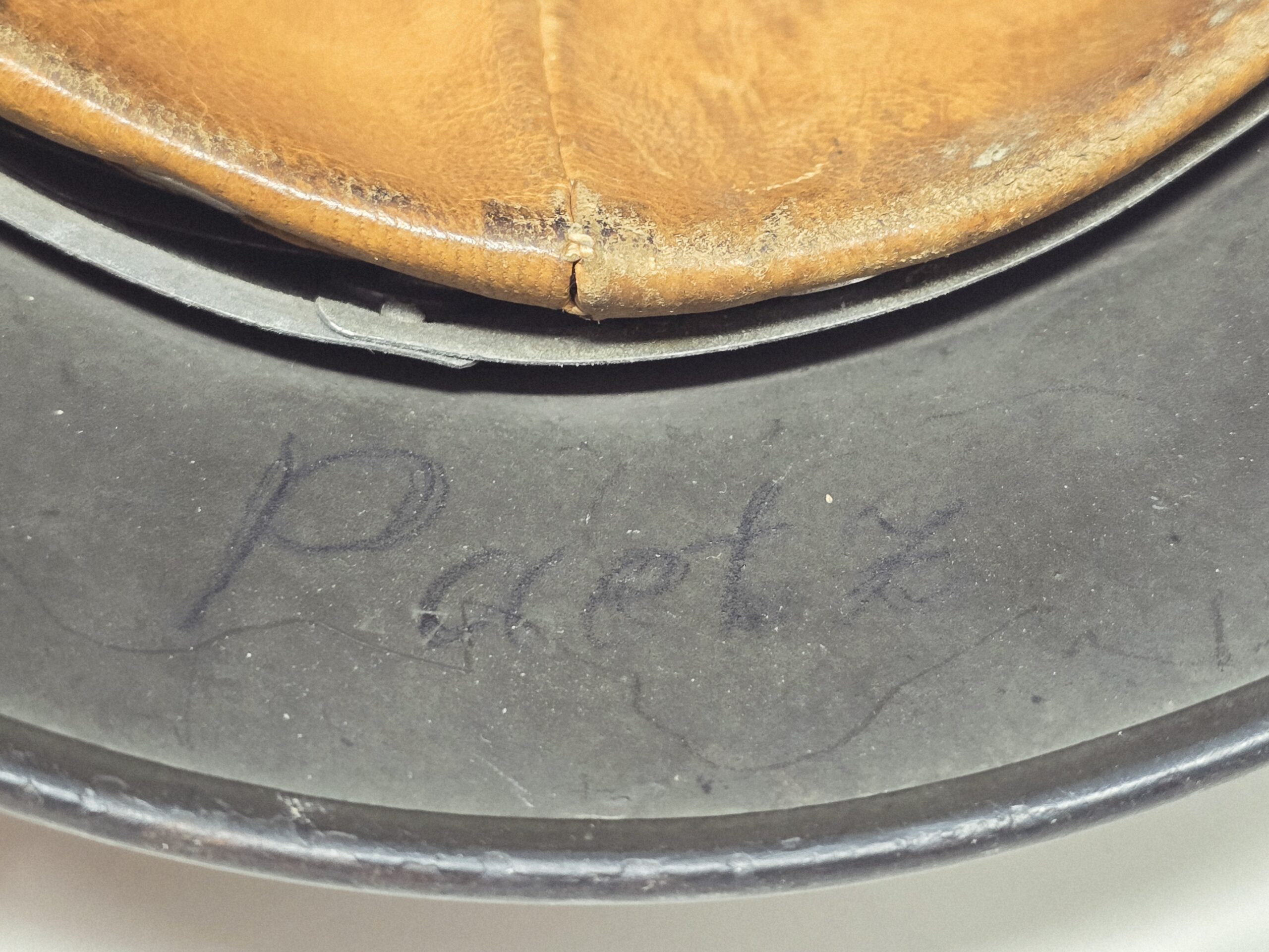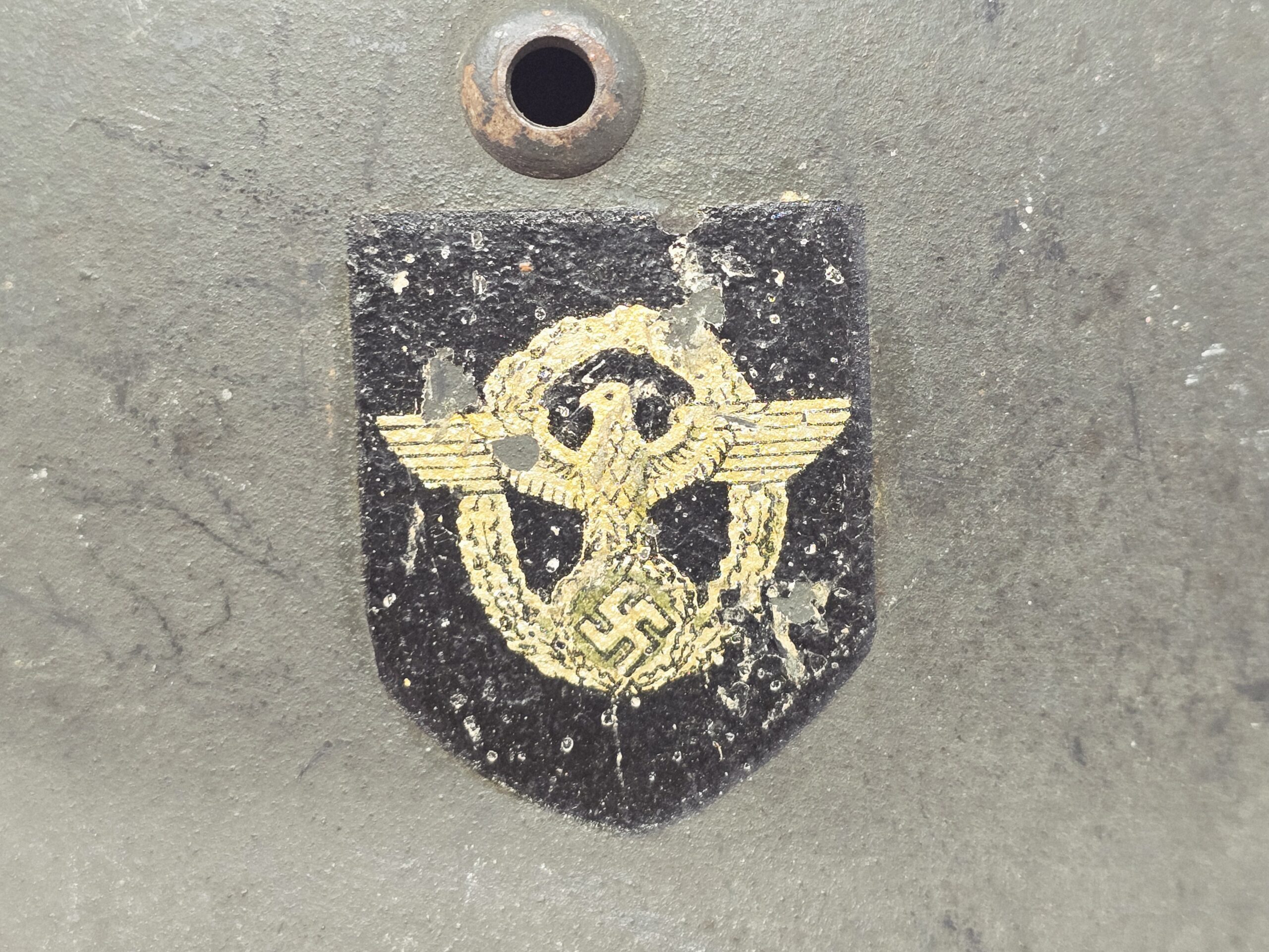This is a late M35 production helmet, size 62 shell by EF, who combined rough texture paint with smooth green-grey liner retaining rivets in 1939 production. The unbordered police shield and standard party shield are excellent, with some minor scuffing to the police shield. The paint, liner and strap are in very good condition. The helmet is named “Paetz” in the rear skirt. A great piece for the collection, COA accompanies.