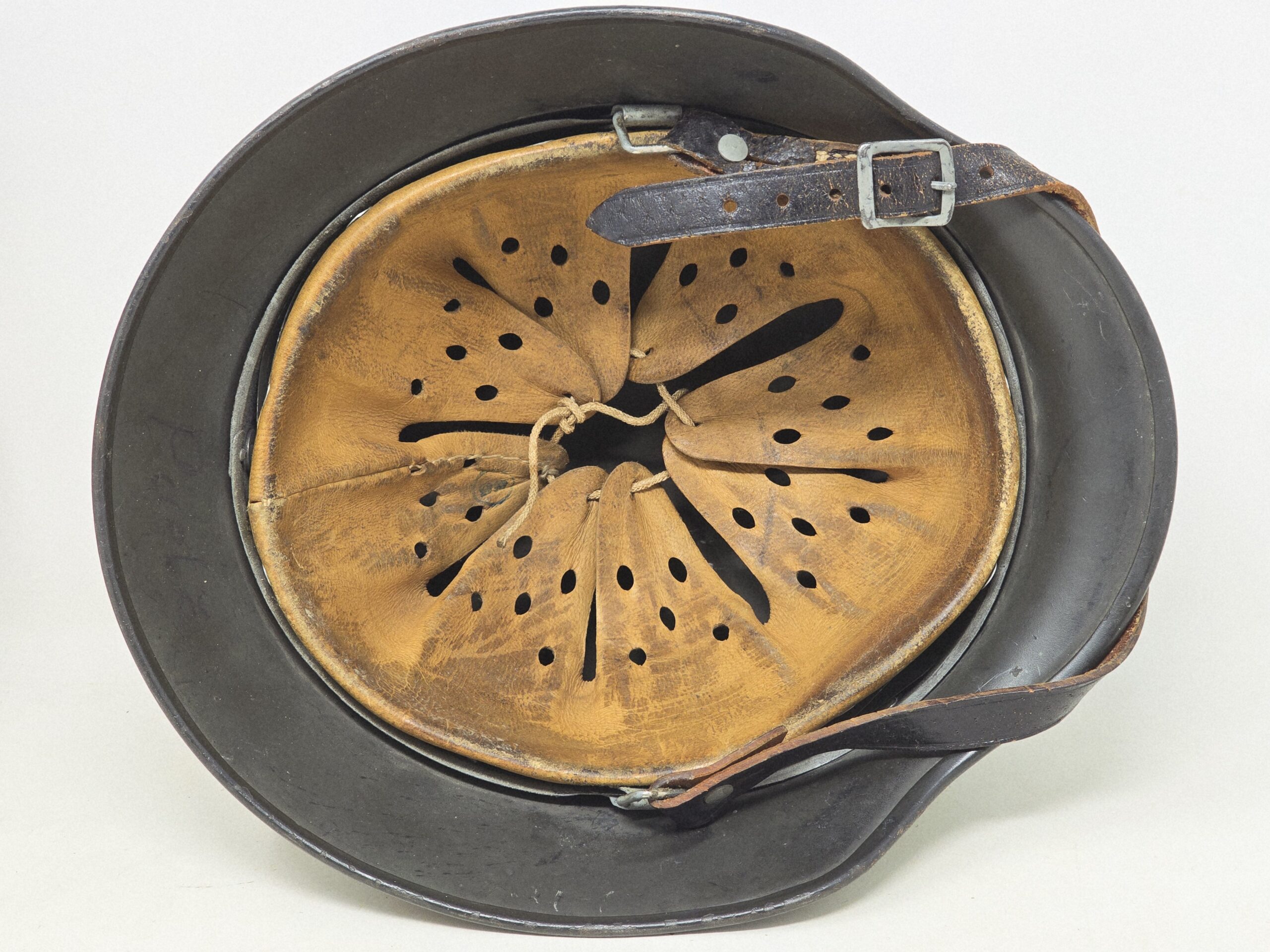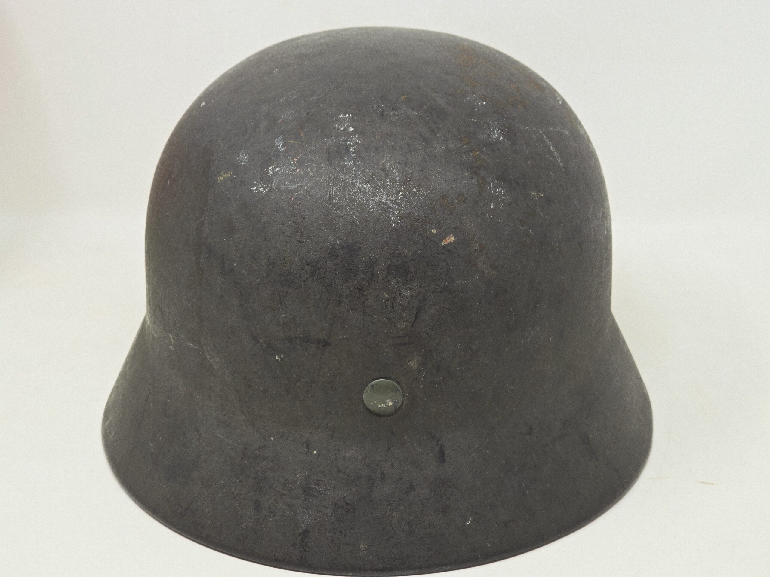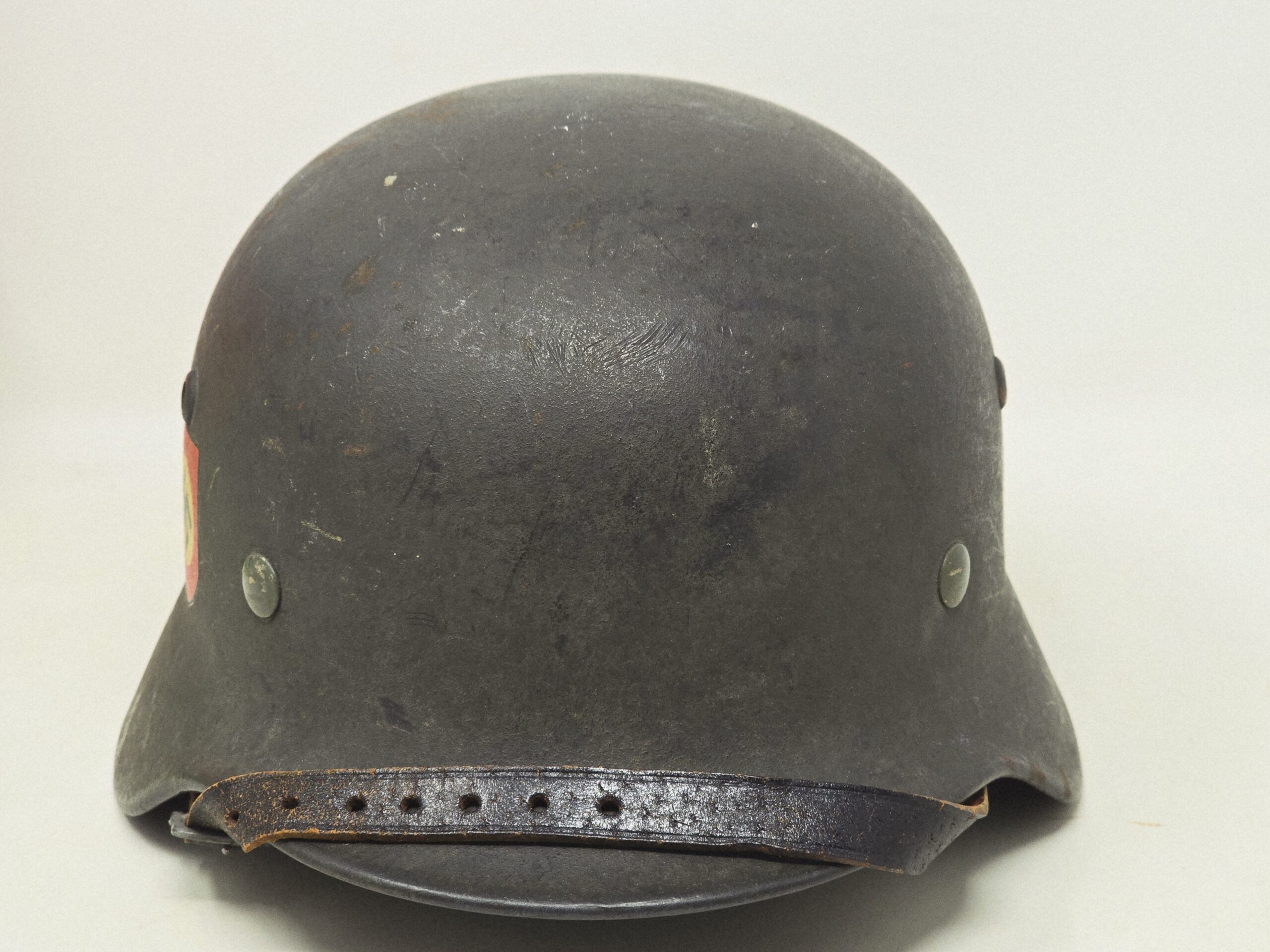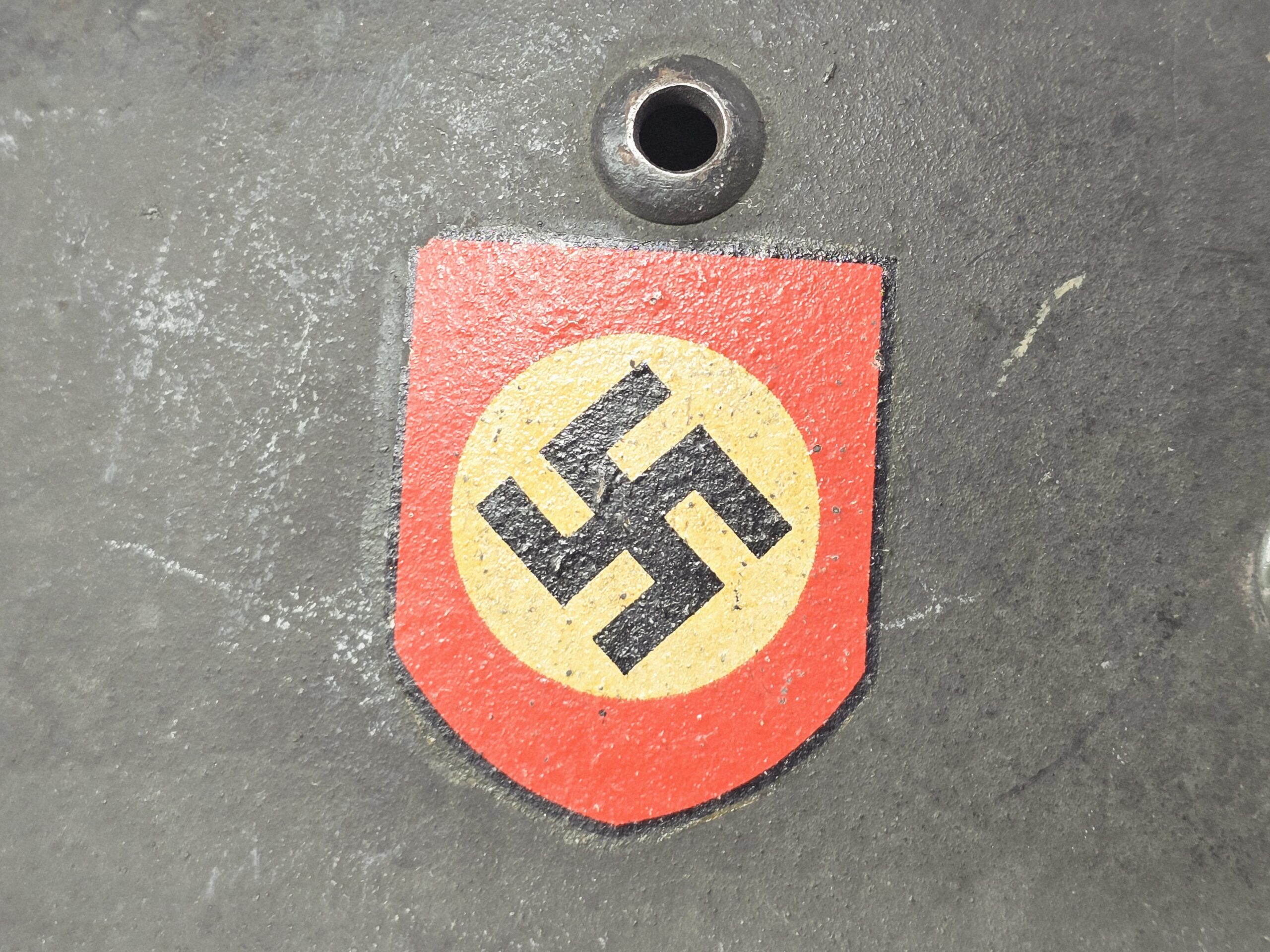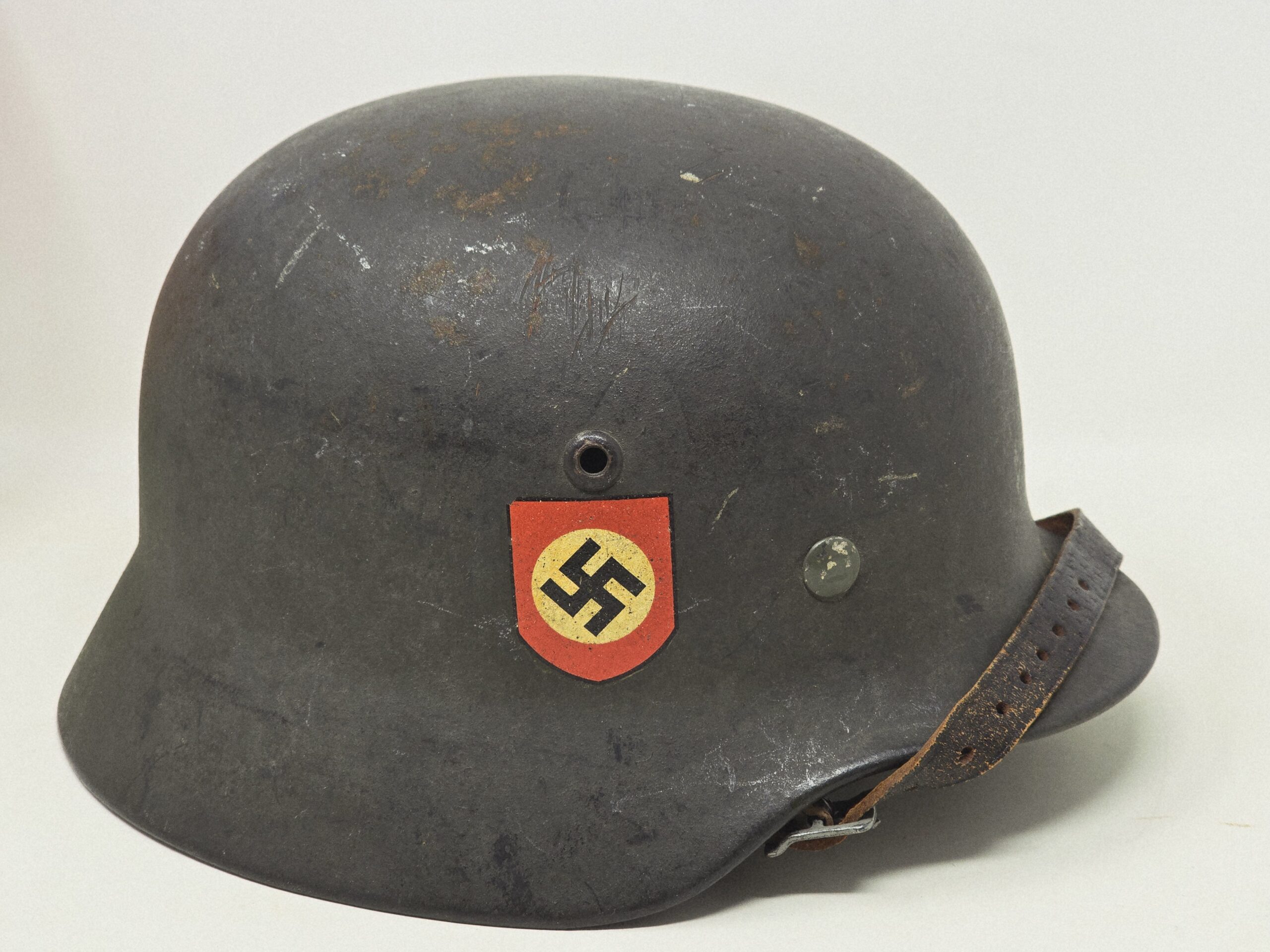 This is a late M35 production helmet, size 62 shell by EF, who combined rough texture paint with smooth green-grey liner retaining rivets in 1939 production. The unbordered police shield and standard party shield are excellent, with some minor scuffing to the police shield. The paint, liner and strap are in very good condition. The helmet is named “Paetz” in the rear skirt. A great piece for the collection, COA accompanies.