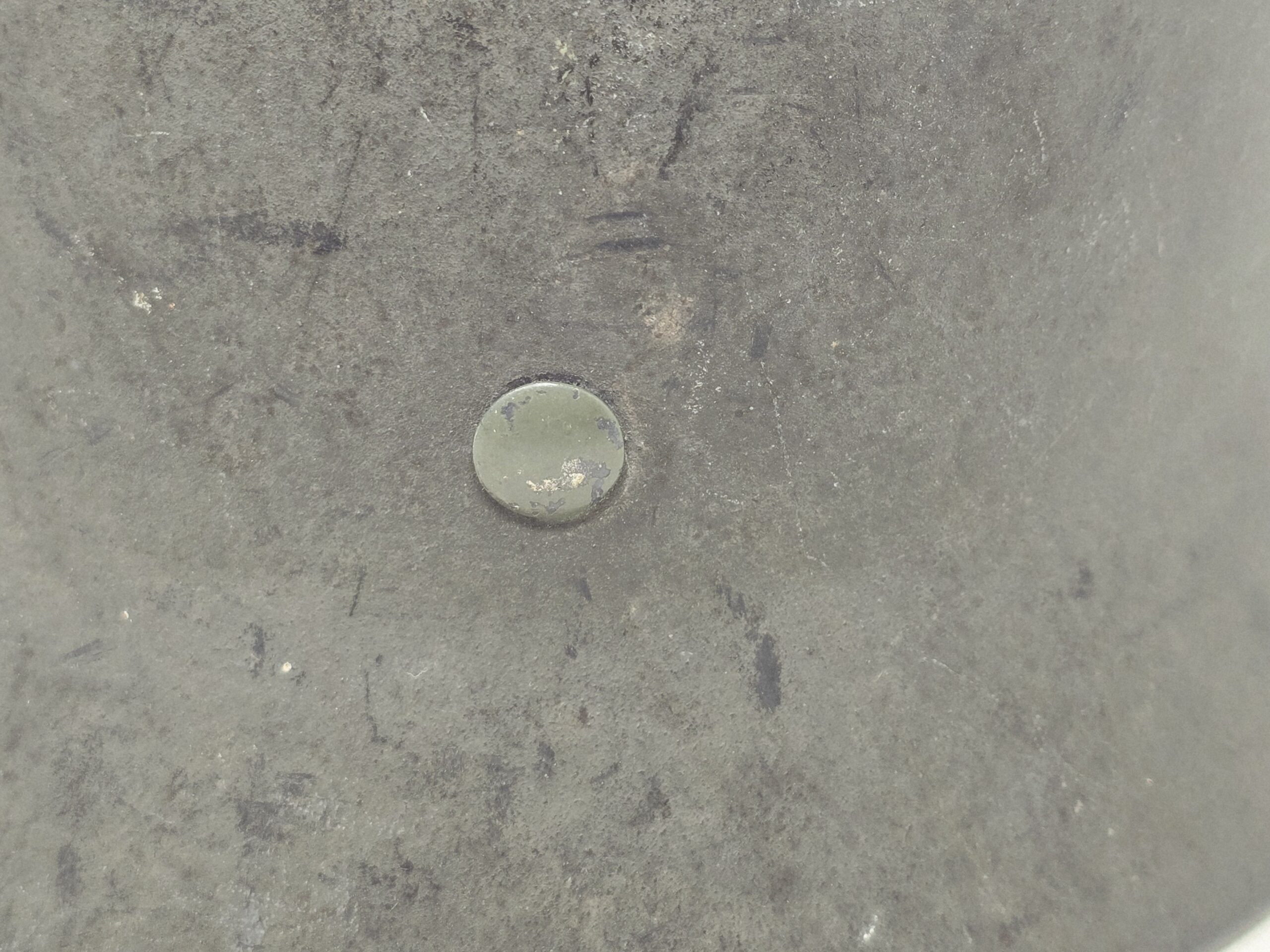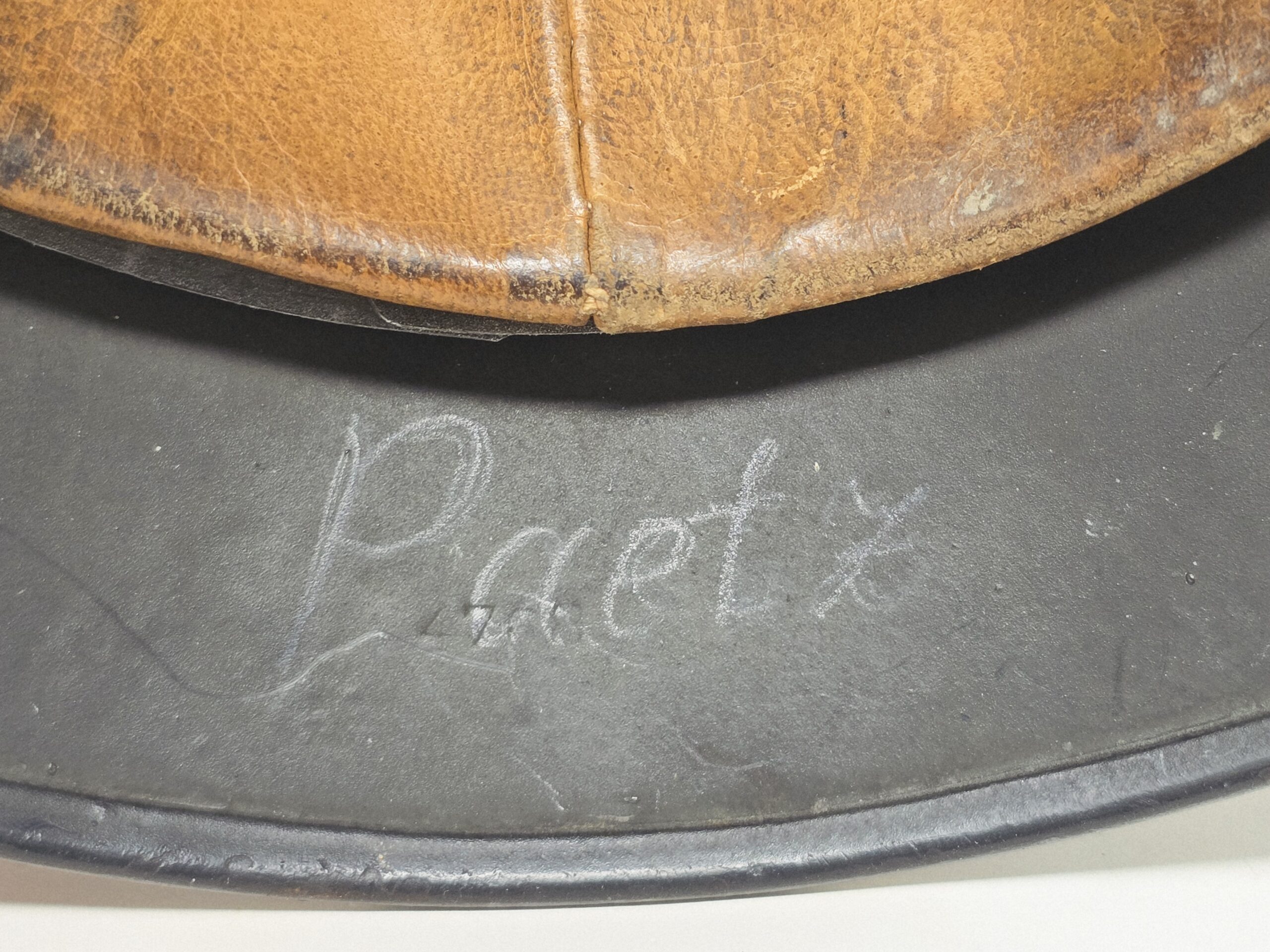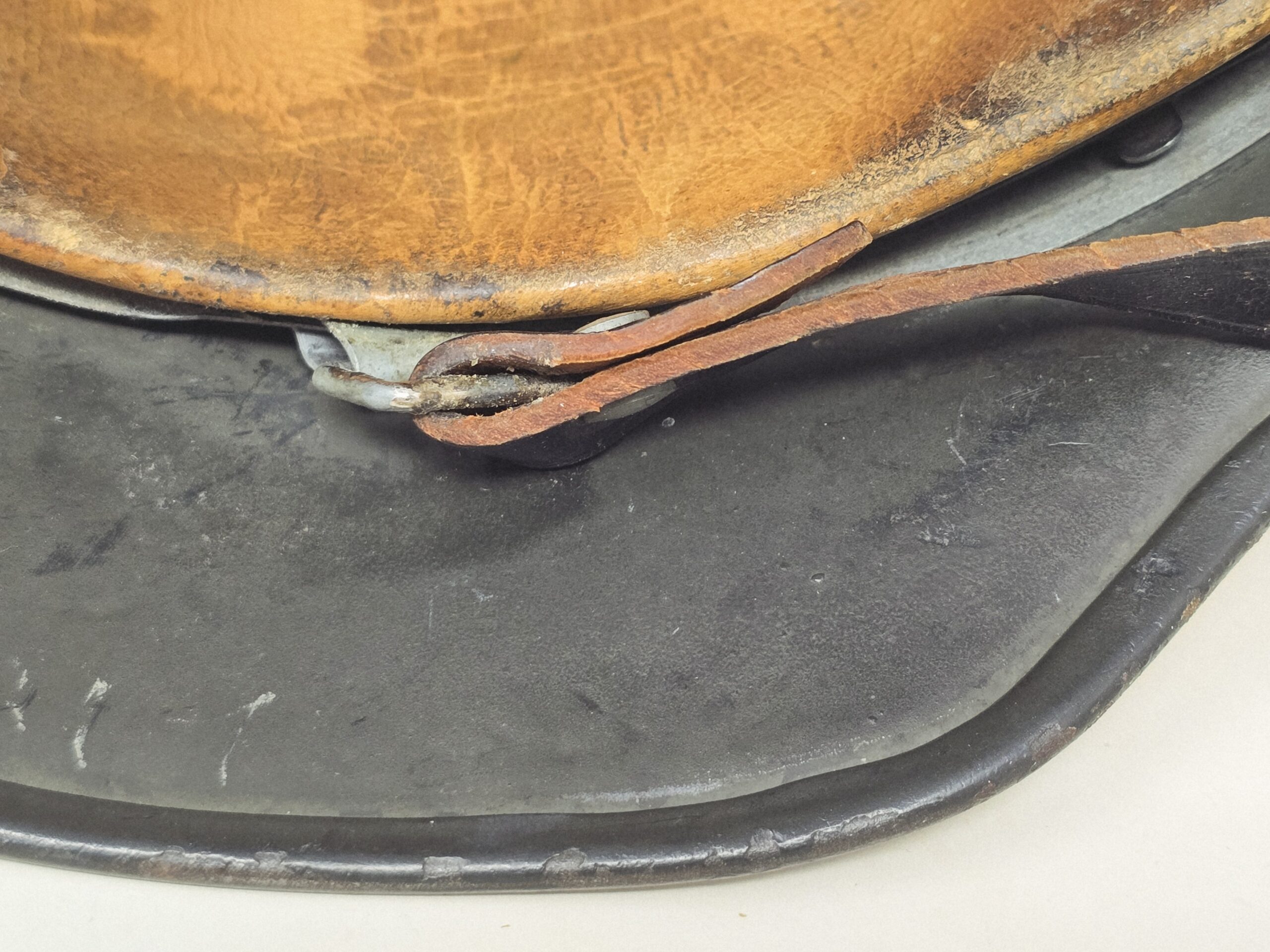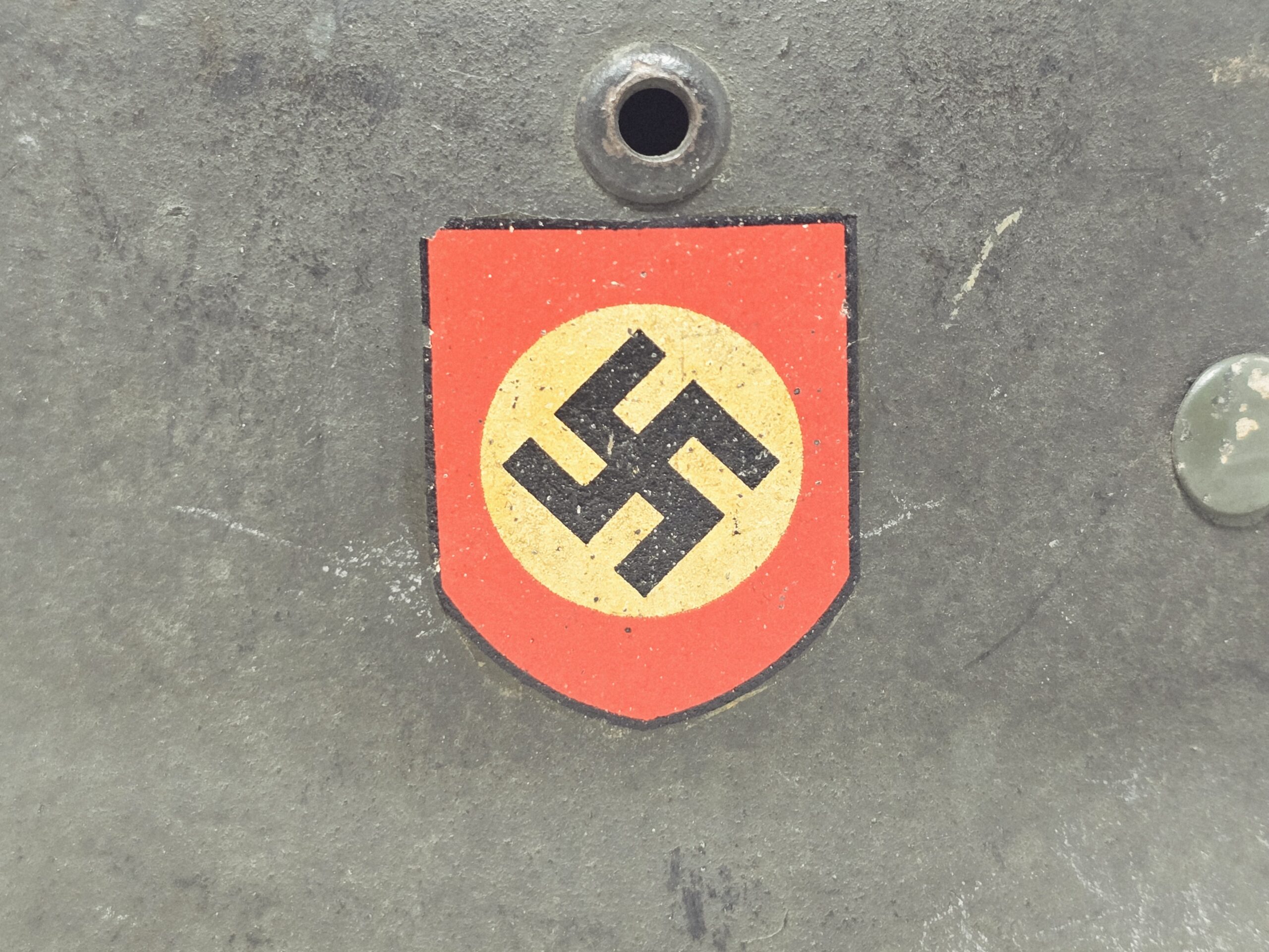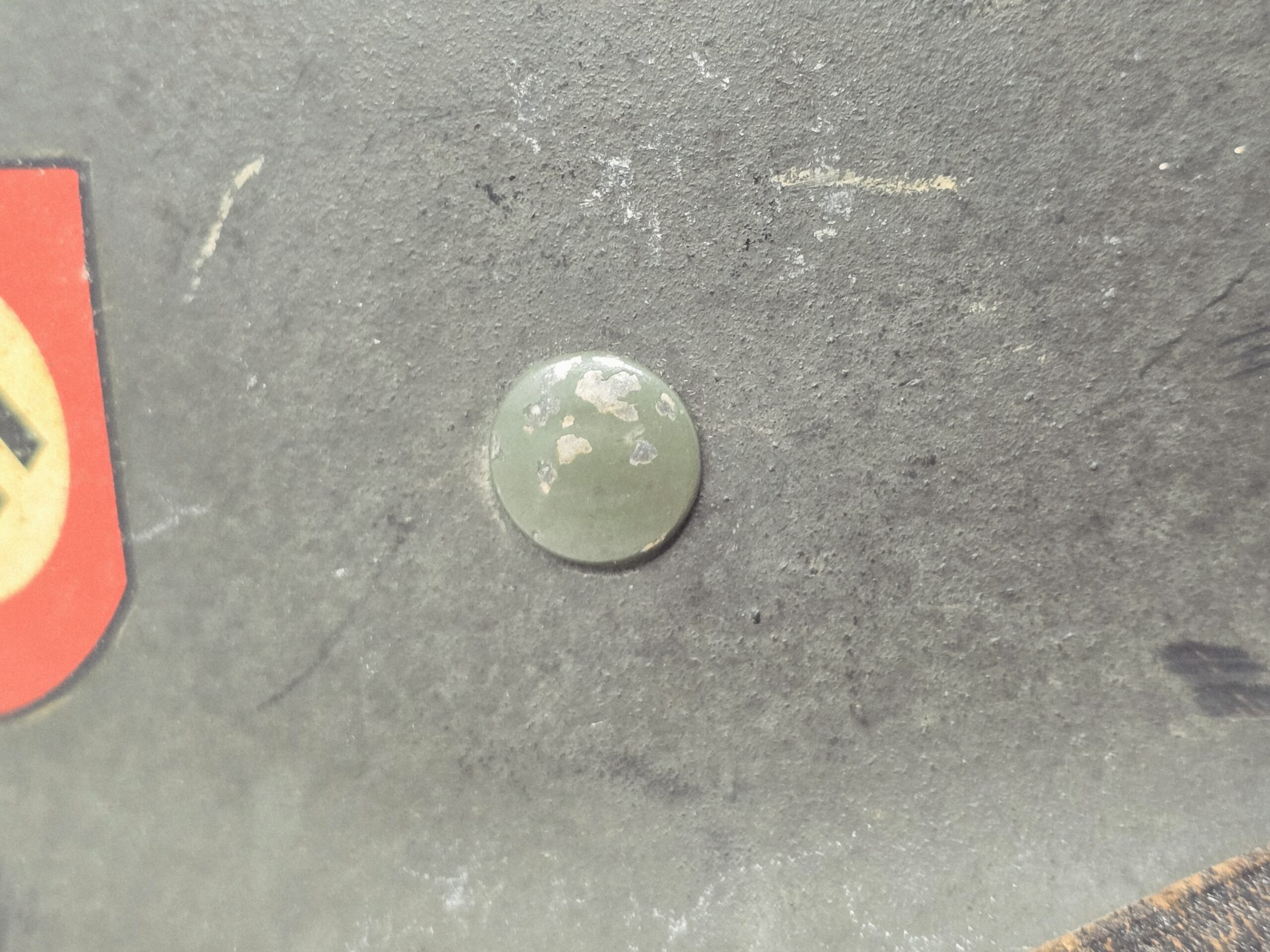 This is a late M35 production helmet, size 62 shell by EF, who combined rough texture paint with smooth green-grey liner retaining rivets in 1939 production. The unbordered police shield and standard party shield are excellent, with some minor scuffing to the police shield. The paint, liner and strap are in very good condition. The helmet is named “Paetz” in the rear skirt. A great piece for the collection, COA accompanies.