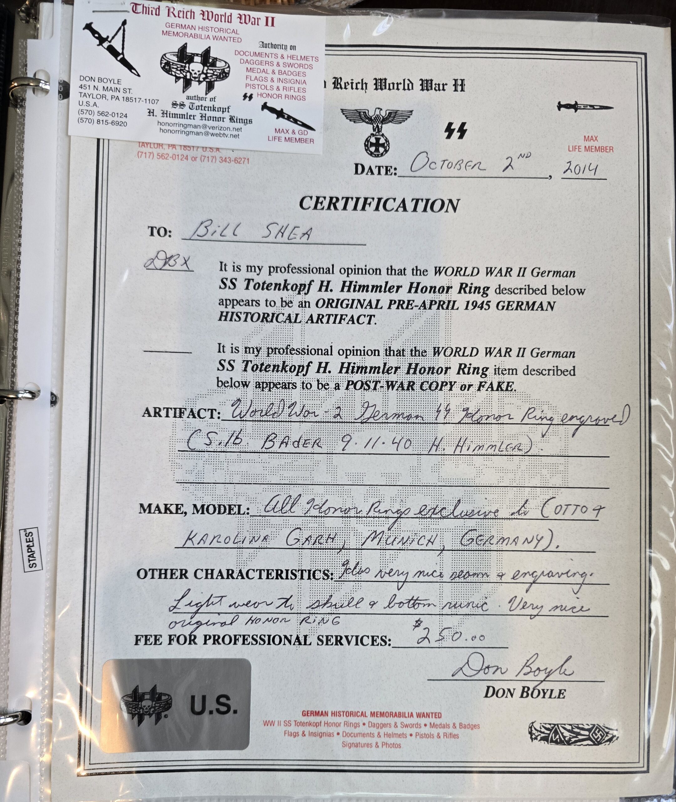 This fine SS honor ring is named and documented to SS Major General / Brigadeführer Kurt Bader. Bader served for a period of time as a lawyer, advising legal matters for himler and the SS, as well as serving as a police leader later in the war.