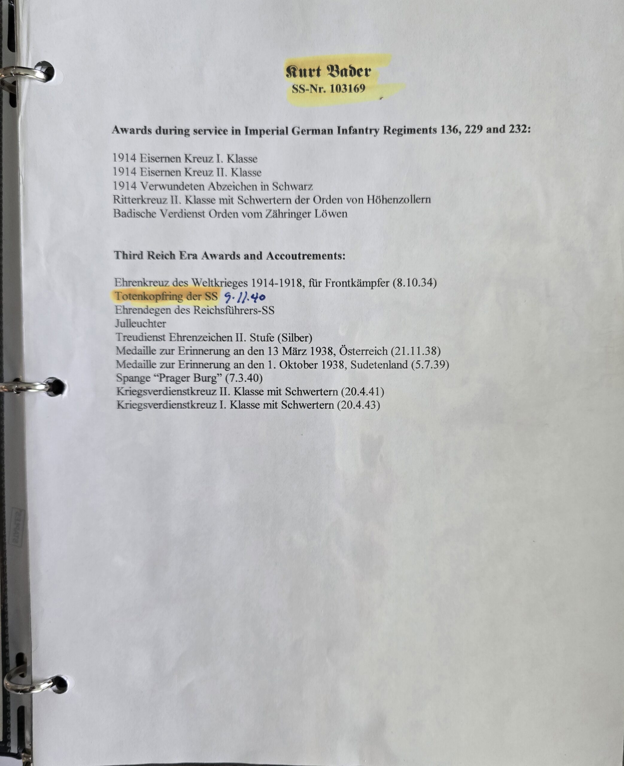 In general, SS-Brif. Bader’s career spanned both World War I and World War 2. He was a reasonably highly decorated World War I veteran, Officer, became a lawyer, served in the personnel office of the RFSS. His legal decisions contributed to the framework of SS operations across occupied territories, and within the Reich.
