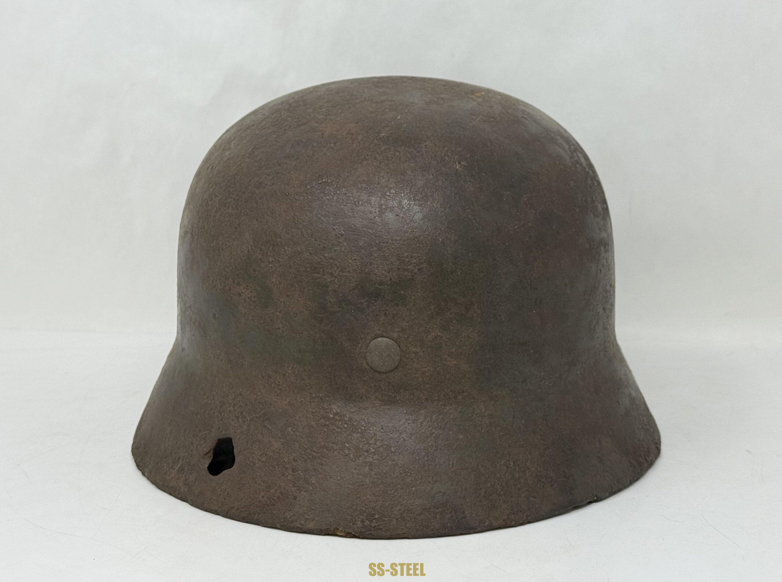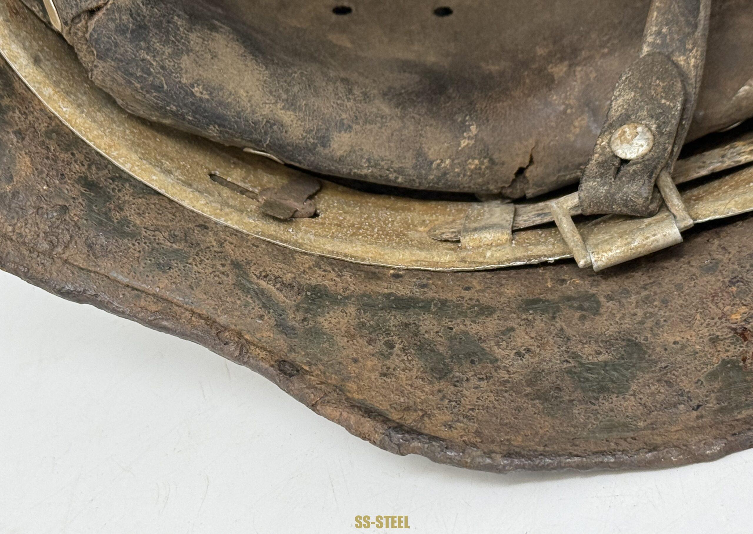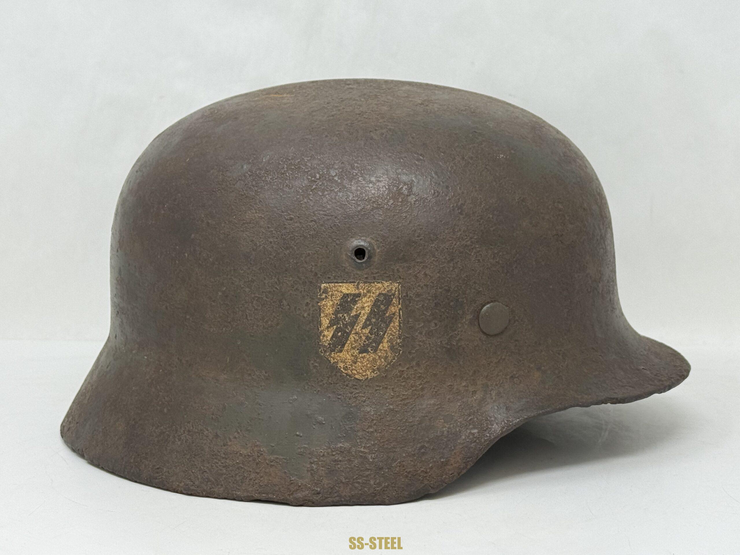 SS M35 Double Decal helmet by Quist size 66, with unknown batch number.  Here is a great example of a battle damage Eastern Front relic that still retains both decals with runic decal that very well preserved. The helmet is also equipped with original liner and bears a partial name in rear skirt. A very good double decal relic example for consideration. COA accompanied.