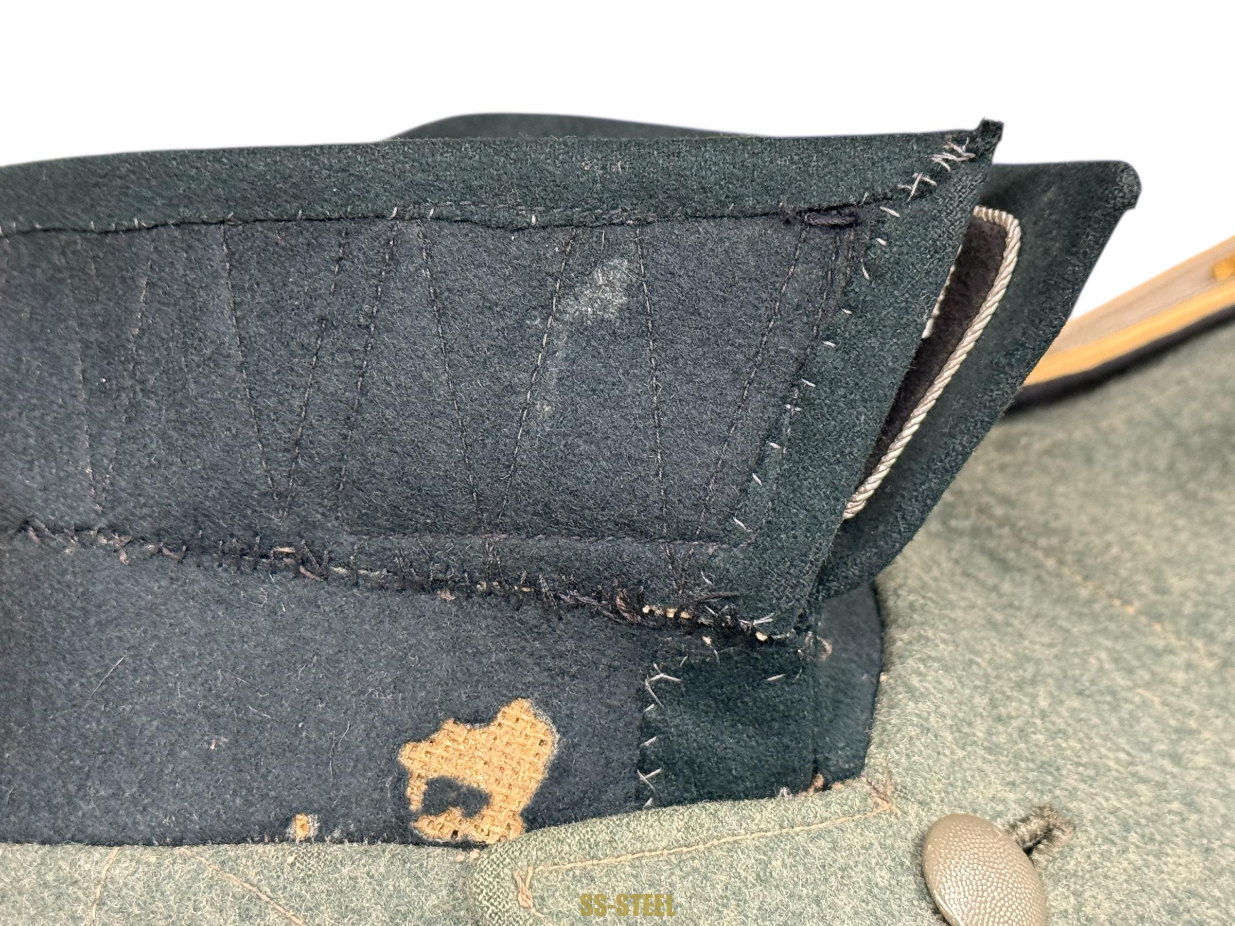 This is a beautiful original example of an early war SS-Ustuf of 1st TV Regiment ,,Oberbayern” tunic. The jacket itself consists of an uber rare 1935 dated Heer cut tunic, showing its characteristic lining style, with the addition of french cuffs and a droop tail collar, commonly seen worn by officers for field operations. The collar tabs are an exquisite matching pair, the skull being the early enlisted pattern totenkopf, piped for an officer upgrade. There are various photos of TK officers wearing their enlisted insignia for field ops. The boards are untouched sew-ins, with rayon cord white piping that has turned an ivory tone with age. The ciphers are “1” for the famous Standarte ,,Oberbayern.” The sleeve eagle is machine applied, and the pattern is an SS-VT later design, just prior to the common RZM pattern coming out. The buttonhole has an EK2 ribbon affixed. There are a few moth hits, mostly in the back, otherwise the tunic is in solid, service worn condition. This piece comes from an advanced collection and all history of the piece available will be provided to the new owner. COA accompanies.