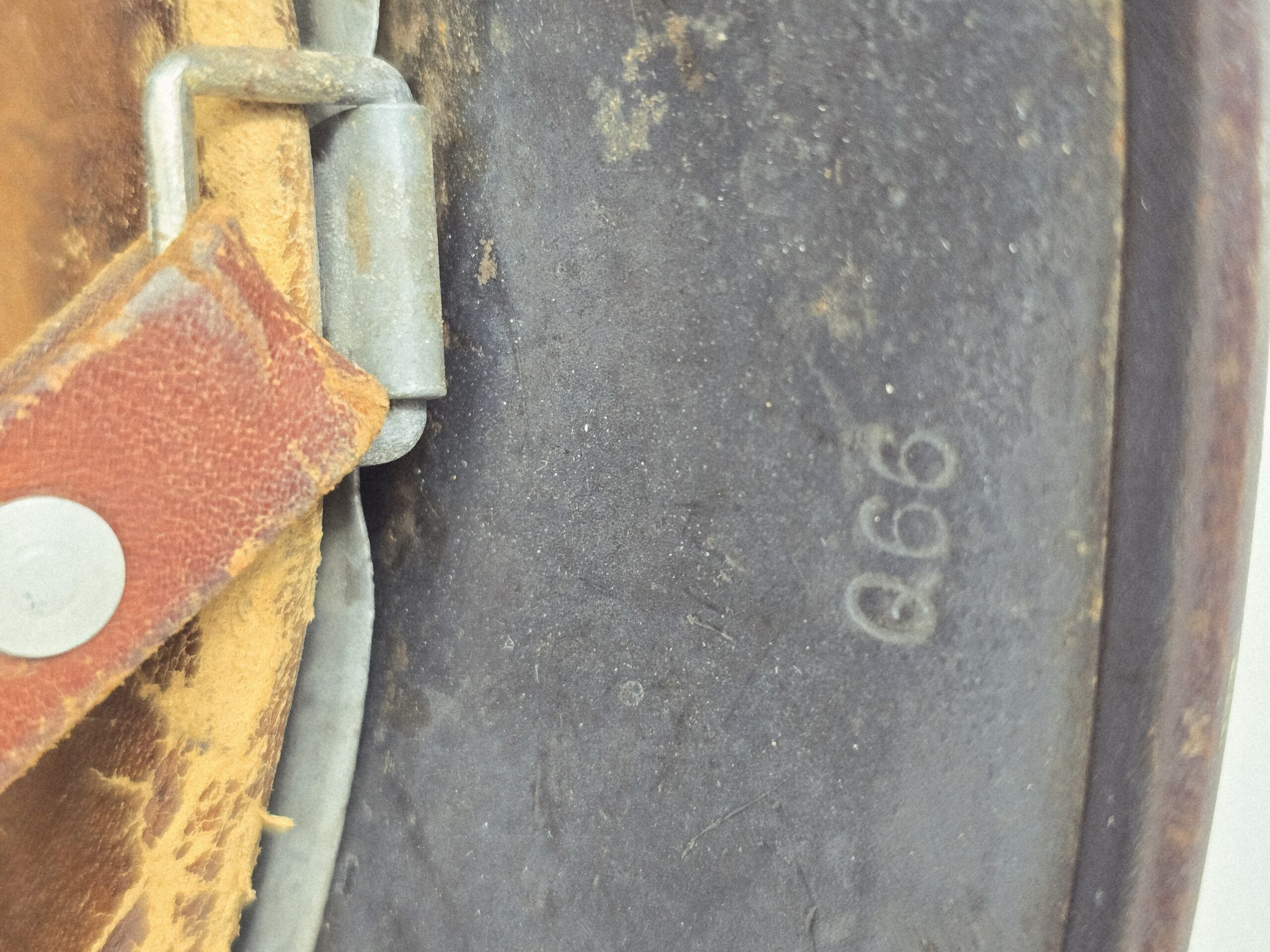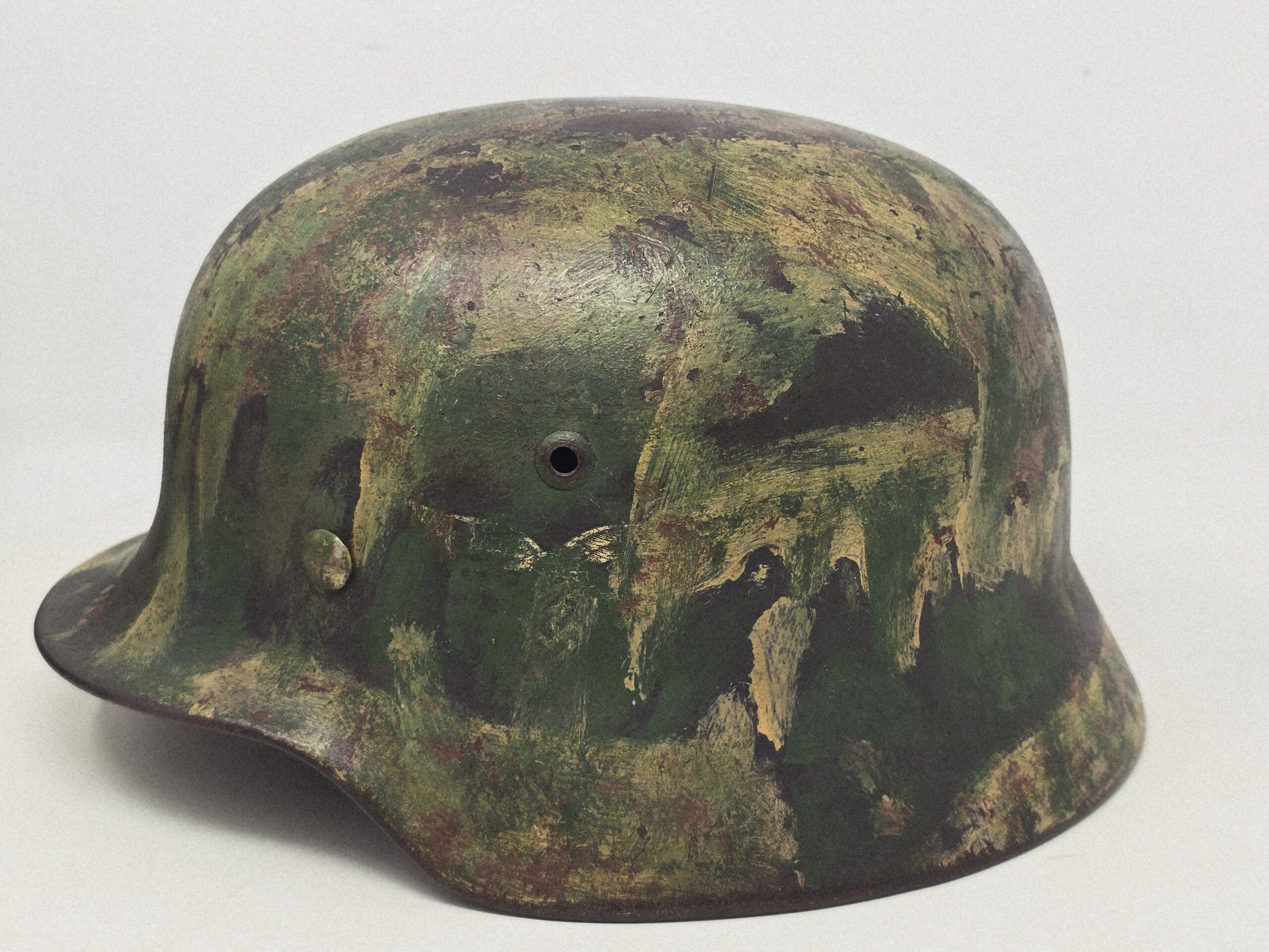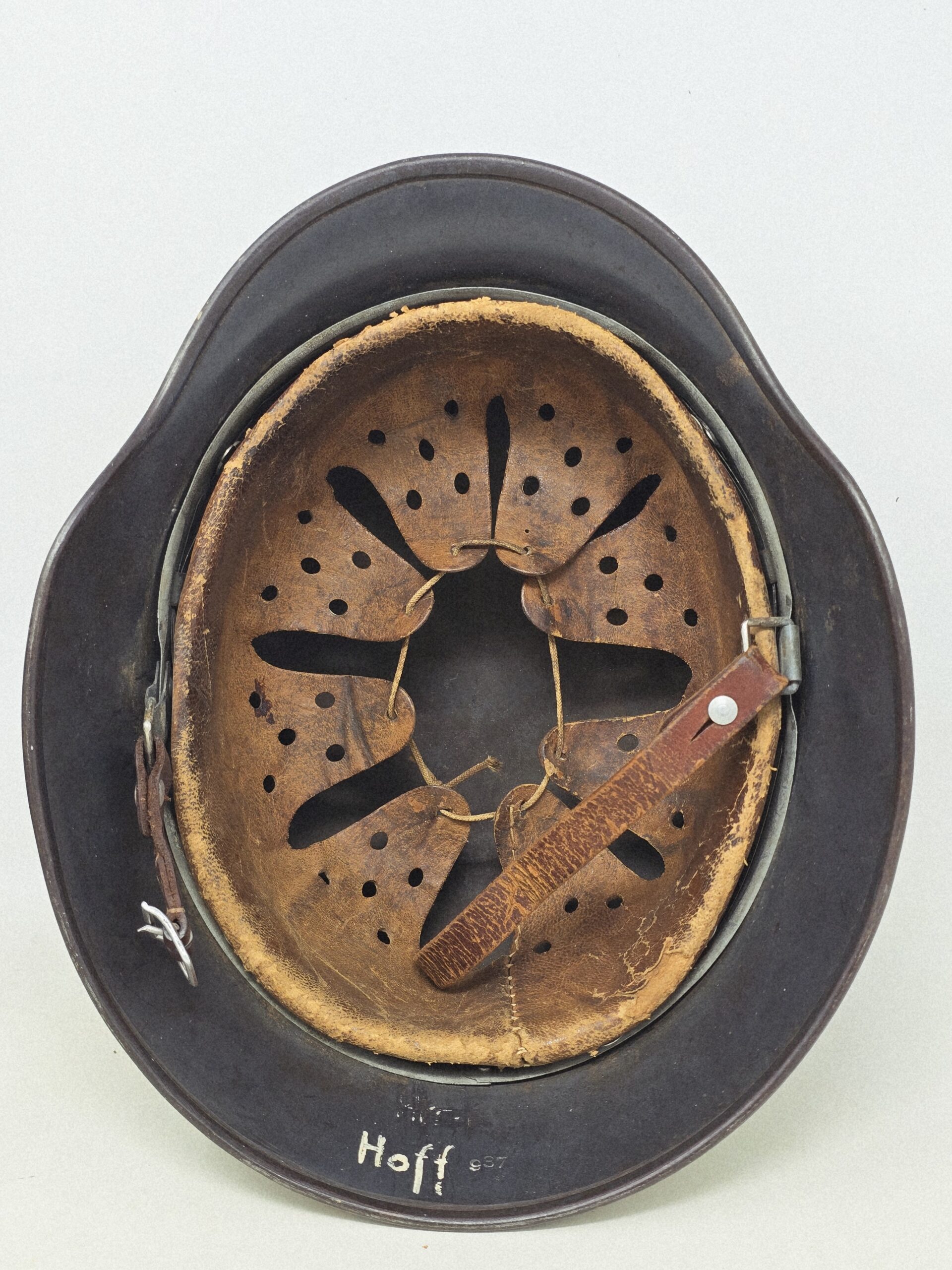 This helmet, from the prestigious Randy Greer camo collection, consists of an M35 Luftwaffe helmet by Quist, size 66, #937. Per the 1940 specifications, the helmet had a reissue M40 type liner installed and was refinished in the reissue schiefergrau. The luftwaffe adler remains visible on the left side. Over the reissue finish is a vivid camo finish of yellow, green and red-brown– the design influenced in a wavy pattern due to having had a band of ‘sinewave’ shaped bailing wire around the sides. The liner is complete and shows medium service wear. The long end of the LW brown chinstrap is partially missing, but everything else is untouched original condition. The name Hoff appears in the rear skirt. All in all a superb, top quality camo example, that would be hard to match. COA accompanies.