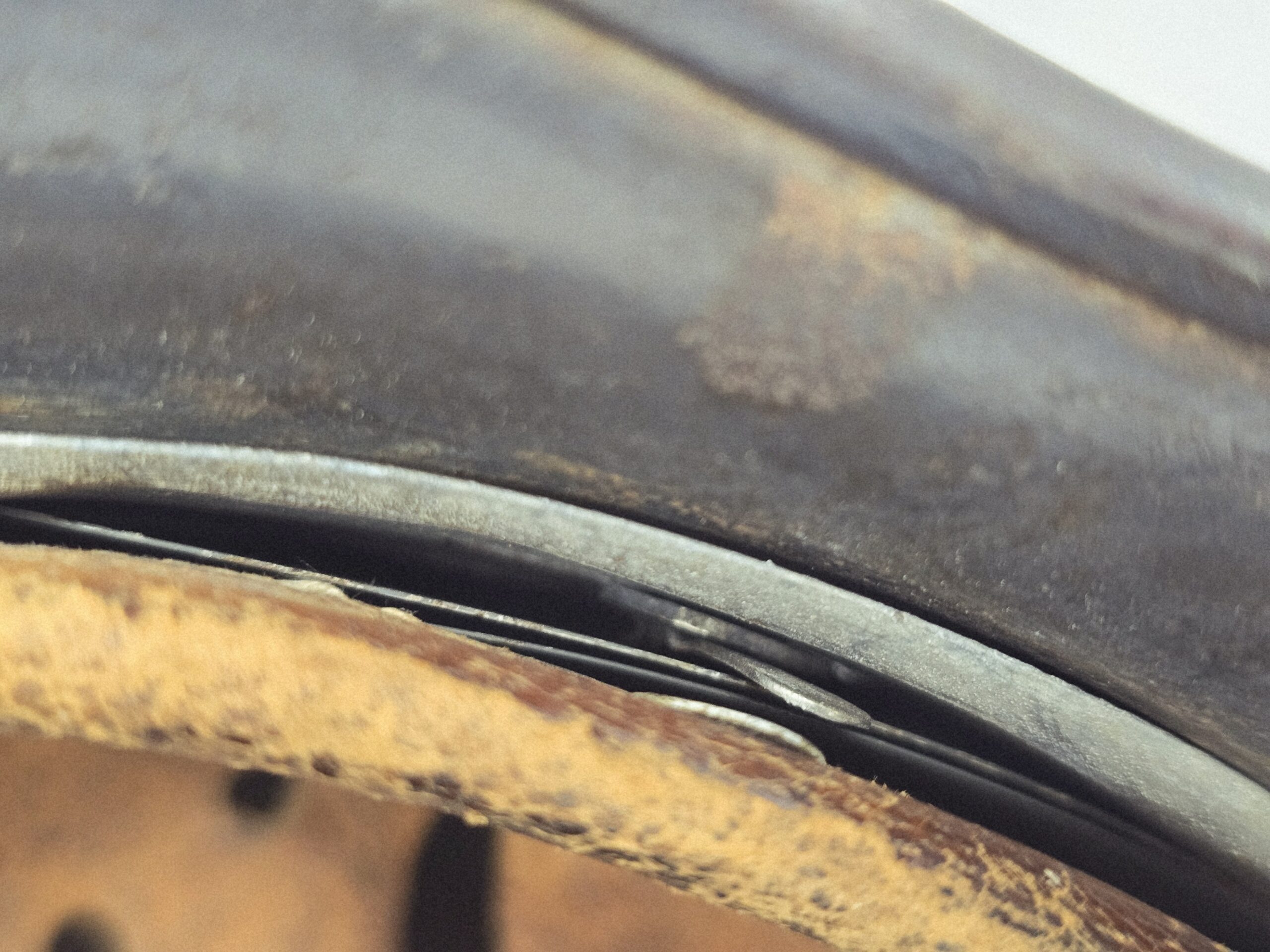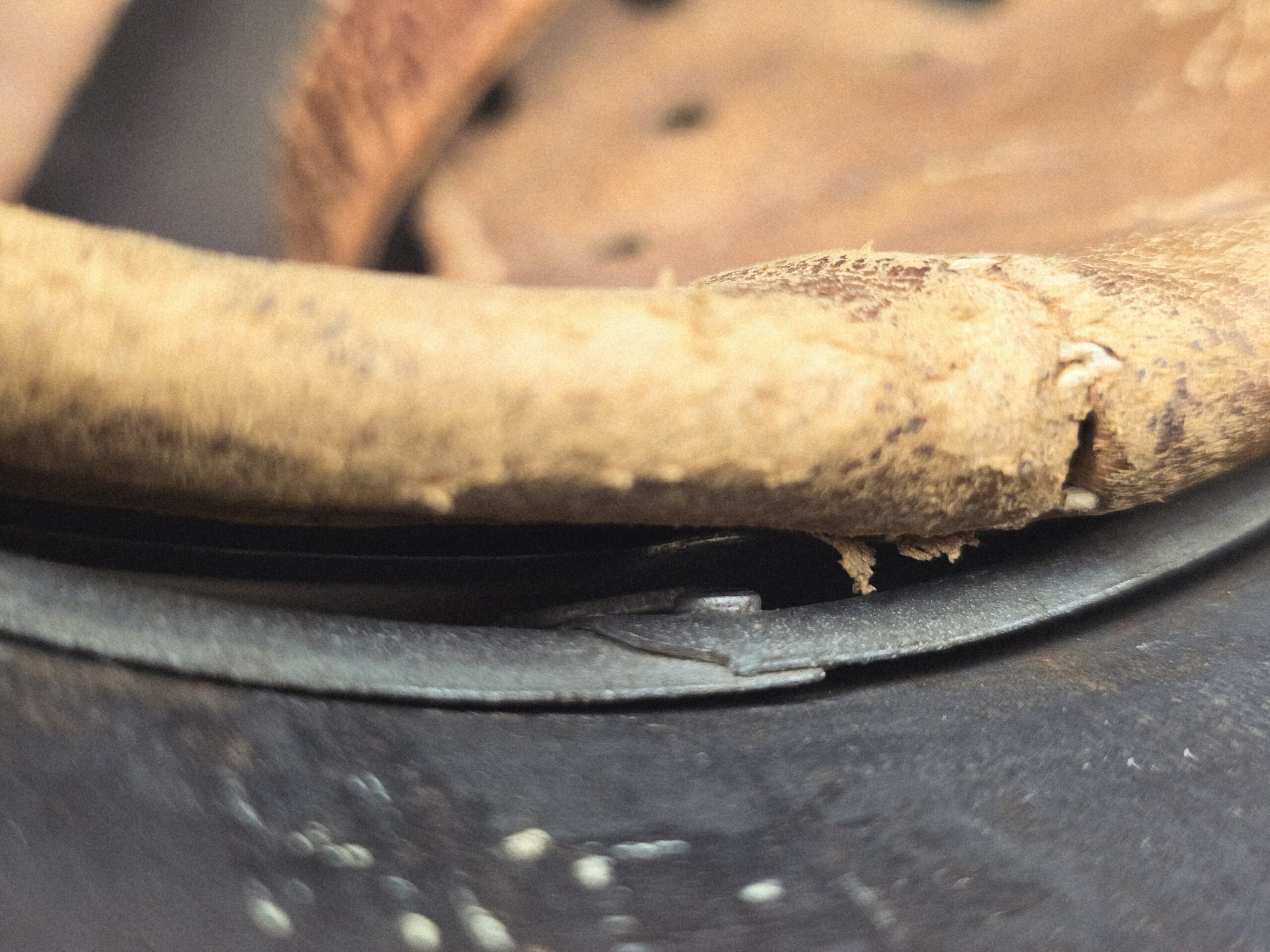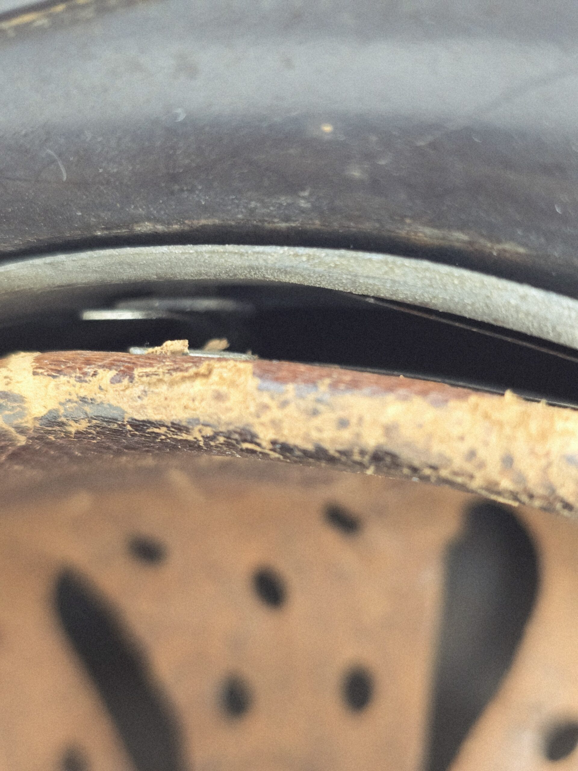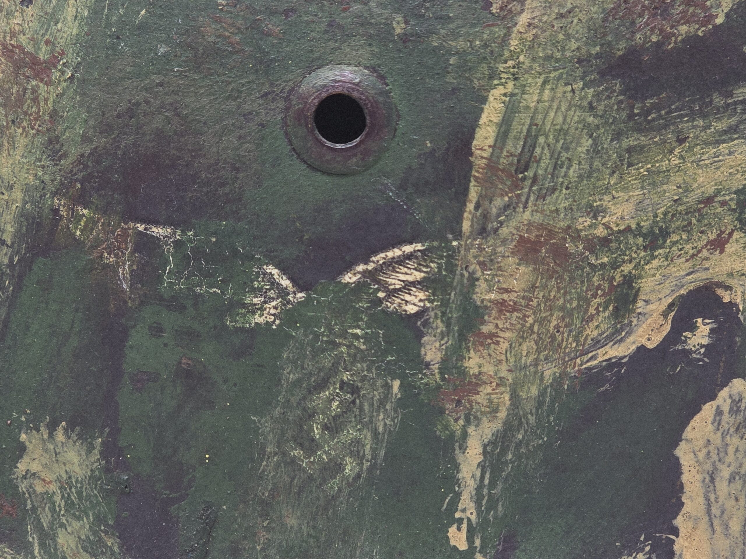 This helmet, from the prestigious Randy Greer camo collection, consists of an M35 Luftwaffe helmet by Quist, size 66, #937. Per the 1940 specifications, the helmet had a reissue M40 type liner installed and was refinished in the reissue schiefergrau. The luftwaffe adler remains visible on the left side. Over the reissue finish is a vivid camo finish of yellow, green and red-brown– the design influenced in a wavy pattern due to having had a band of ‘sinewave’ shaped bailing wire around the sides. The liner is complete and shows medium service wear. The long end of the LW brown chinstrap is partially missing, but everything else is untouched original condition. The name Hoff appears in the rear skirt. All in all a superb, top quality camo example, that would be hard to match. COA accompanies.