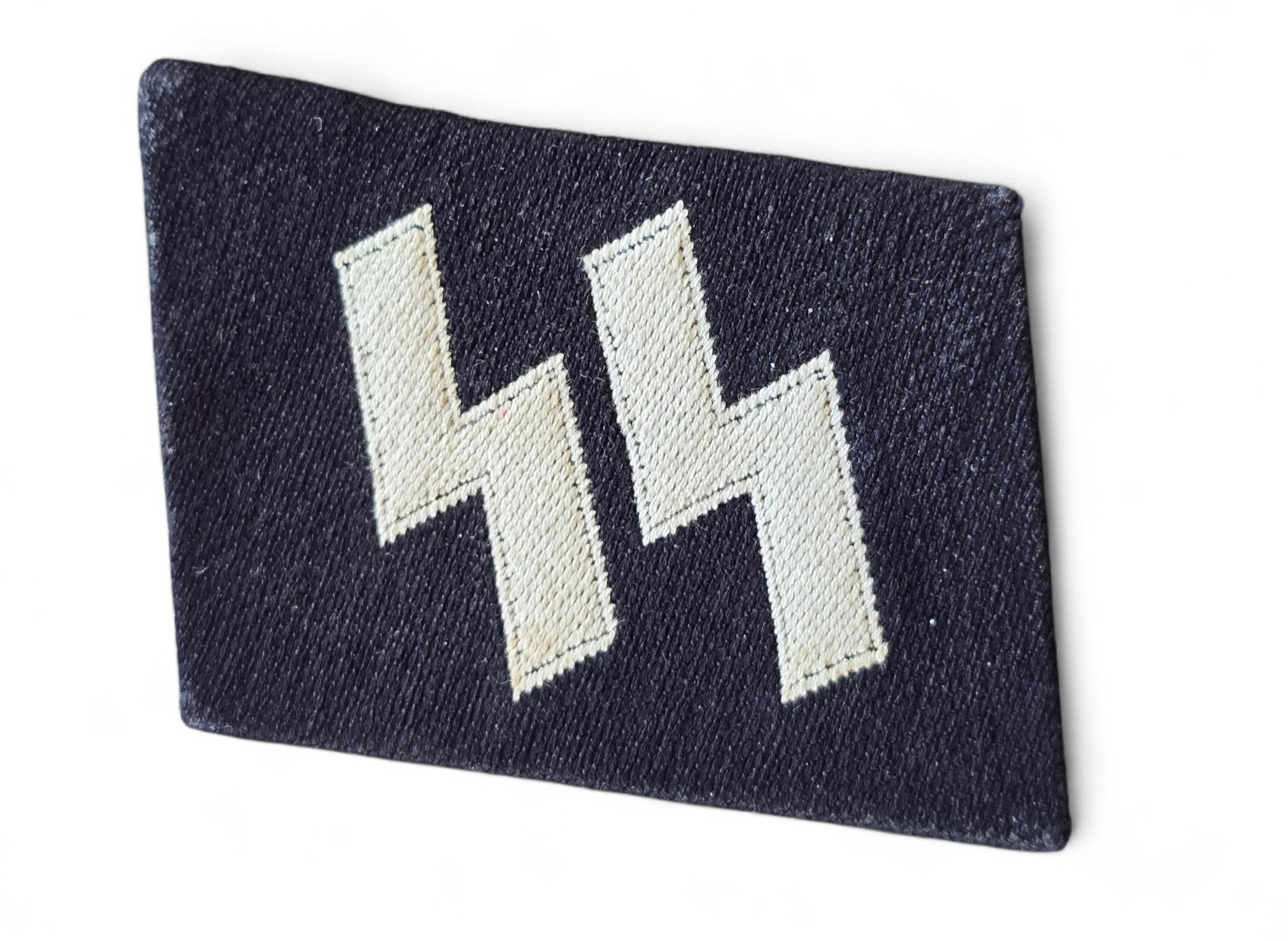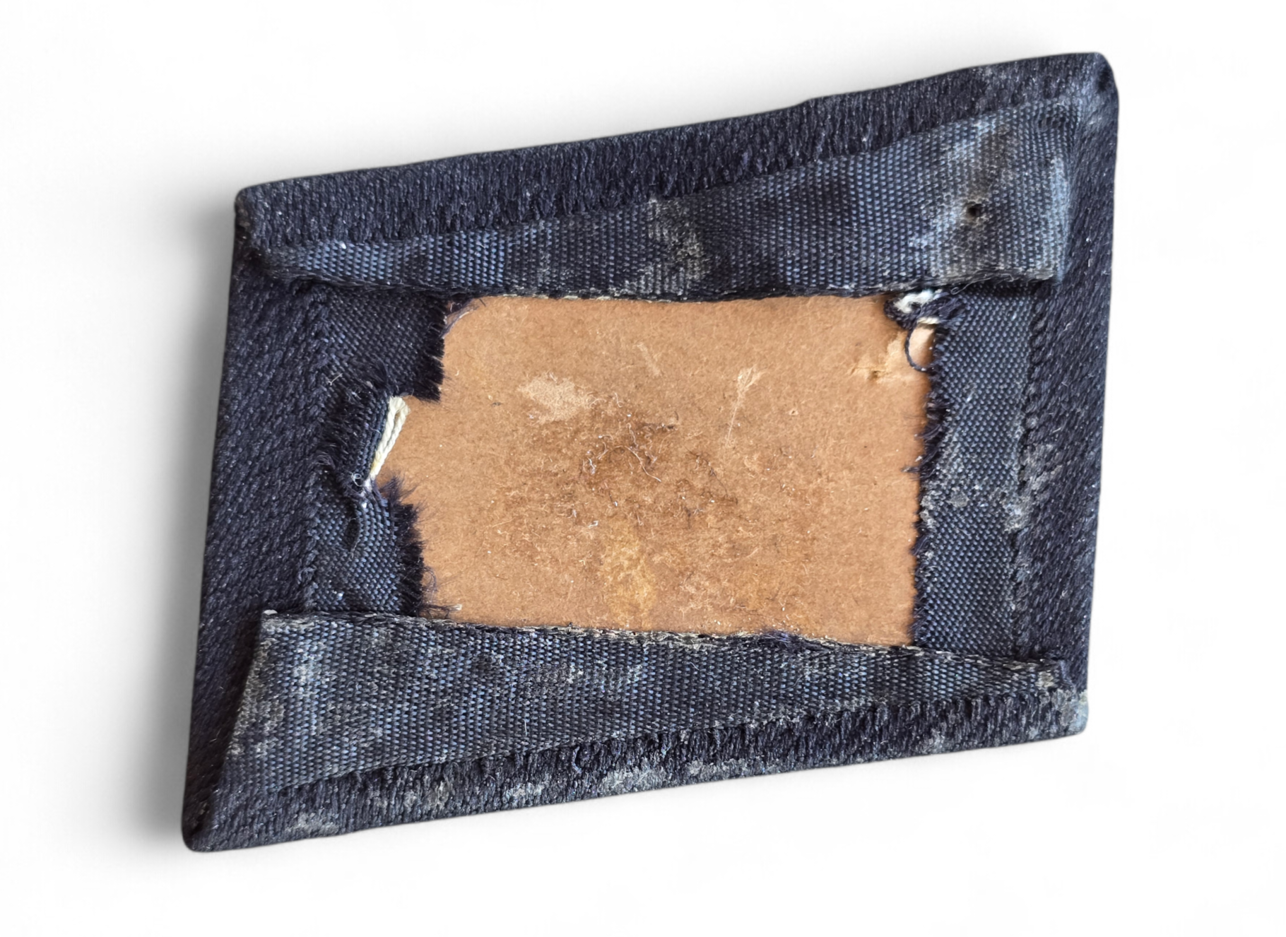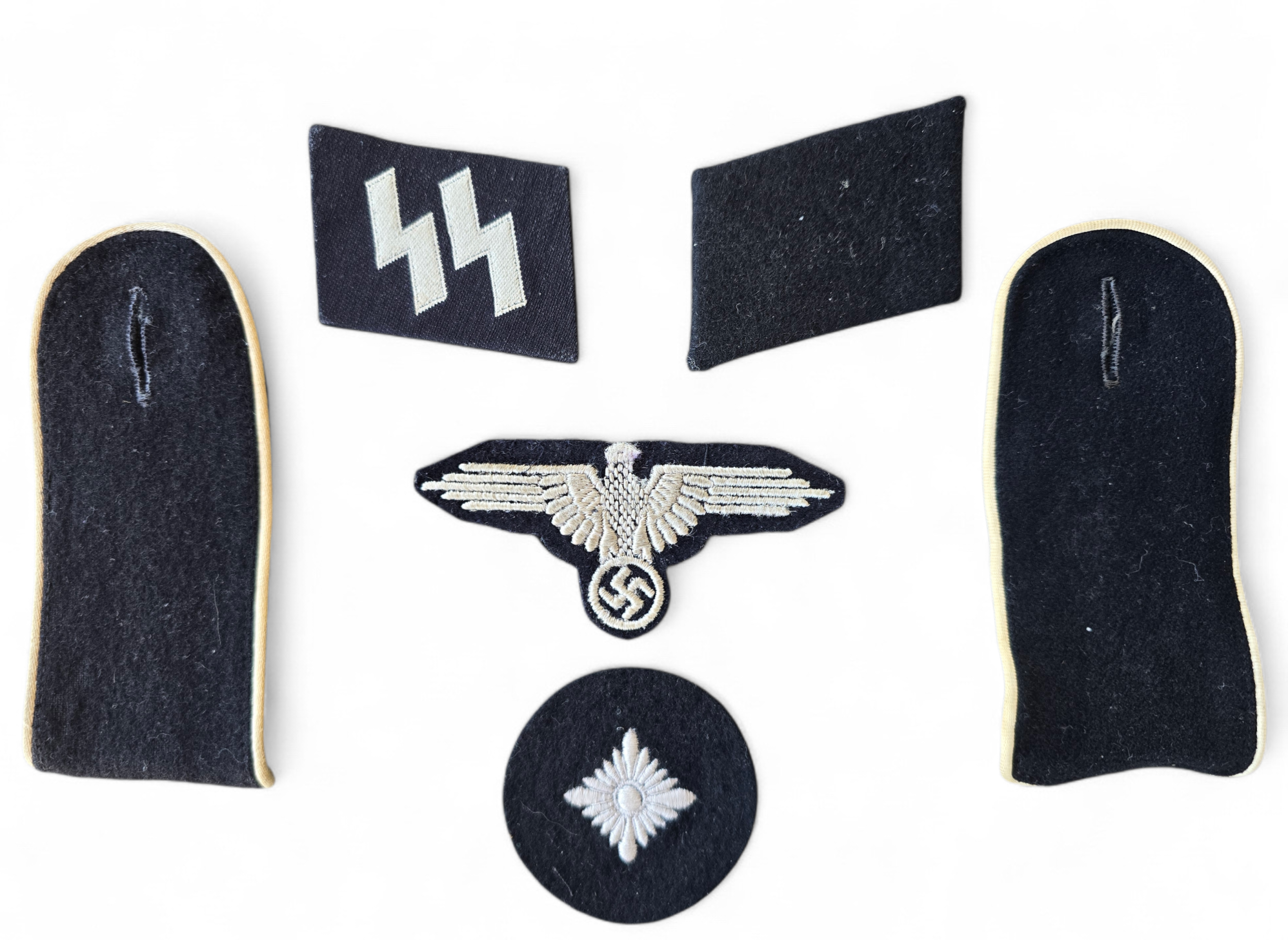 This is an assemblage of later war quality SS Insignia, consisting of a nice Bevo SS runic tab on cardboard backing, accompanied by a non-matching but size matching rank tab. The sleeve eagle is the rzm pattern, and shows a degradation of the embroidery equipment, with a portion of the front of the face of the eagle missing. The boards are a mint example of the last style of shoulder boards, characterized by the missing field gray underlay–  really an excellent set there. Lastly the rank of schutze for the sleeve. Overall a decent grouping great for the late war collection. COA accompanies.