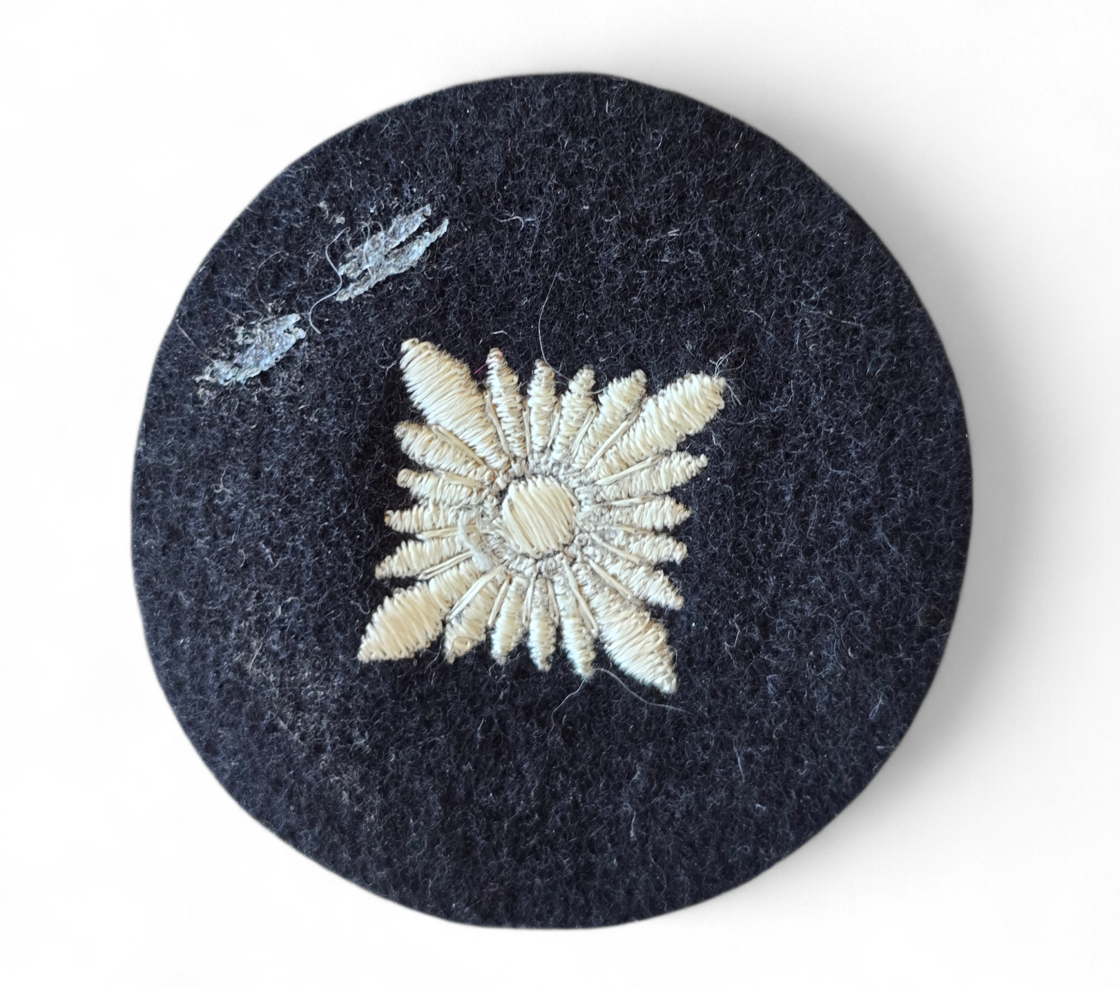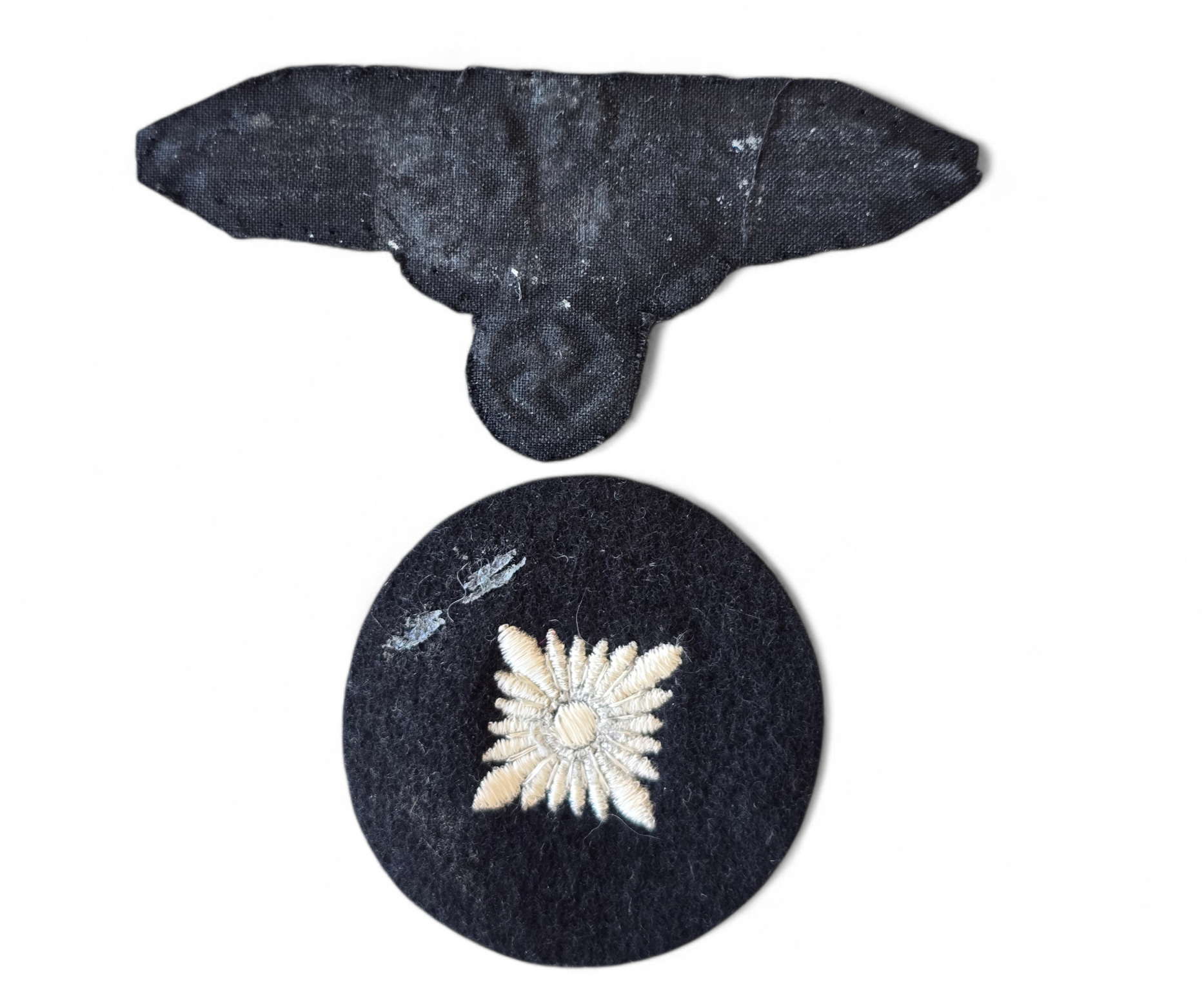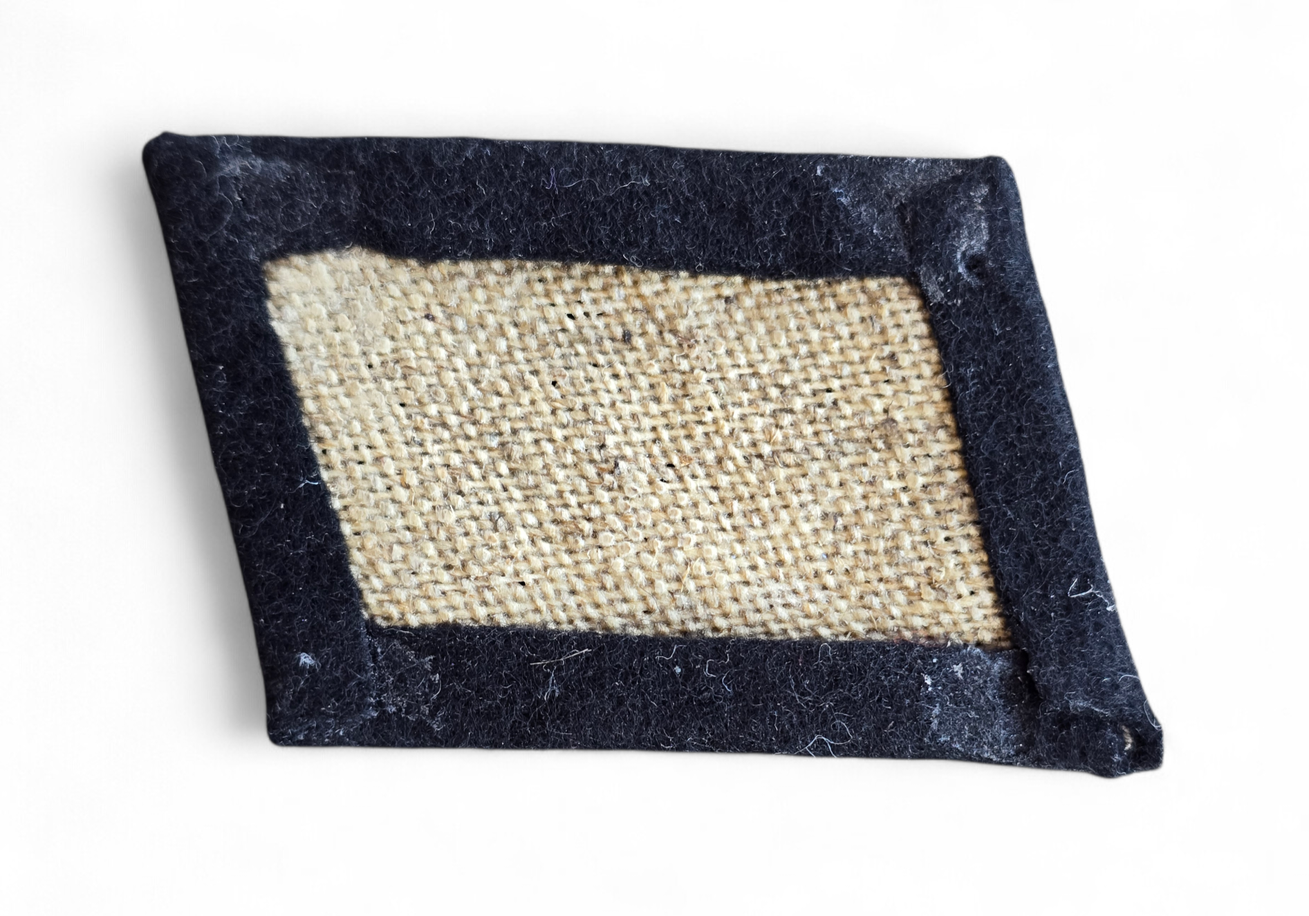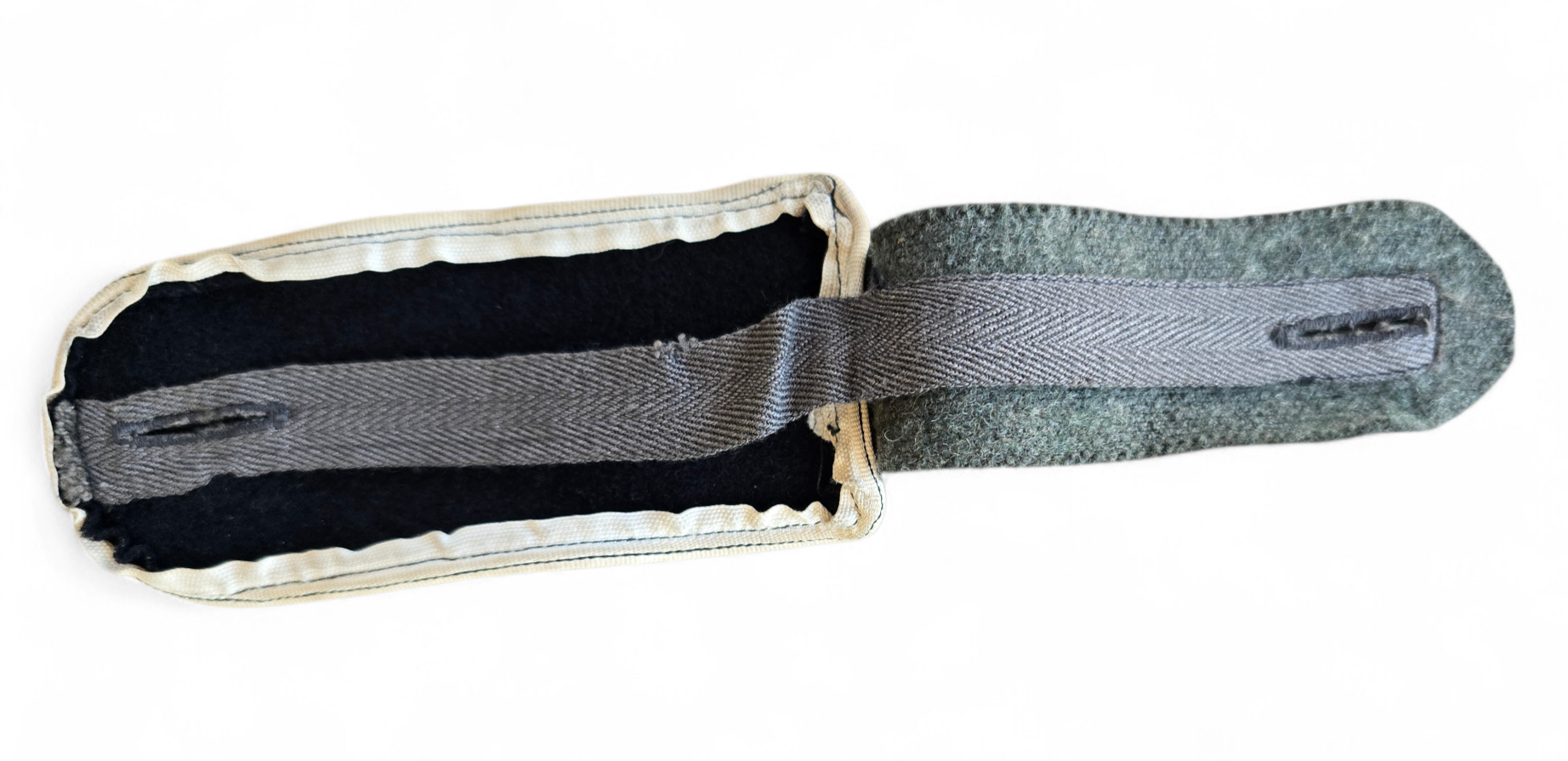 This is an assemblage of later war quality SS Insignia, consisting of a nice Bevo SS runic tab on cardboard backing, accompanied by a non-matching but size matching rank tab. The sleeve eagle is the rzm pattern, and shows a degradation of the embroidery equipment, with a portion of the front of the face of the eagle missing. The boards are a mint example of the last style of shoulder boards, characterized by the missing field gray underlay–  really an excellent set there. Lastly the rank of schutze for the sleeve. Overall a decent grouping great for the late war collection. COA accompanies.