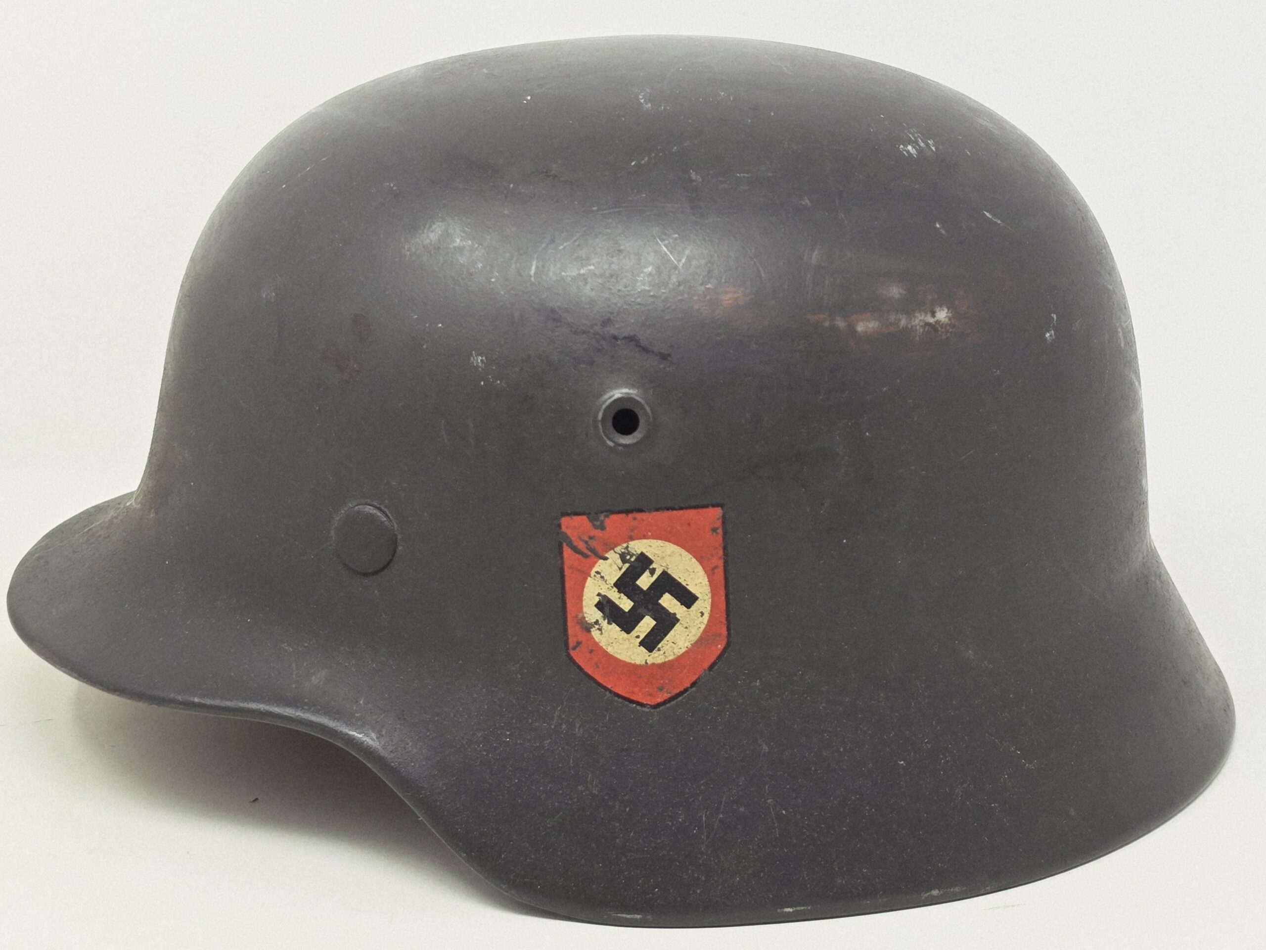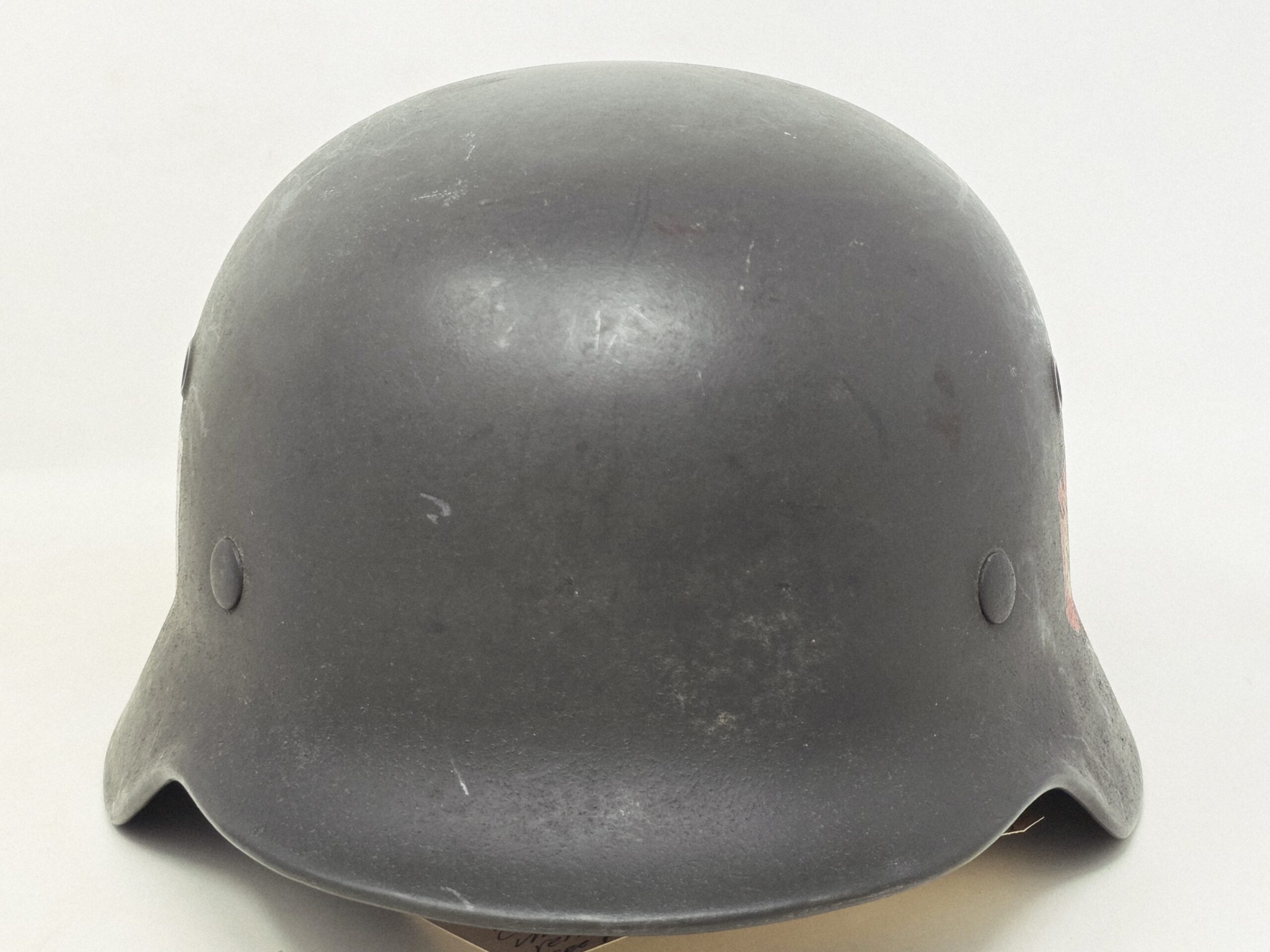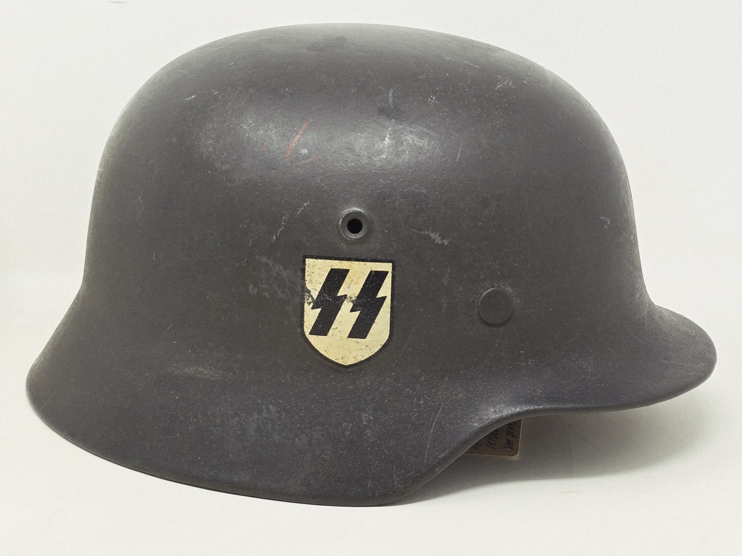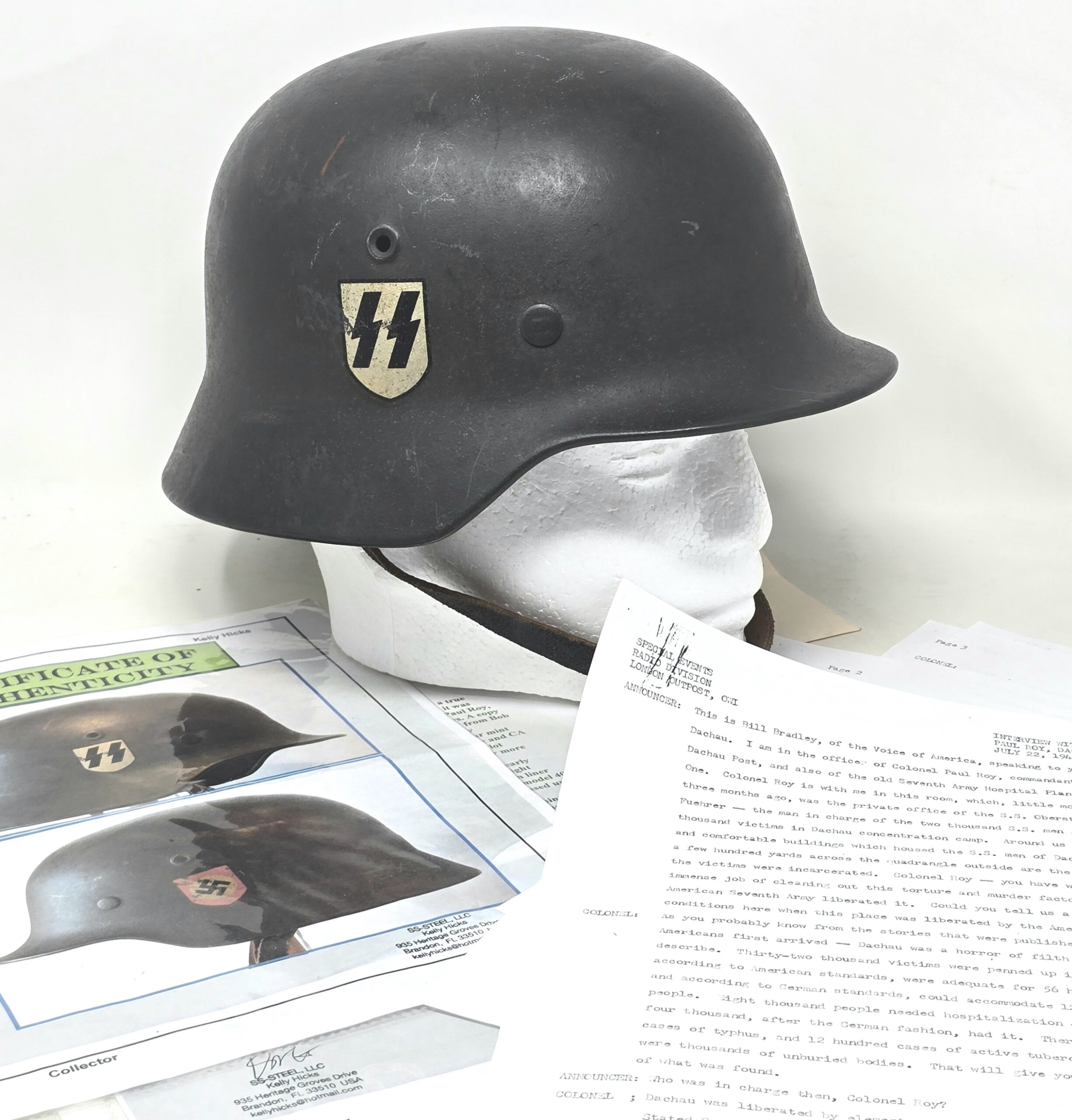 This helmet was one of two brought back by Colonel Paul Roy, US Army, the senior medical officer in charge of the medical rehabilitation of the thousands of Dachau inmates at the time of liberation in 1945. Colonel Roy’s radio interview transcript printout is included with this helmet.