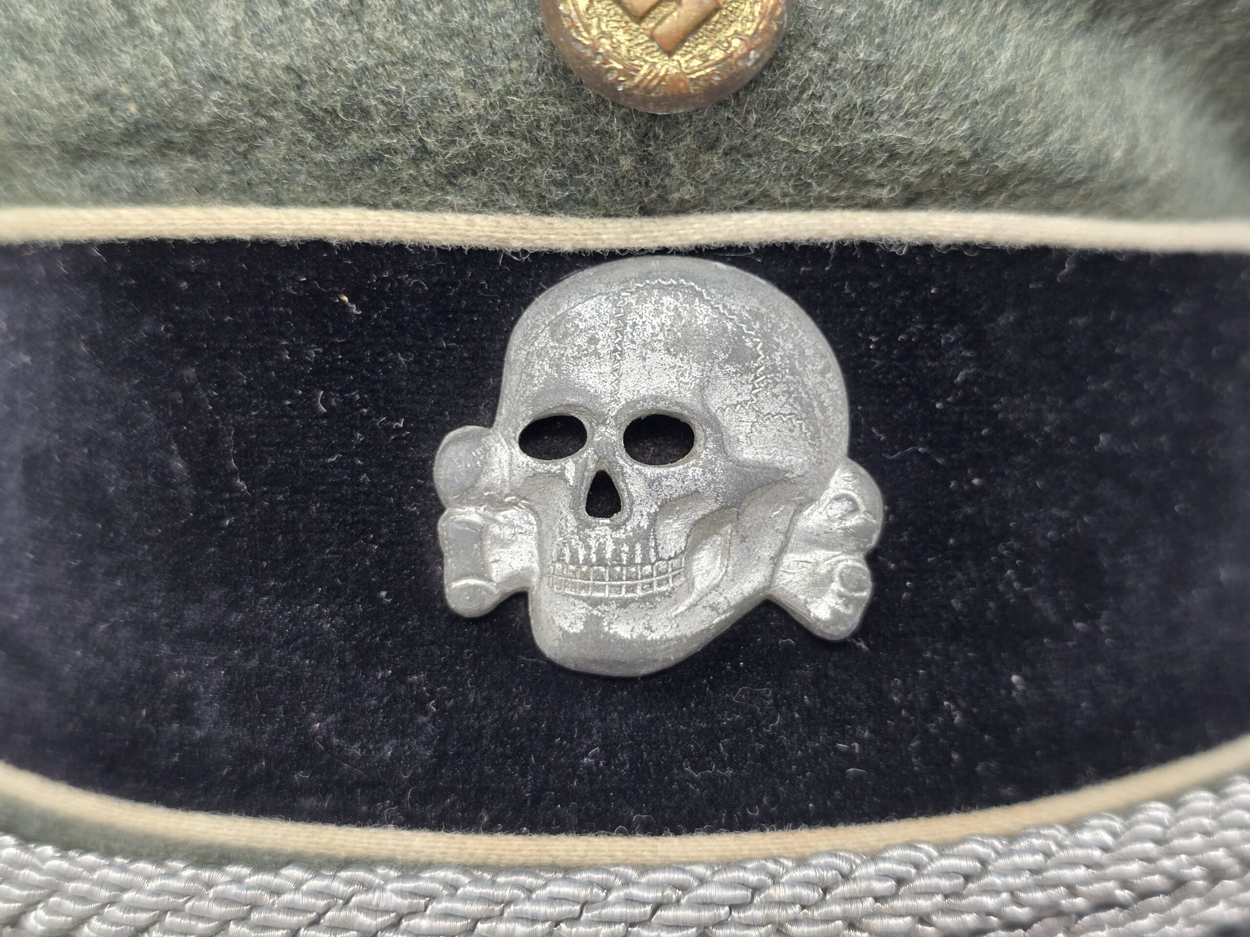 This cap is a classic earlier war officer visor, constructed with the expected lindesamt quality velvet band, imitation cream-colored silk lining, and a more field quality feldgrau wool top. The cap shows moderate service wear overall, with a zinc Overhoff skull and a political eagle replacing the SS eagle. This eagle is sometimes seen in photographs, being worn by SS officers in field situations. A fine looker, great for the combat officer display. COA accompanies.
