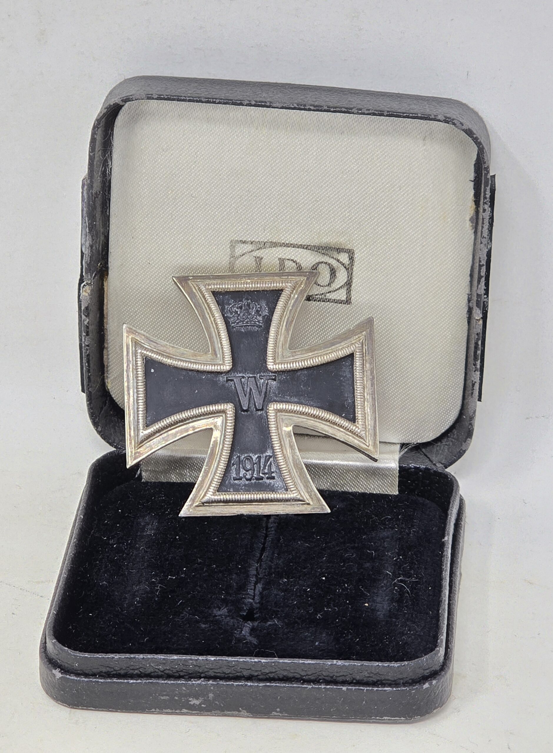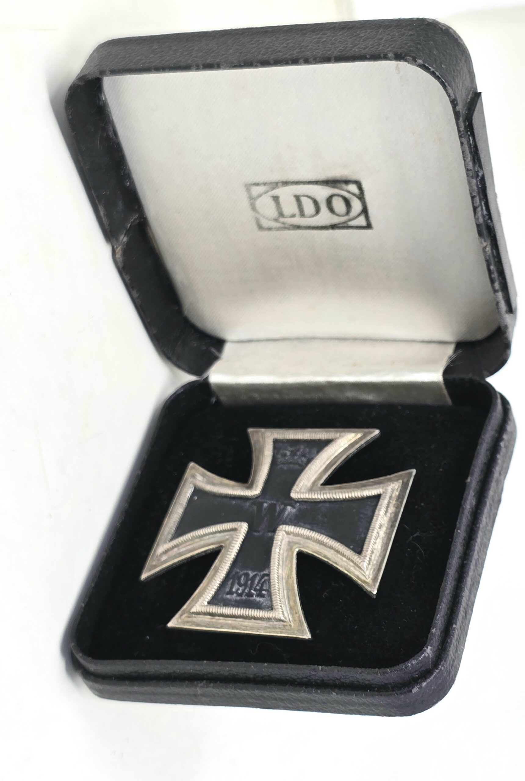 This is a fine vaulted example of the World War I German Iron cross first class. It comes with its original case, which has 3 tape repairs, But is otherwise in sound condition. The box is marked LDO. The cross retains all of its black finish, shows minimal patina and has a high degree of the bright finish to the rear. It is unmarked example, ready for the imperial display.