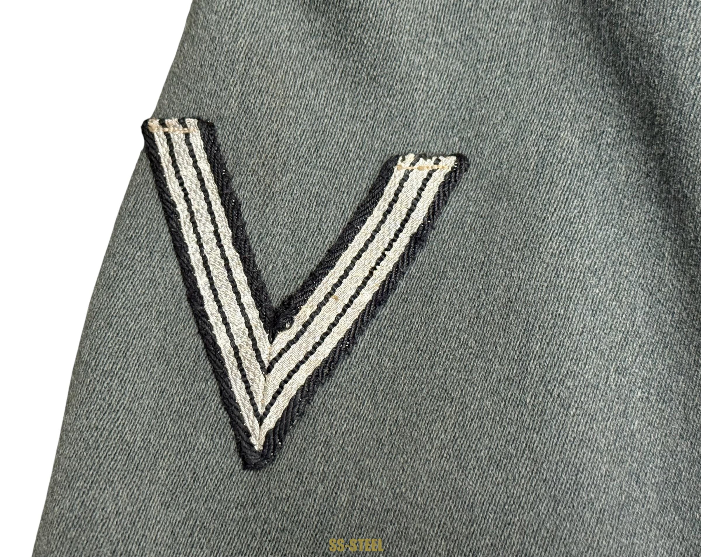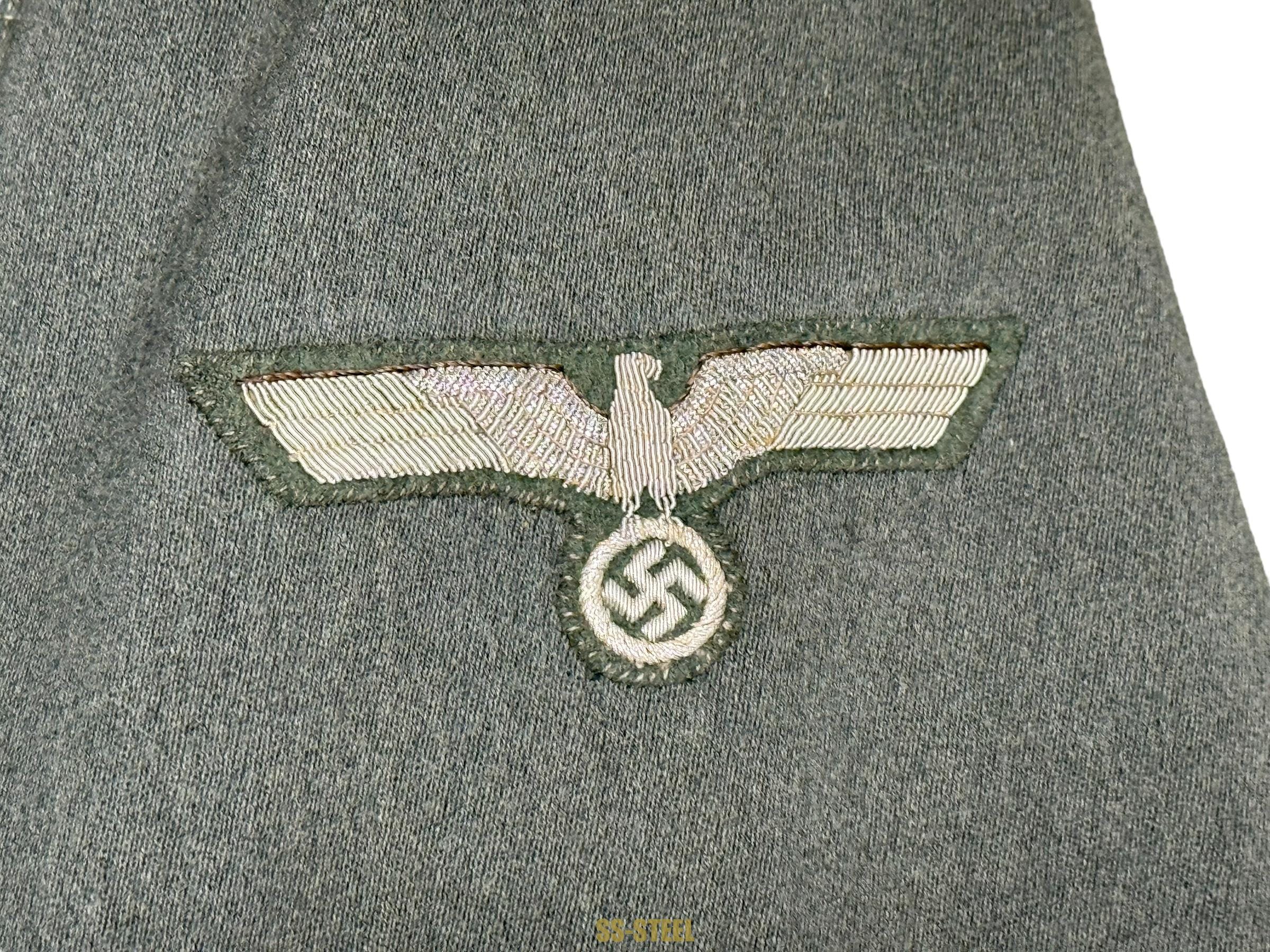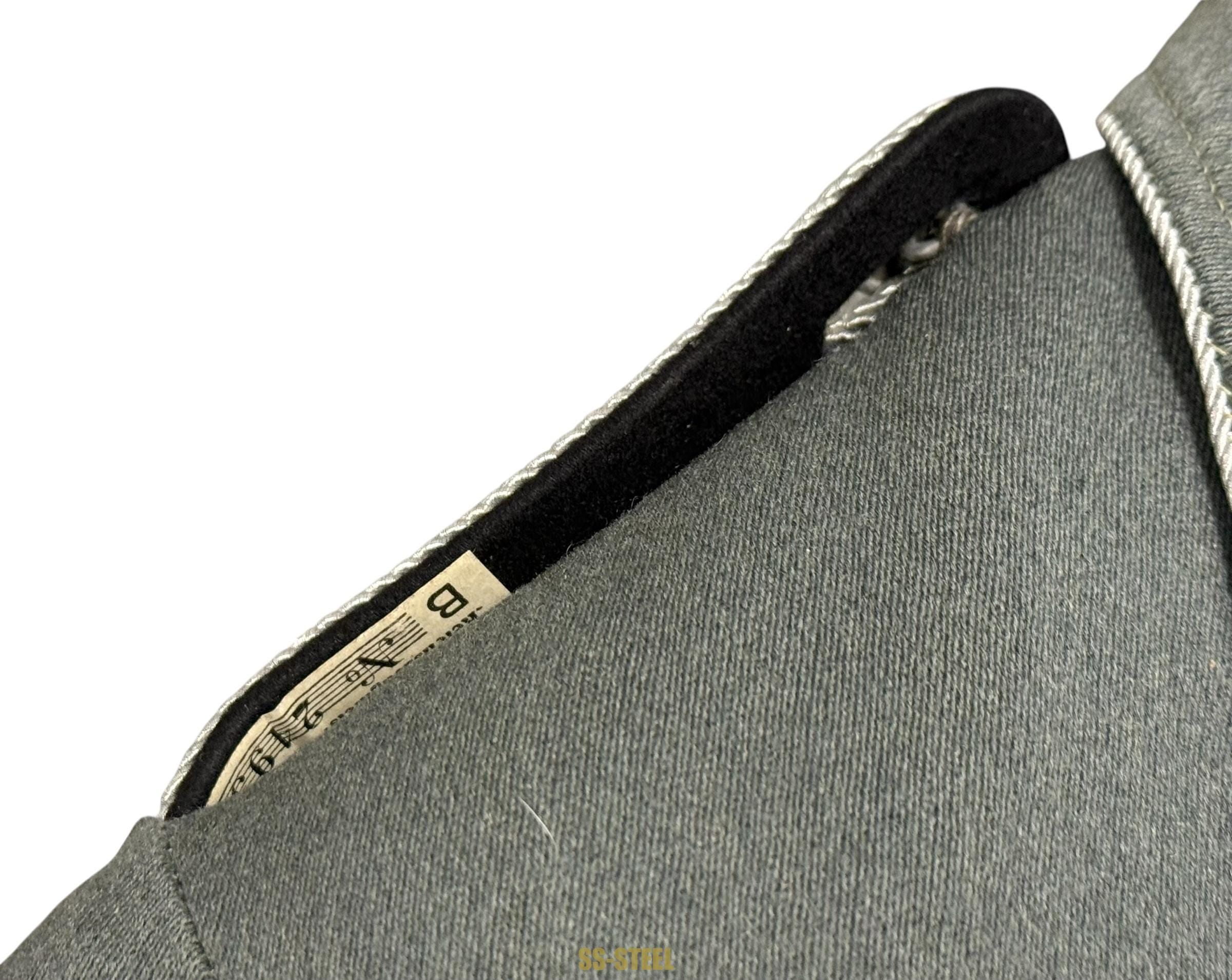 This is a superb quality SD officer’s M36 style uniform jacket, fully originally badged with exquisite quality bullion SD diamond and blank cuff title on the lower left sleeve. Bullion cord SD type shoulder boards and SD / SS-Hauptsturmführer (captain) helped collar tabs and bullion cord edging adorn the collar. A very interesting accent to this piece is the German army officer’s Eagle affixed to the upper left sleeve — instead of the typical SS pattern Eagle. As mentioned, the insignia are perfectly original to the piece, and this Eagle is no exception. The fine stitching, viewed up close, denotes skilled tailor application. And while unusual, this practice was not uncommon among SS who had prior service in the Army. Many, many wartime photographs bear this out. Another interesting note to this tunic also is the statini film movie studio stamping in the interior, including one in the sleeve lining, which present a timestamp of originality to this tunic, that it was in Czechoslovakia when the war ended and was kept there for use in movies and films for propaganda purposes. As most collectors / historians know, there were depos full of SS items left over in what is now Czech Republic. And the former Communist government used these in many cases as props for World War II period movies– with original items. When the wall came down in the early ’90s, many of these items sold out to the west and became premier items in collections. This is no exception. It is the one finest SD officer’s garments I have seen and is worthy of the finest SS uniform collection. COA accompanies.